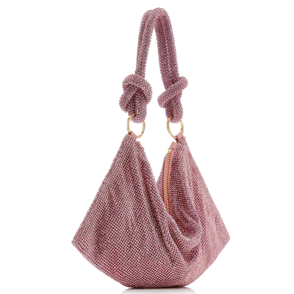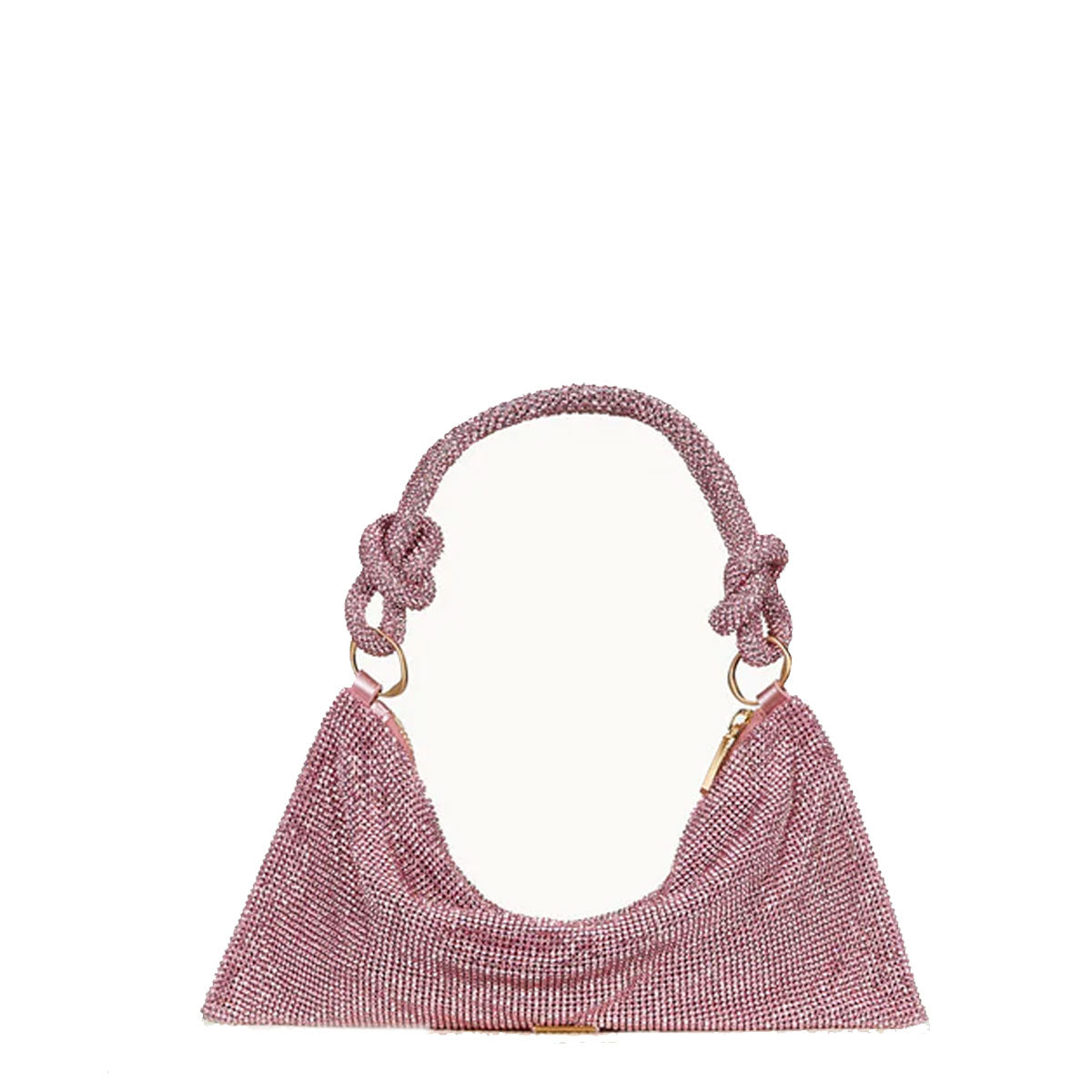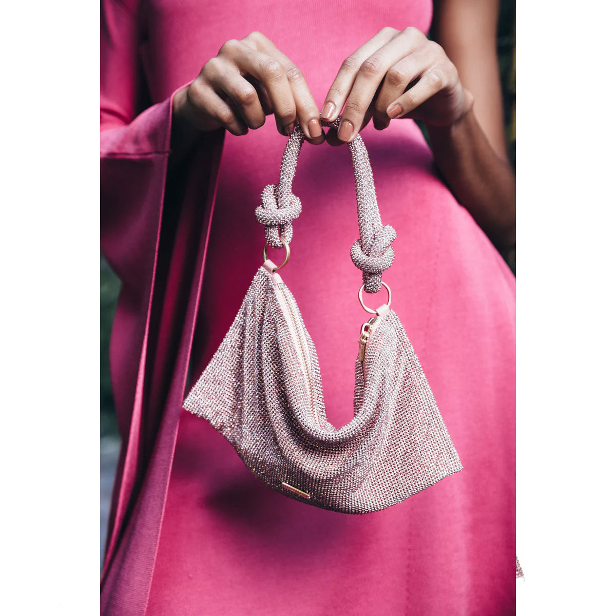 The Hera Shoulder, now available in an even smaller Nano. Crafted from eye-catching rhinestone that give a metallic silver shine, this classic design exudes femininity and grace with a knotted shoulder strap and a gorgeously slouchy silhouette. The frosted handheld bag is the perfect addition to add some Gaia sparkle to your life. Please note this size is much smaller than the Mini.