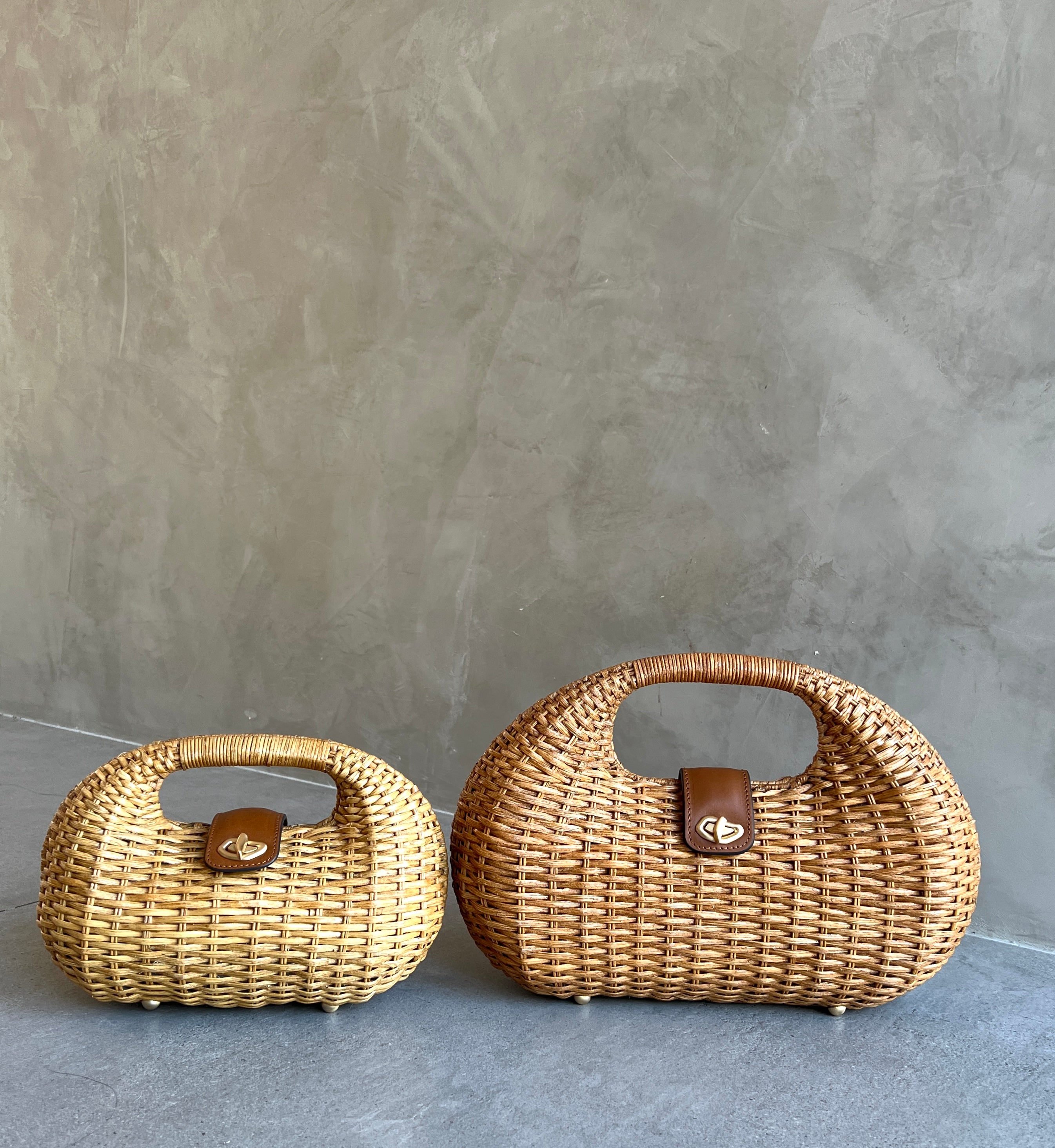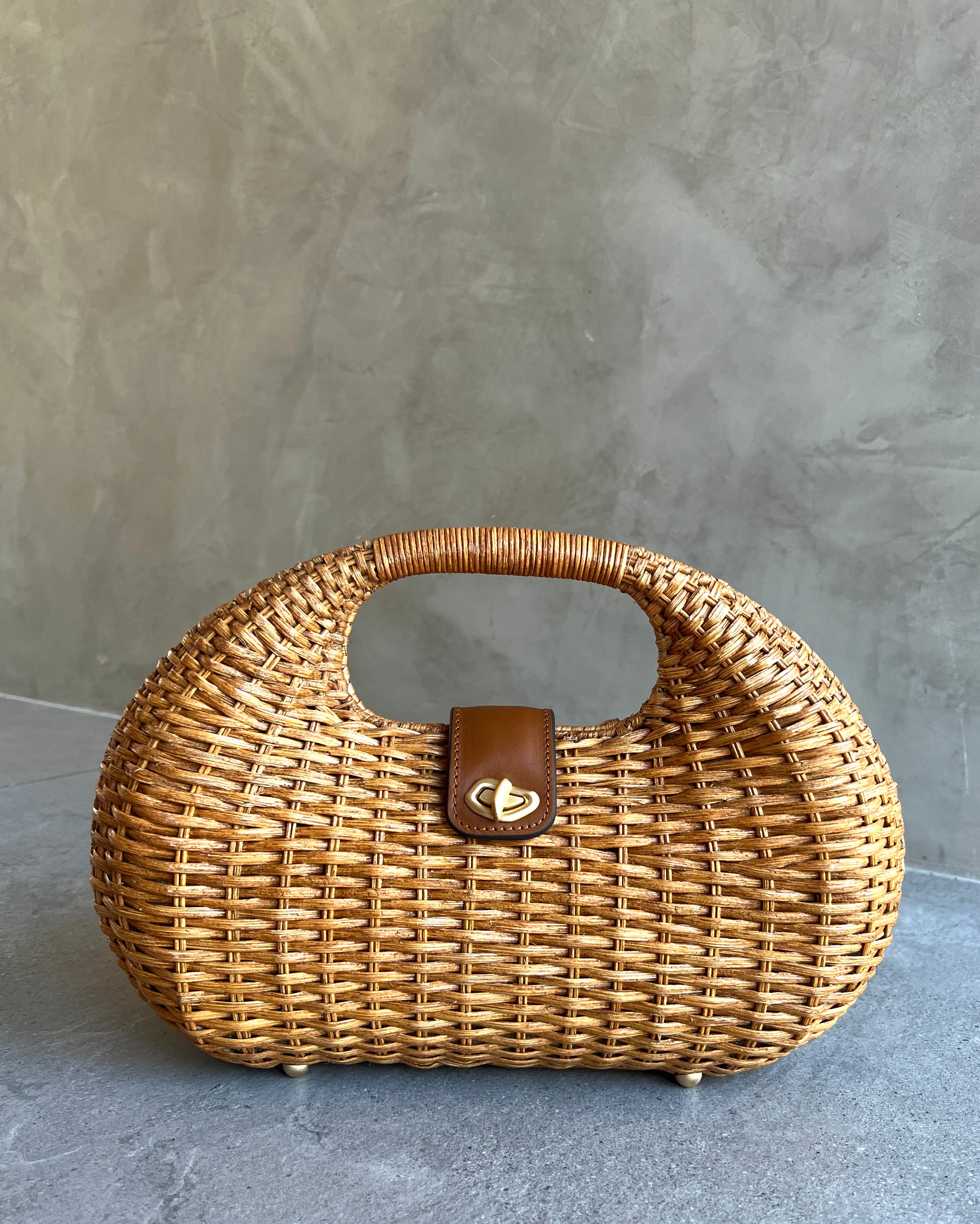 Lydia top handle bag in woven rattan featuring turn lock detail.