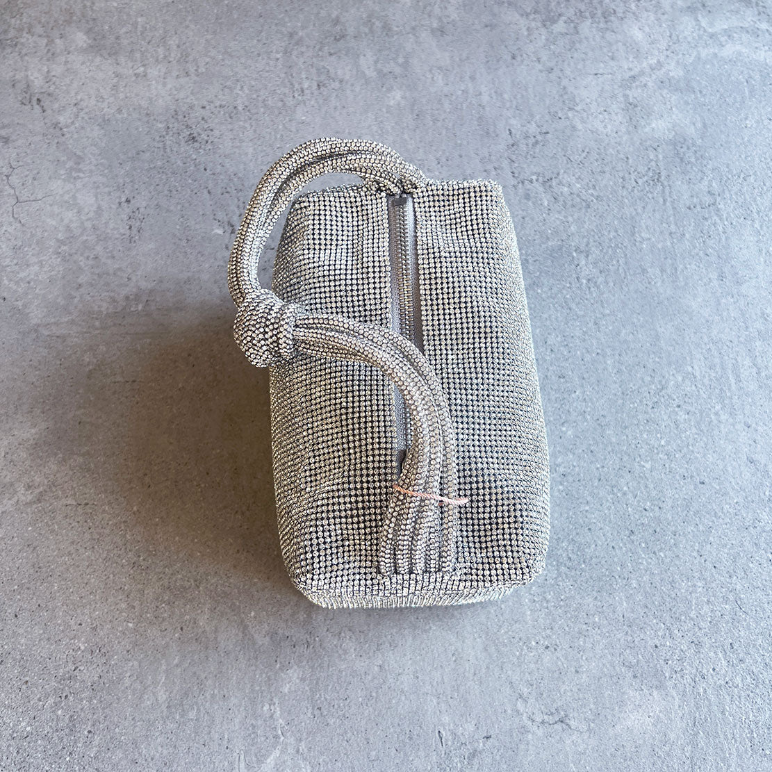 Sienna is an eye-catching mini sized top handle bag designed with glimmering 2mm rhinestone mesh. She features a rhinestone corded handle with a top knot detail. The textured handle is balanced by her relaxed boxy frame. She’s big enough to hold all your essentials and a silver-toned metal zipper with Cult Gaia logo keeps your essentials safe.