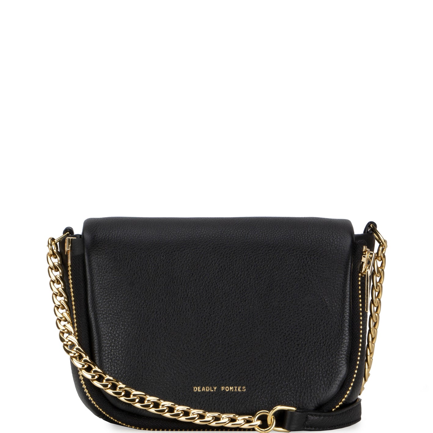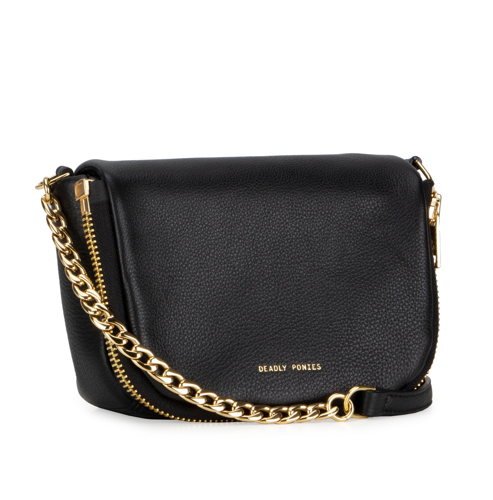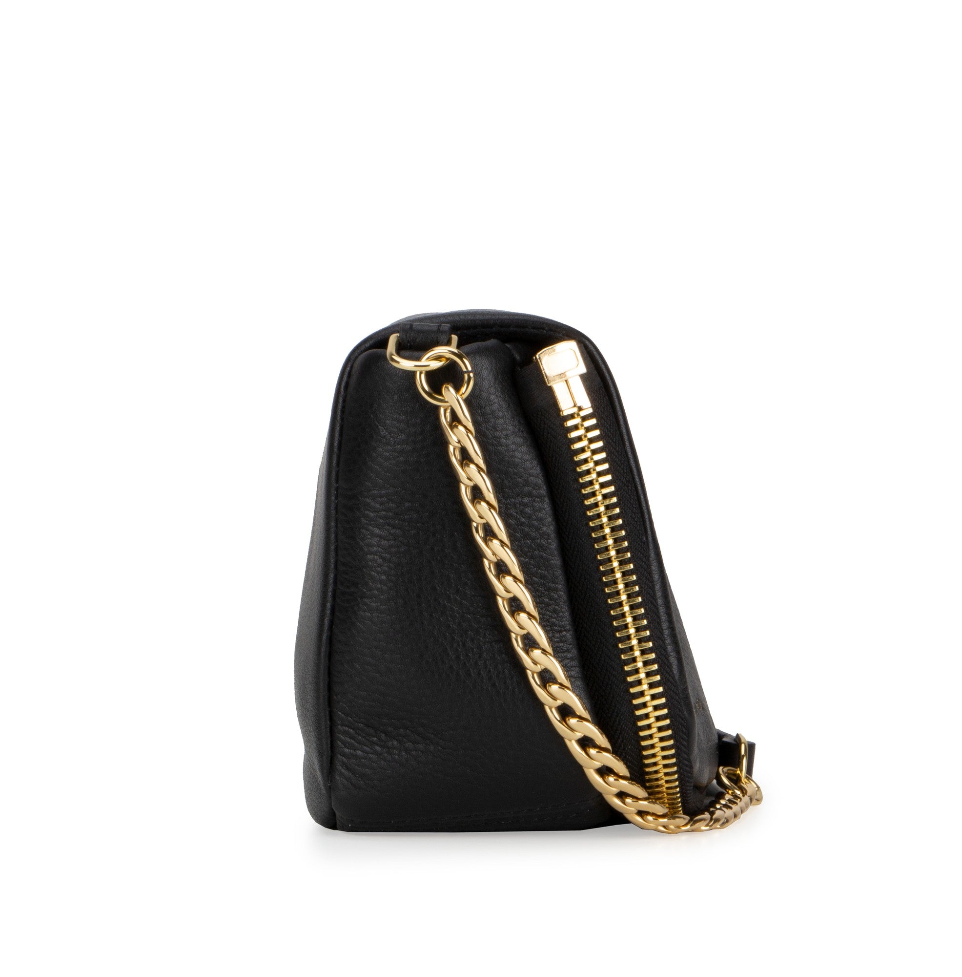 Soft deer skin shoulder pouch with a zipper flap, an interior pocket and adjustable leather and brass chain strap.