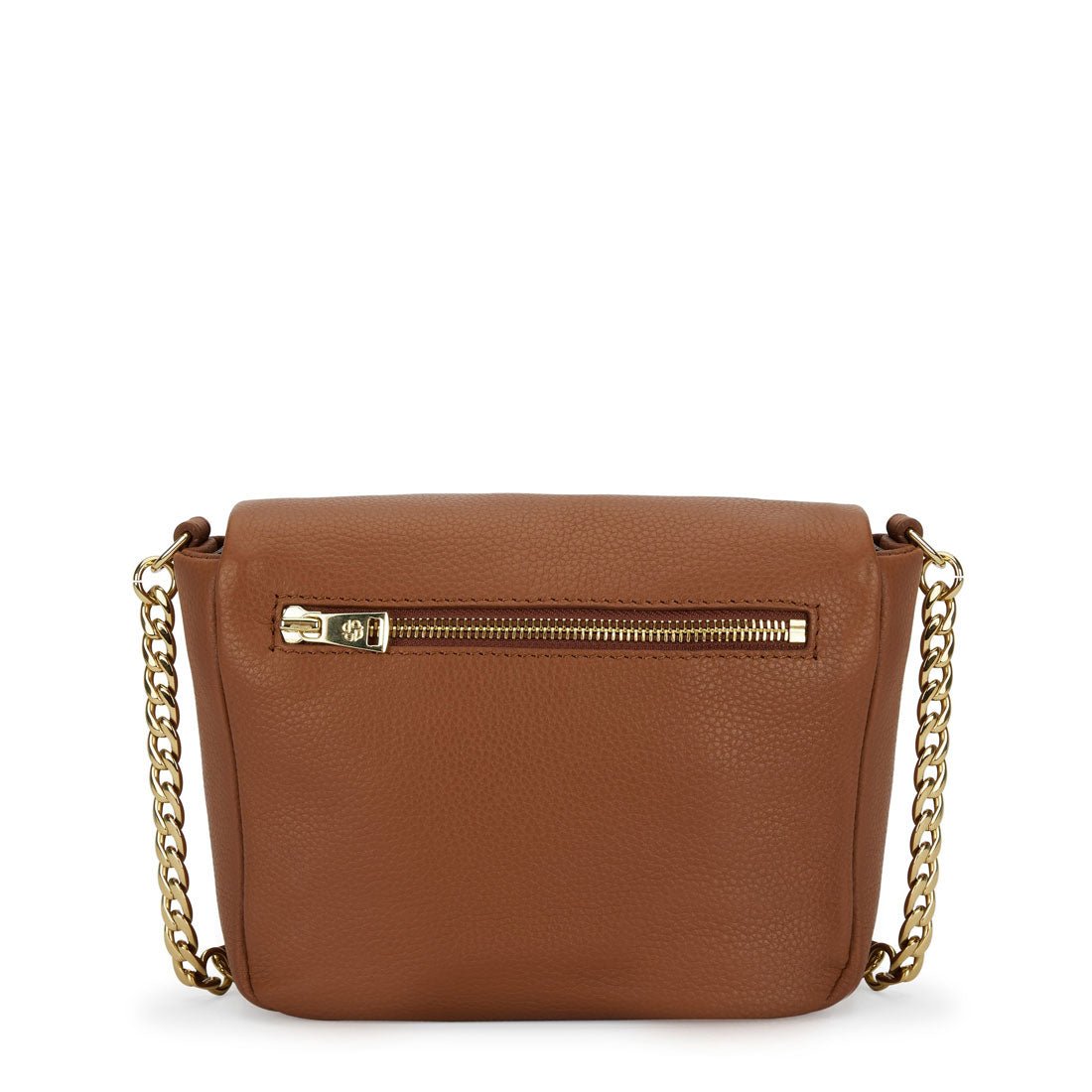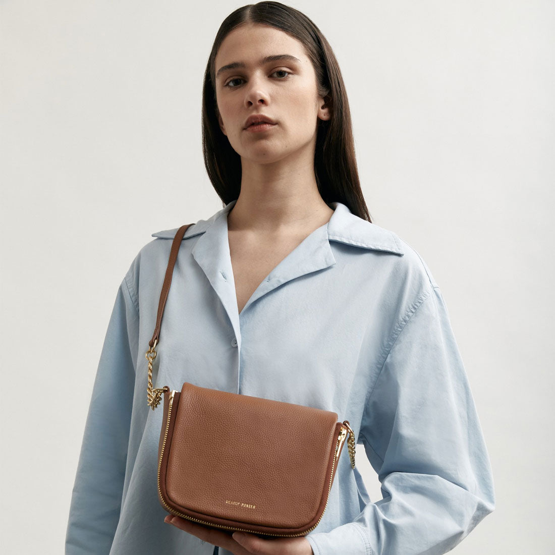 Soft deer skin shoulder pouch with a zipper flap, an interior pocket and adjustable leather and brass chain strap.