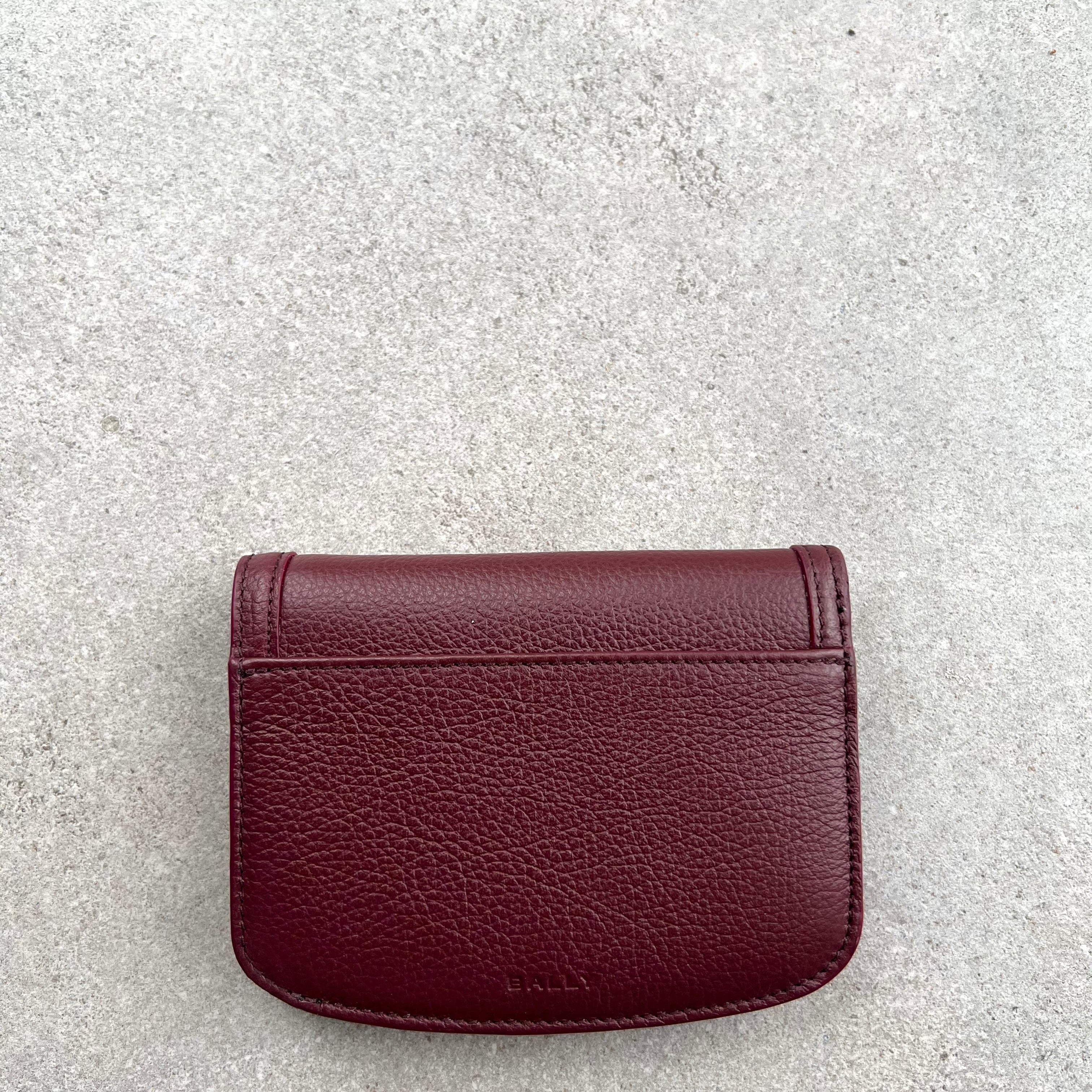 This Deco wallet in black calfskin features a simple metal plaque detailed with three engraved lines to recall the Bally Ribbon. On the inside, multiple compartments keep cash, coins and cards organized.