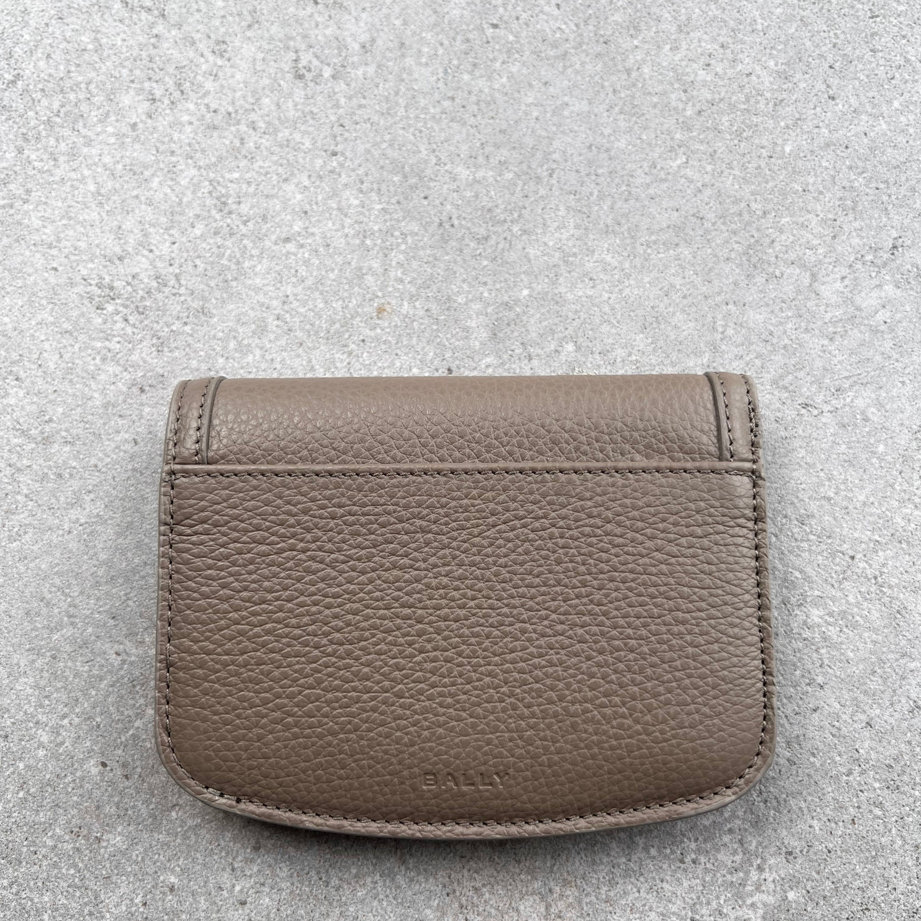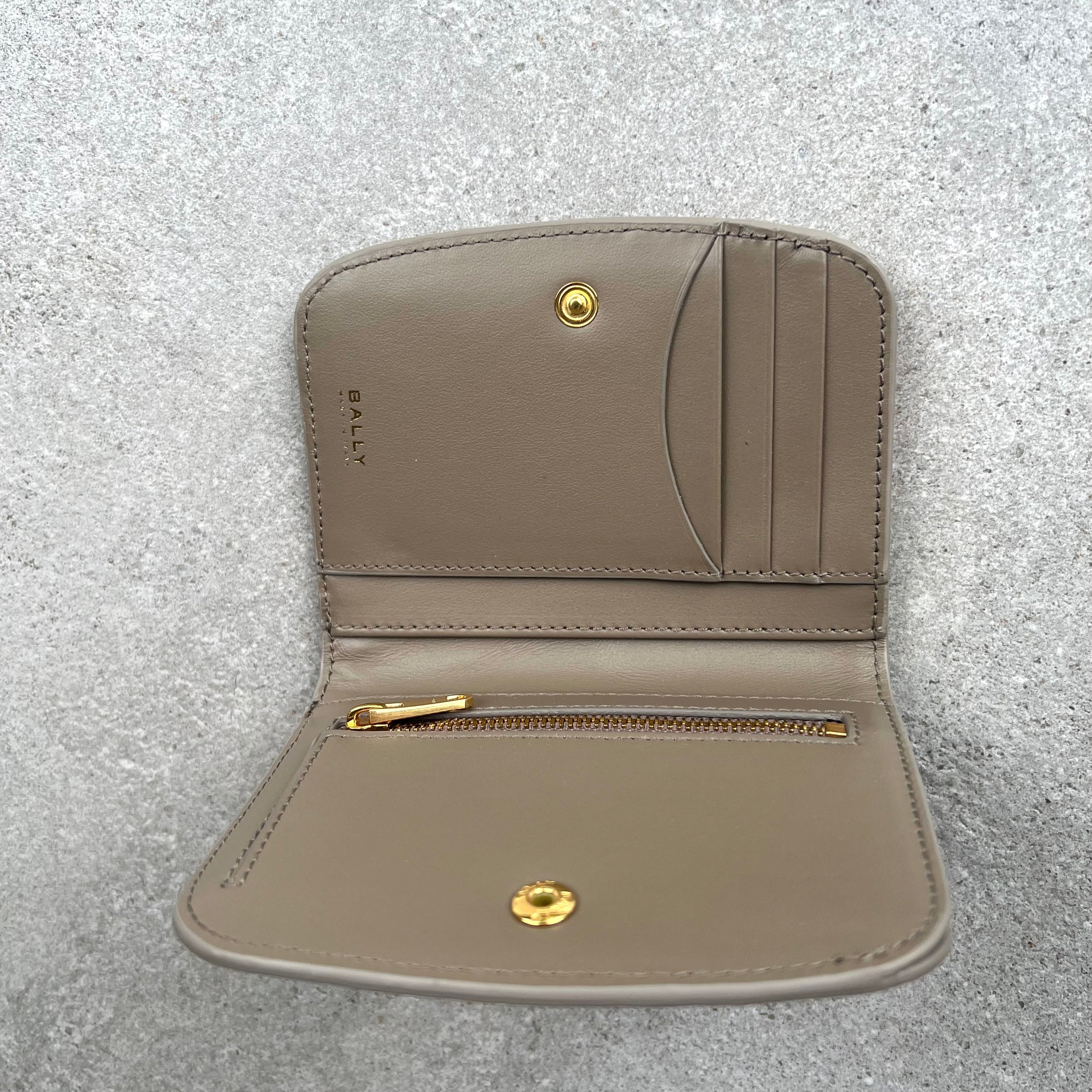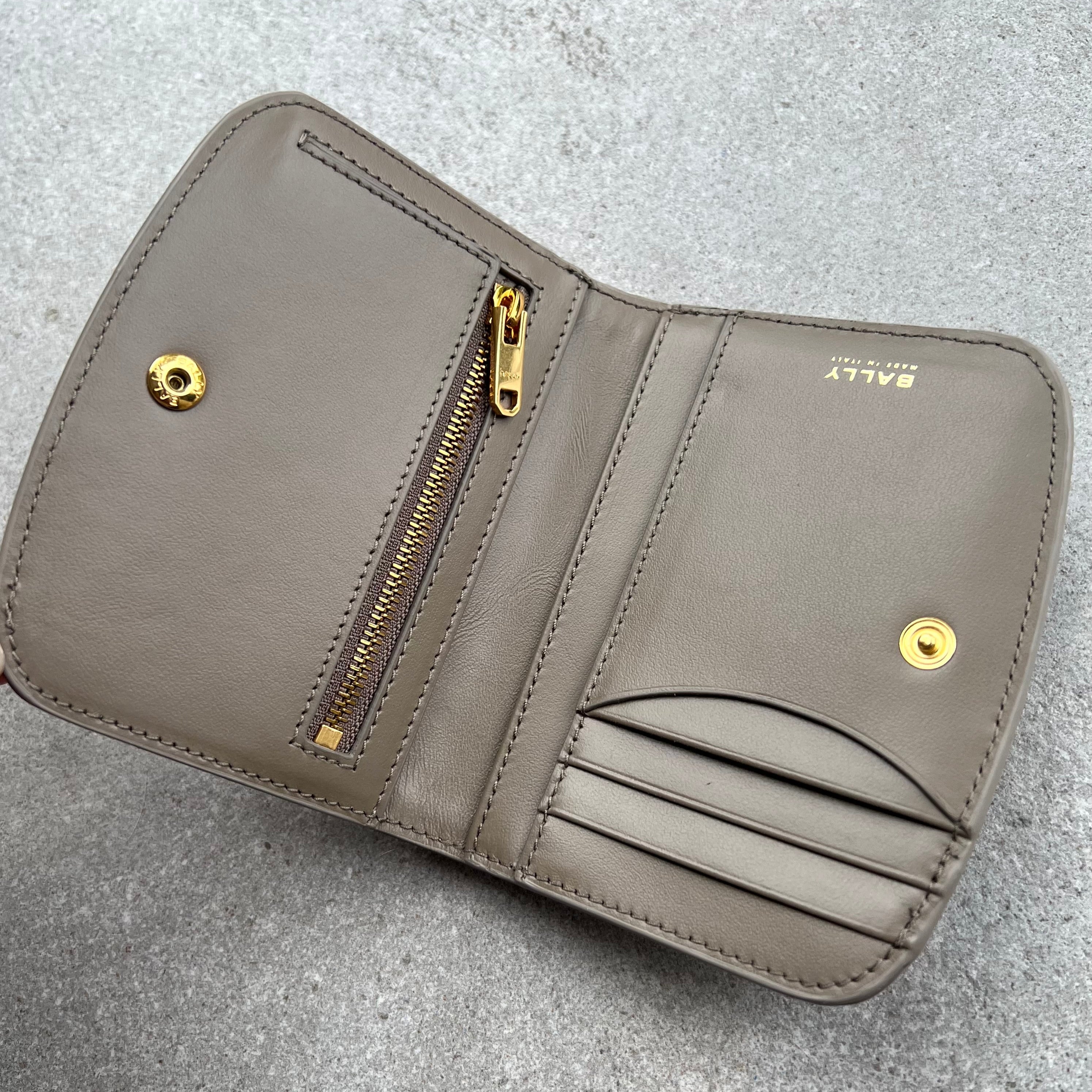 This Deco wallet in black calfskin features a simple metal plaque detailed with three engraved lines to recall the Bally Ribbon. On the inside, multiple compartments keep cash, coins and cards organized.