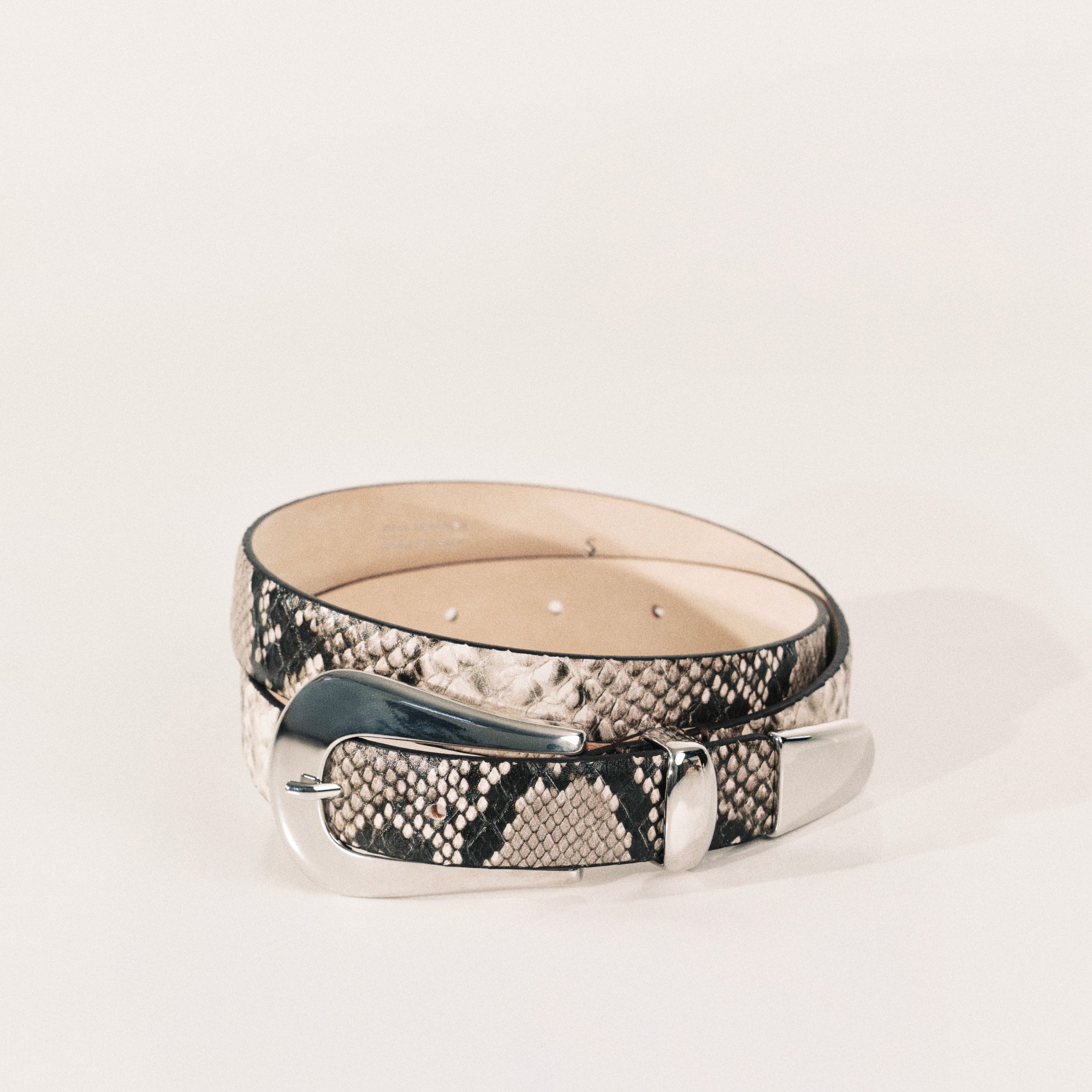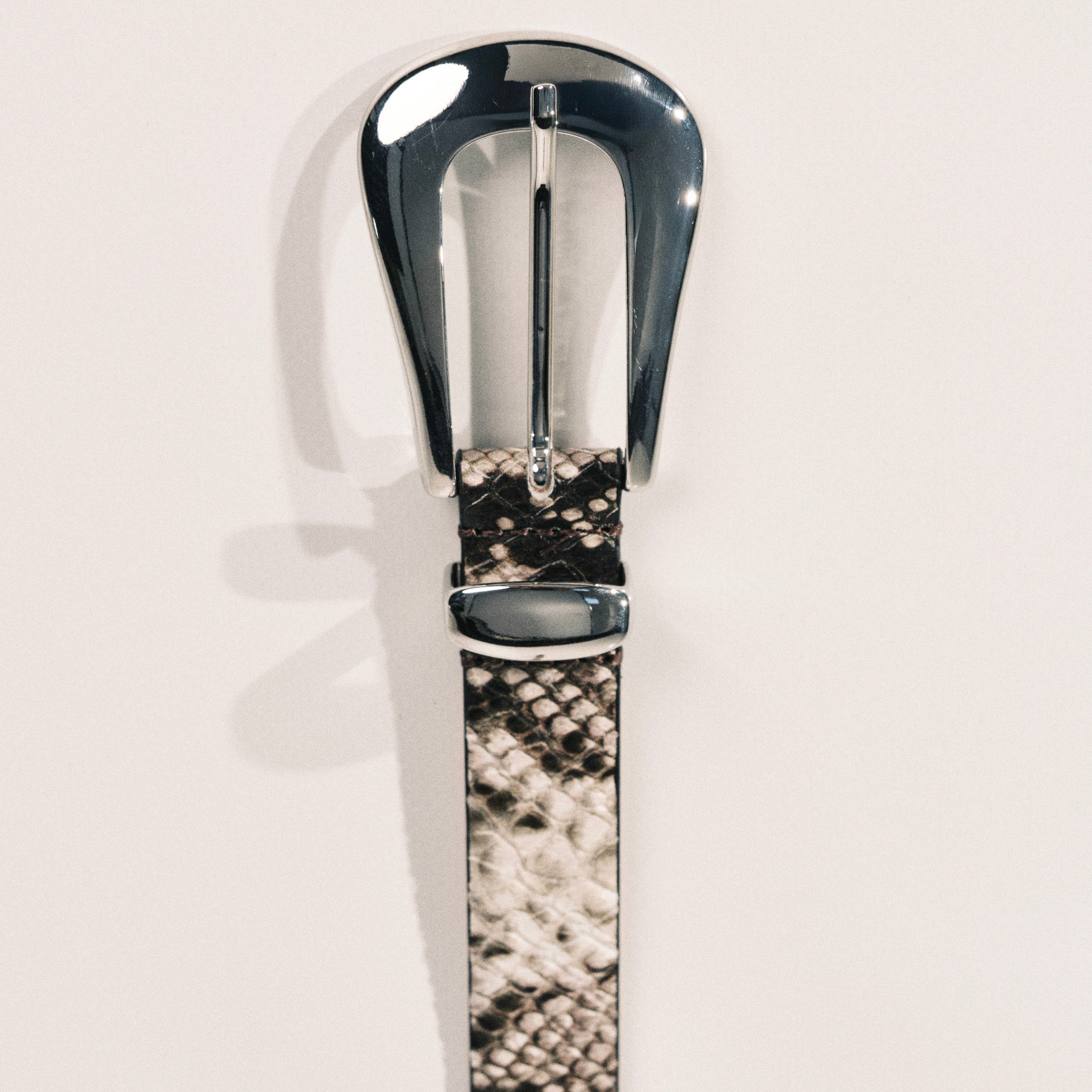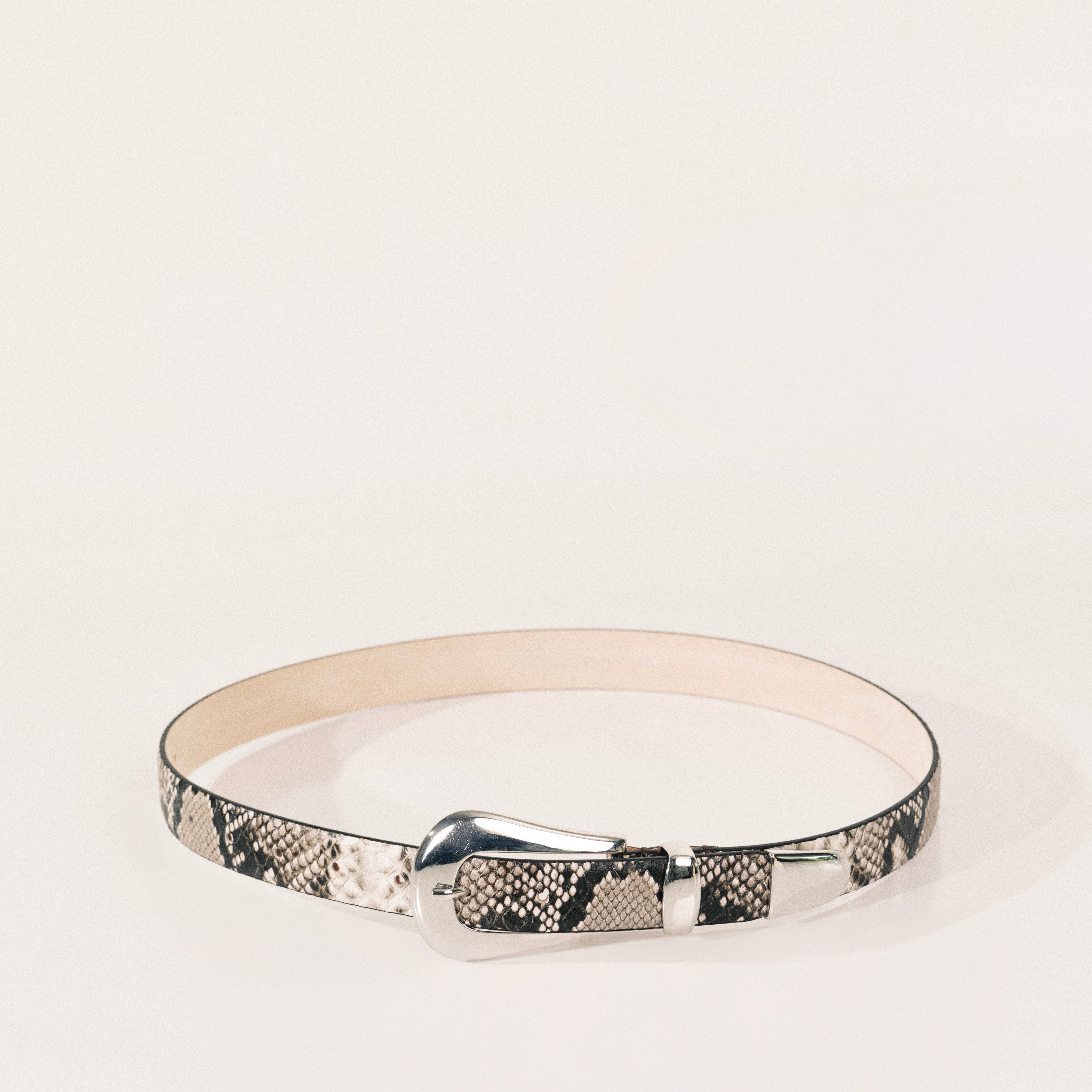 The Colette belt softens Western cues into a sculptural, minimalist accent, crafted from snake-effect leather and finished with silver oval hardware that sharpens the silhouette with quiet elegance.