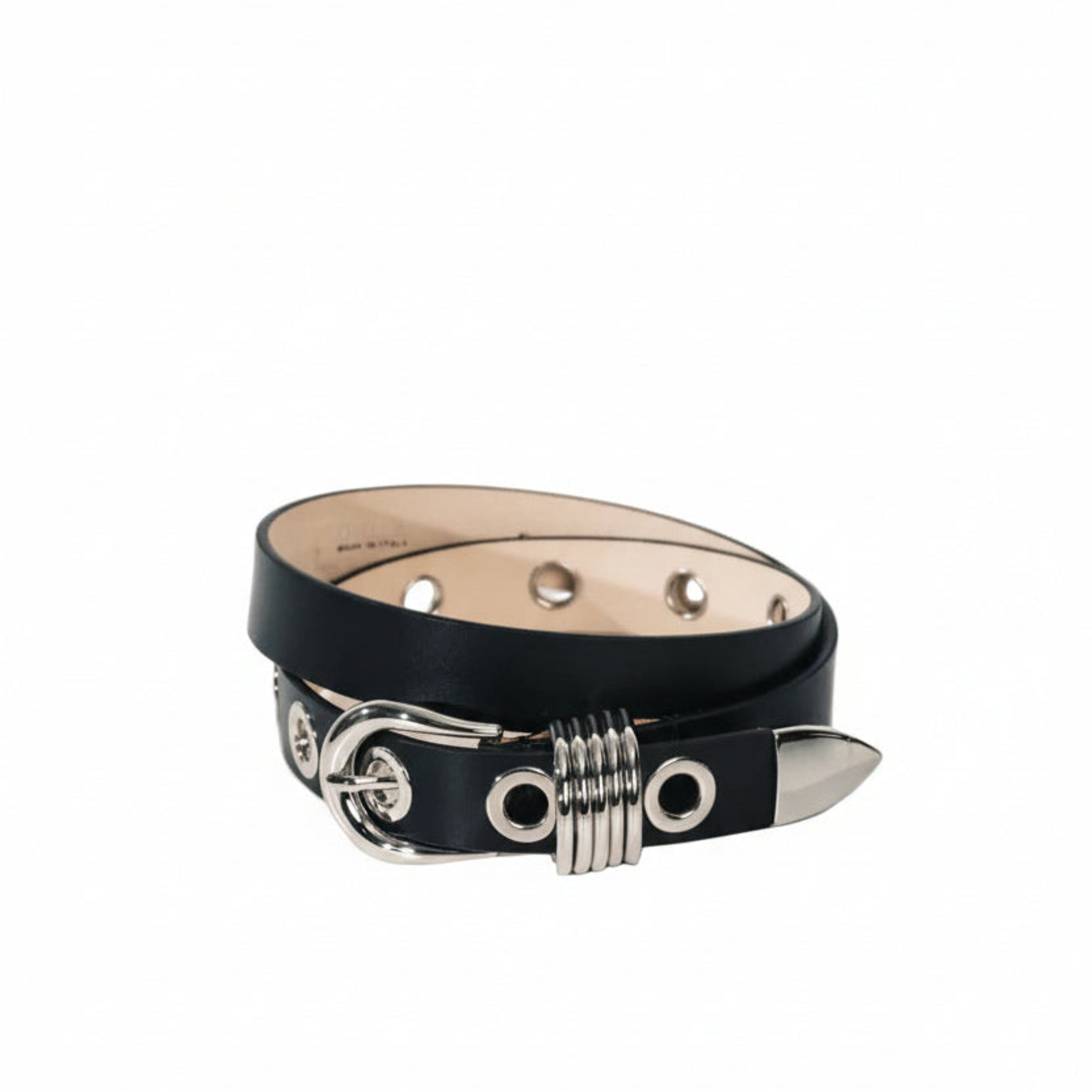 Déhanche’s signature design featuring 5 demi rings and ten carefully placed grommet holes, along with an extended strap for a more flexible fit across sizes. Finished with silver hardware.
