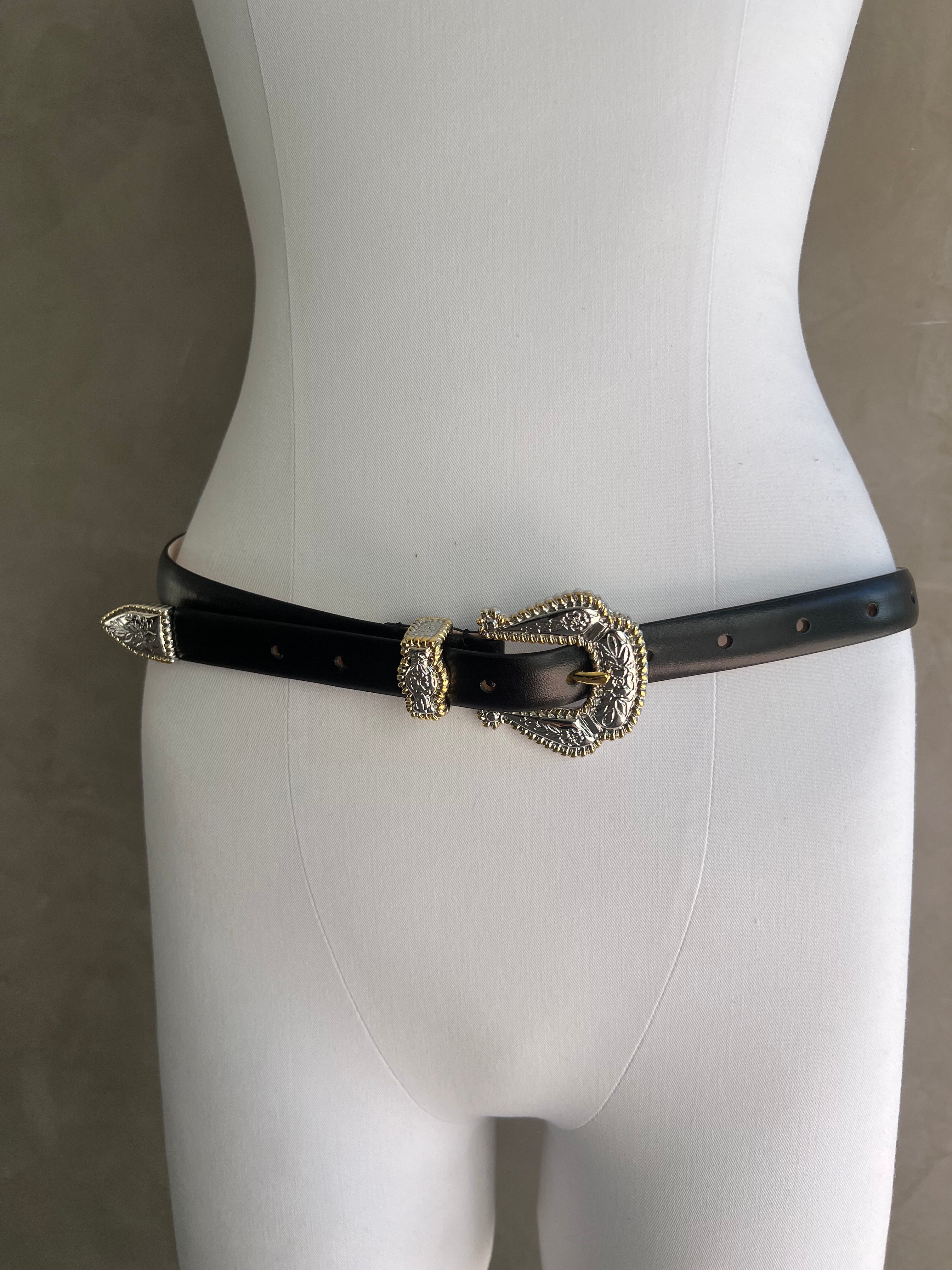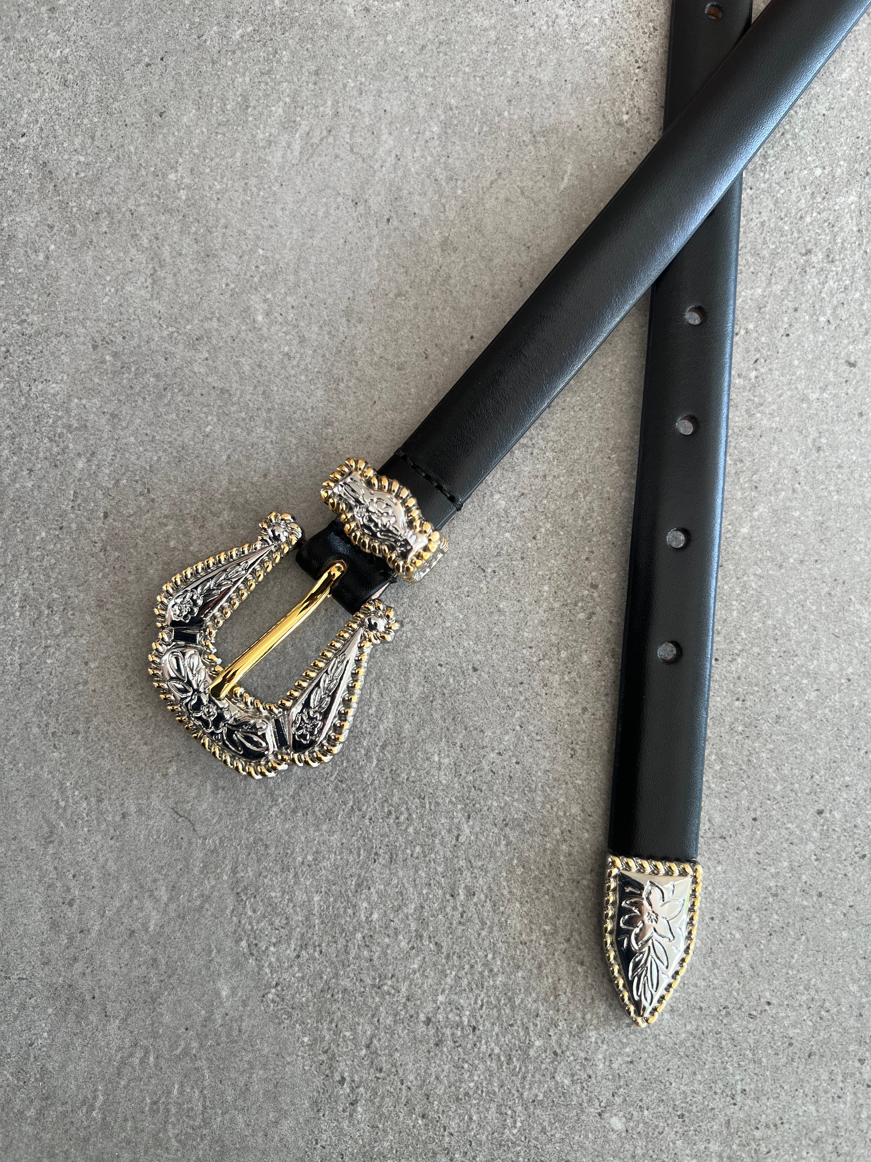 Déhanche brings a fresh, modern feel to everyday accessories with the Santo belt being a stylish take on classic Western designs. It features a detailed buckle with mixed gold and silver-tone hardware, along with a matching keeper and tip for a clean, finished look.