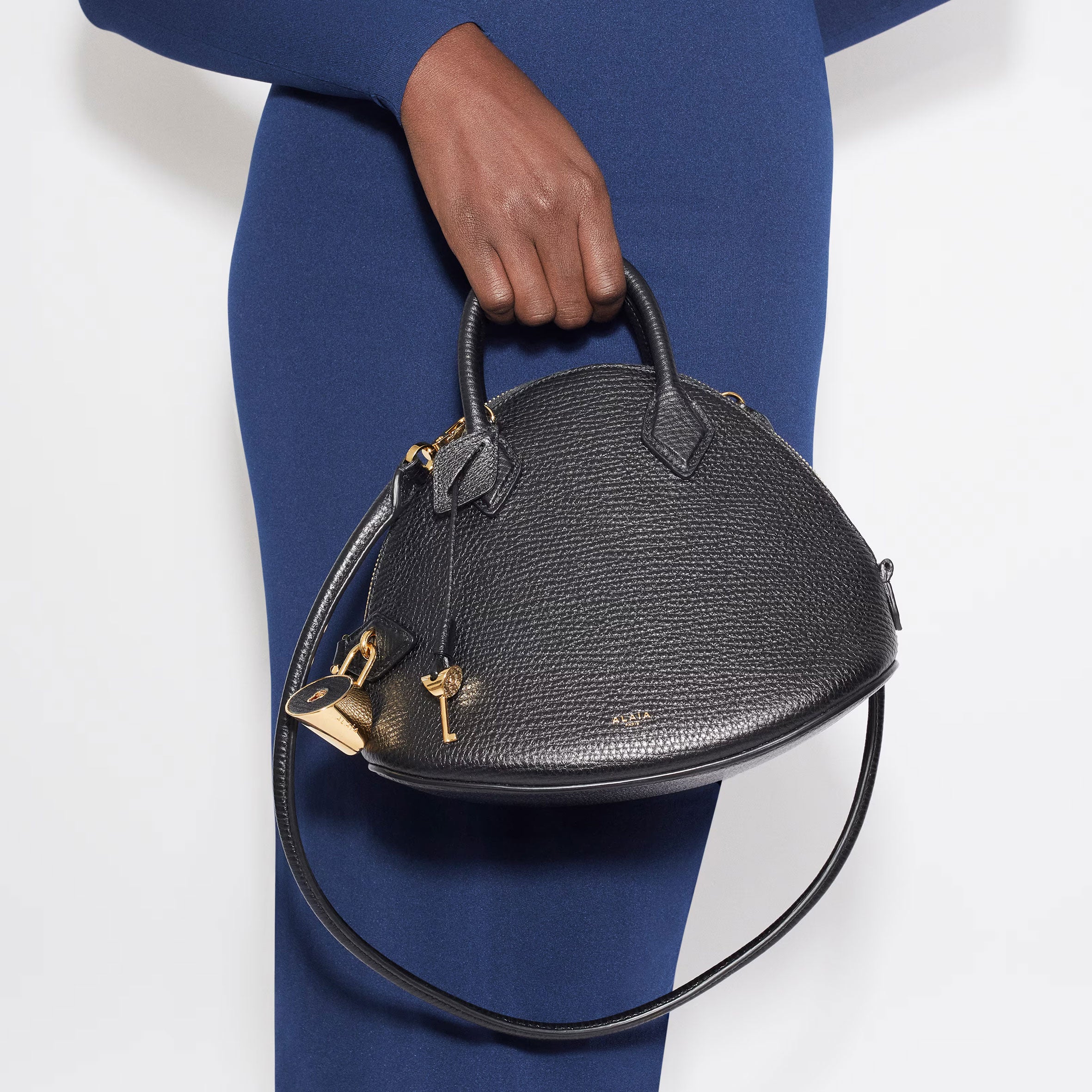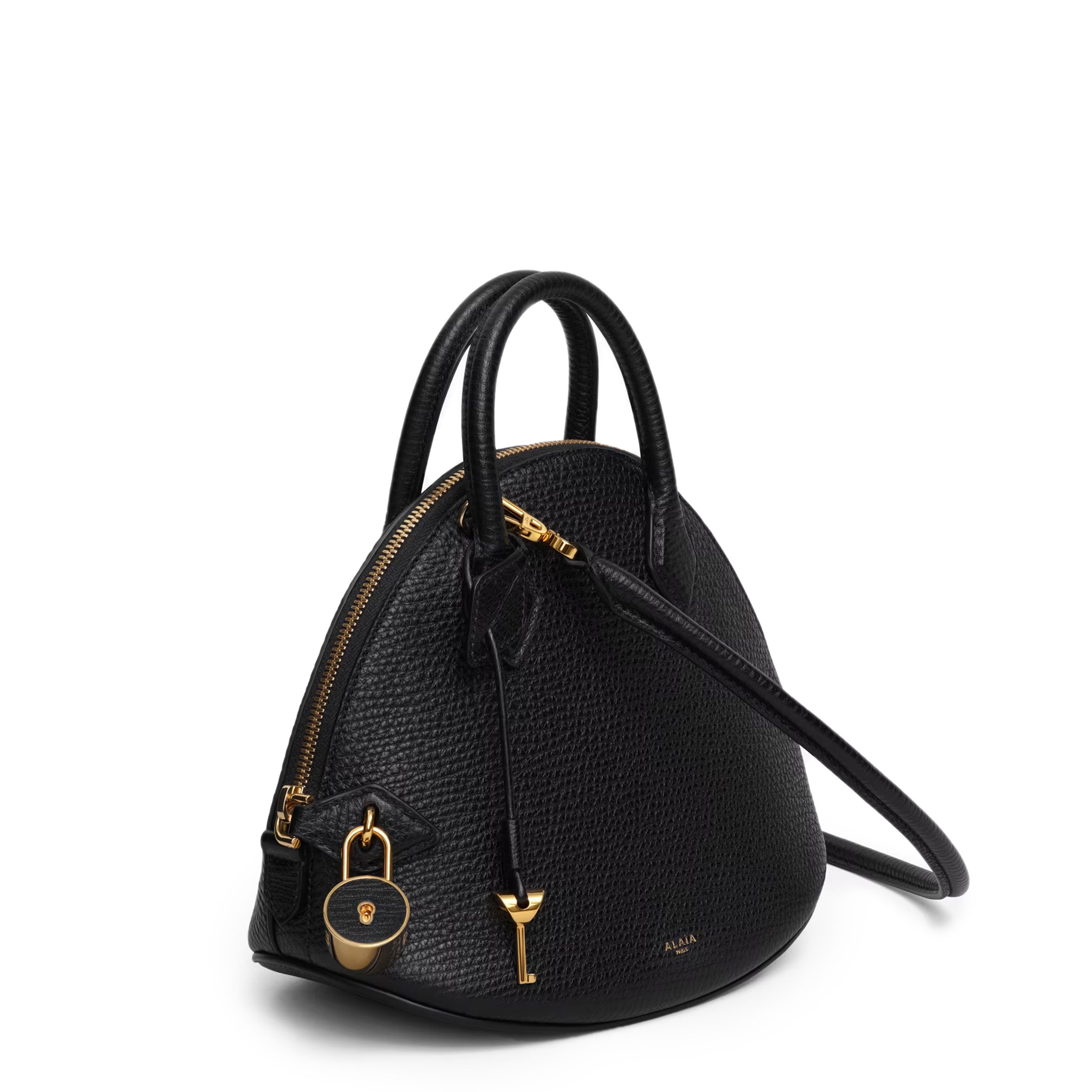 The dome shaped bag of the Alaïa Maison. A small structured handbag crafted in premium grained calfskin, featuring a zip closure and functional padlock and key bell. It also had a long strap making it suitable for hand or shoulder carrying.