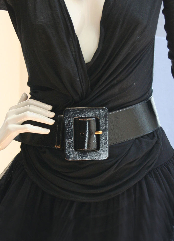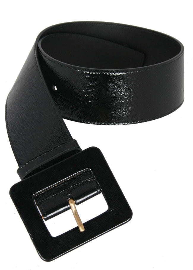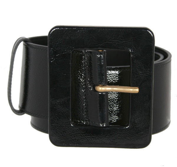 The iconic YSL belt in black patent leather. Sits high on the natural waist. Covered buckle 2.5 inches wide.