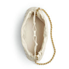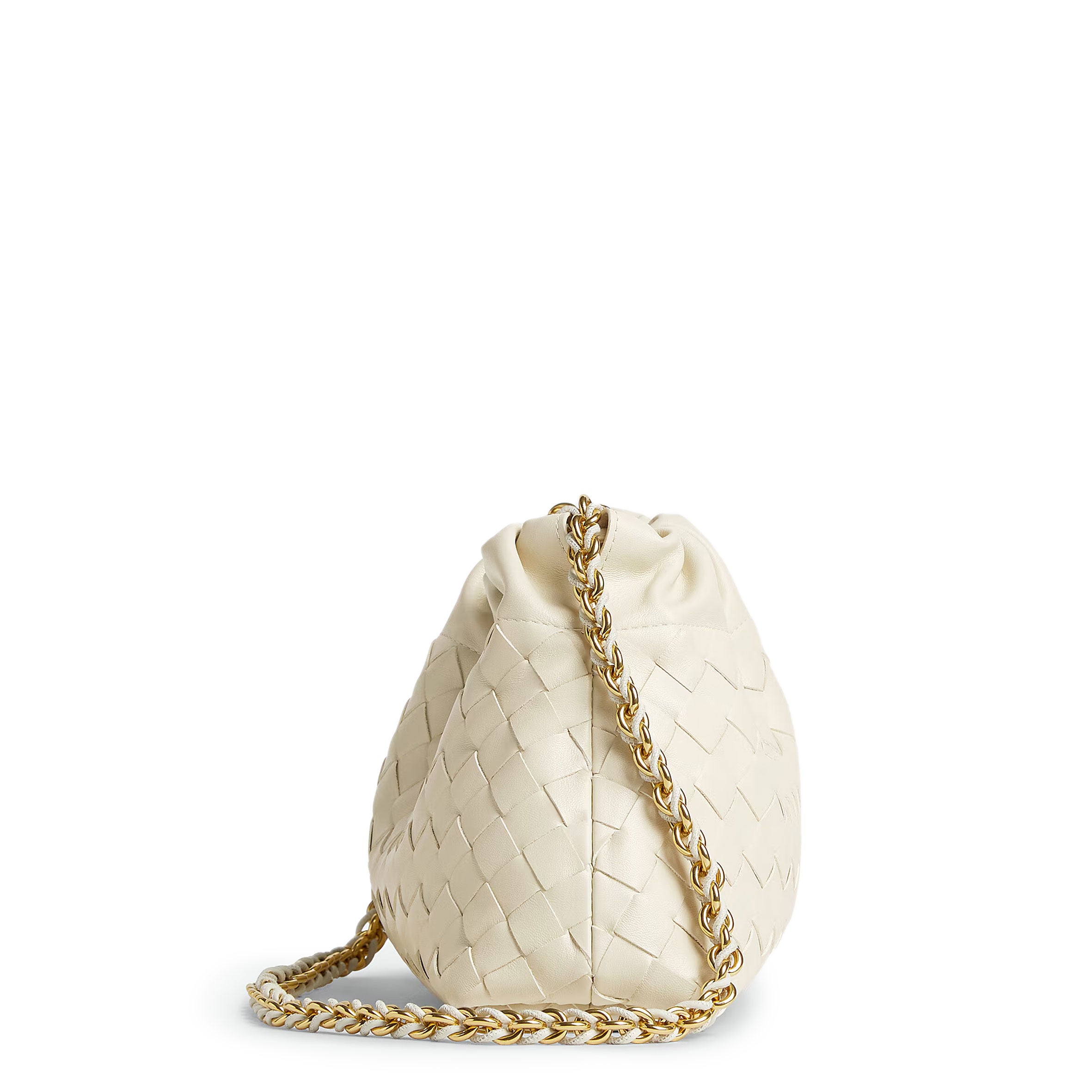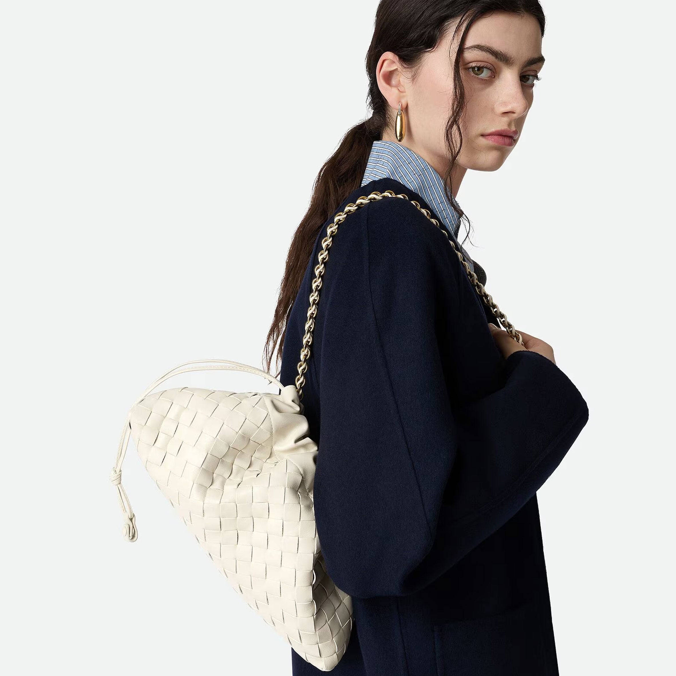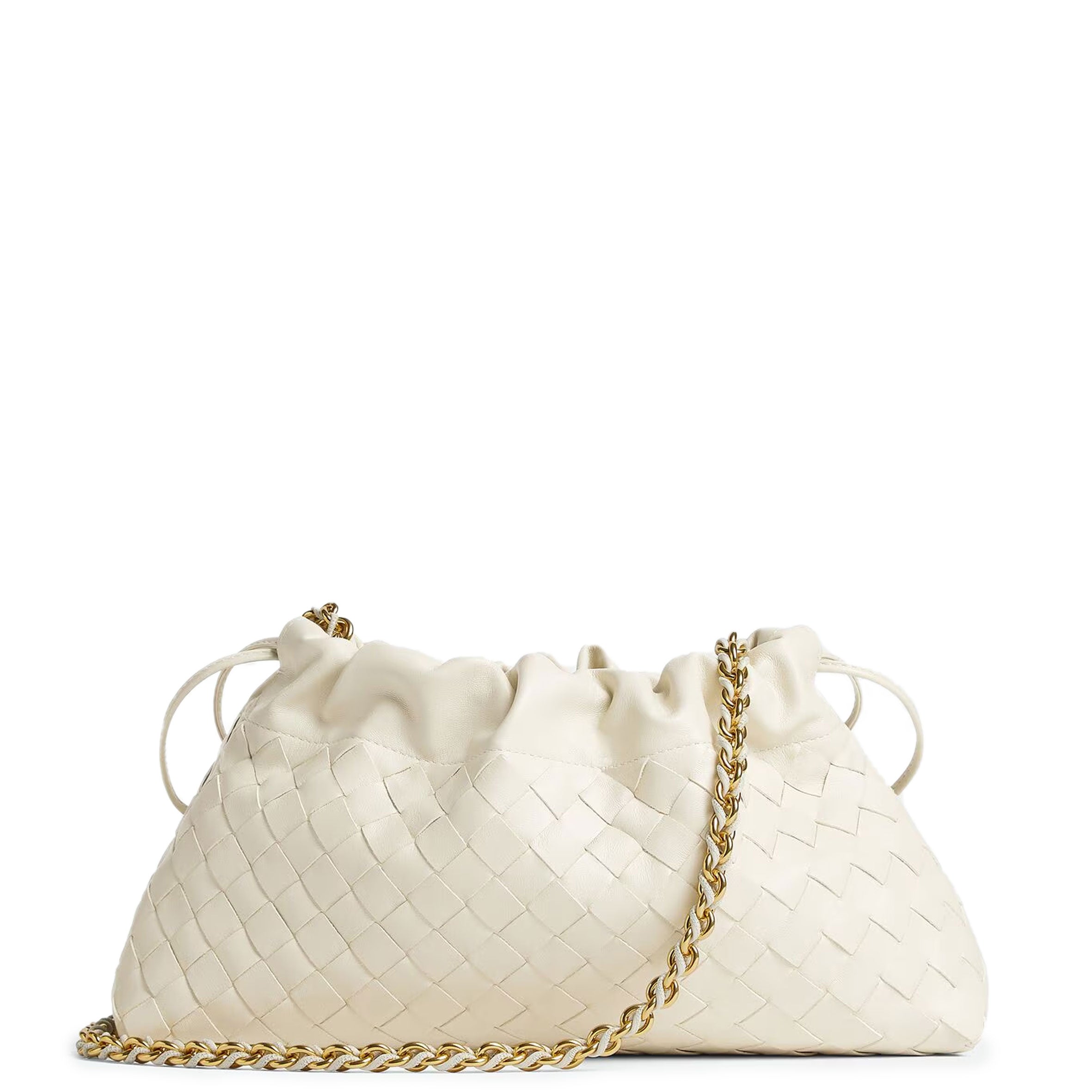 Dustbag in Intrecciato calf leather with tubular leather braided metal chain. Features a drawsting closure and loop attachment for shoulder carry.