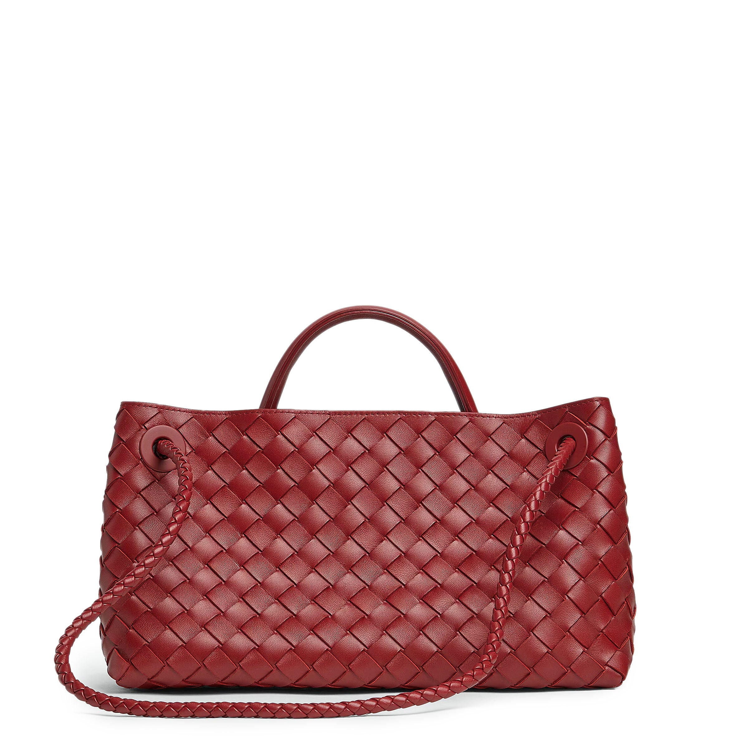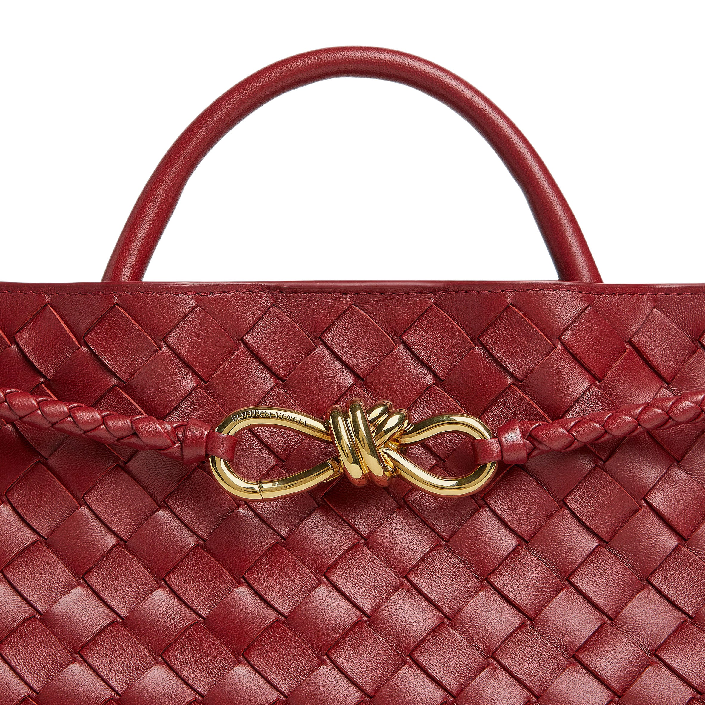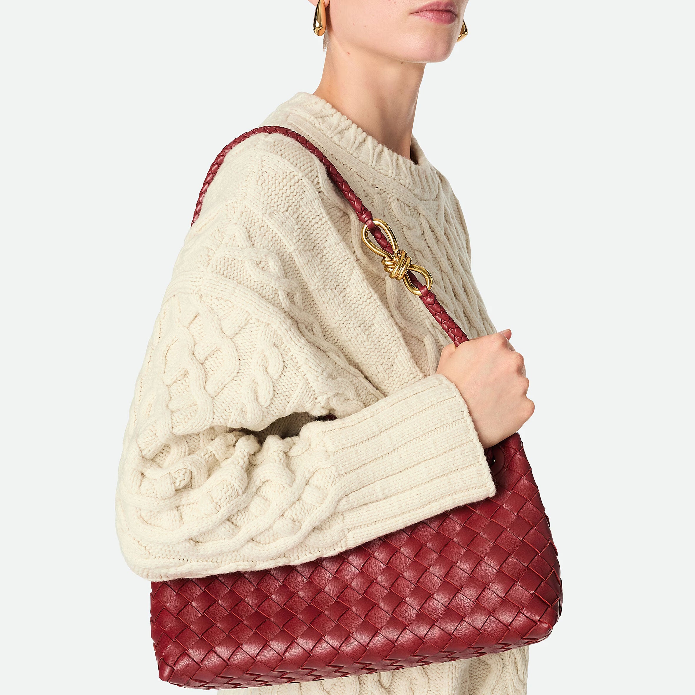 Top handle bag with an elongated silhouette meticulously crafted from supple Intrecciato nappa leather featuring a sliding cross-body strap and signature knot detail. Andiamo is a new expression of the signature Intrecciato weave realised by the expert craftsmanship of artisans in the house’s atelier. Its name, Andiamo, “Let’s go” in Italian, embodies the spirit of the bag, a tribute to going places and the concept of craft in motion. The bag features a timeless Intrecciato silhouette woven by hand. A metal knot adorns and fastens its sliding braided straps, allowing it to be adjusted over the shoulder or across the body, giving the bag a soft tapered volume.