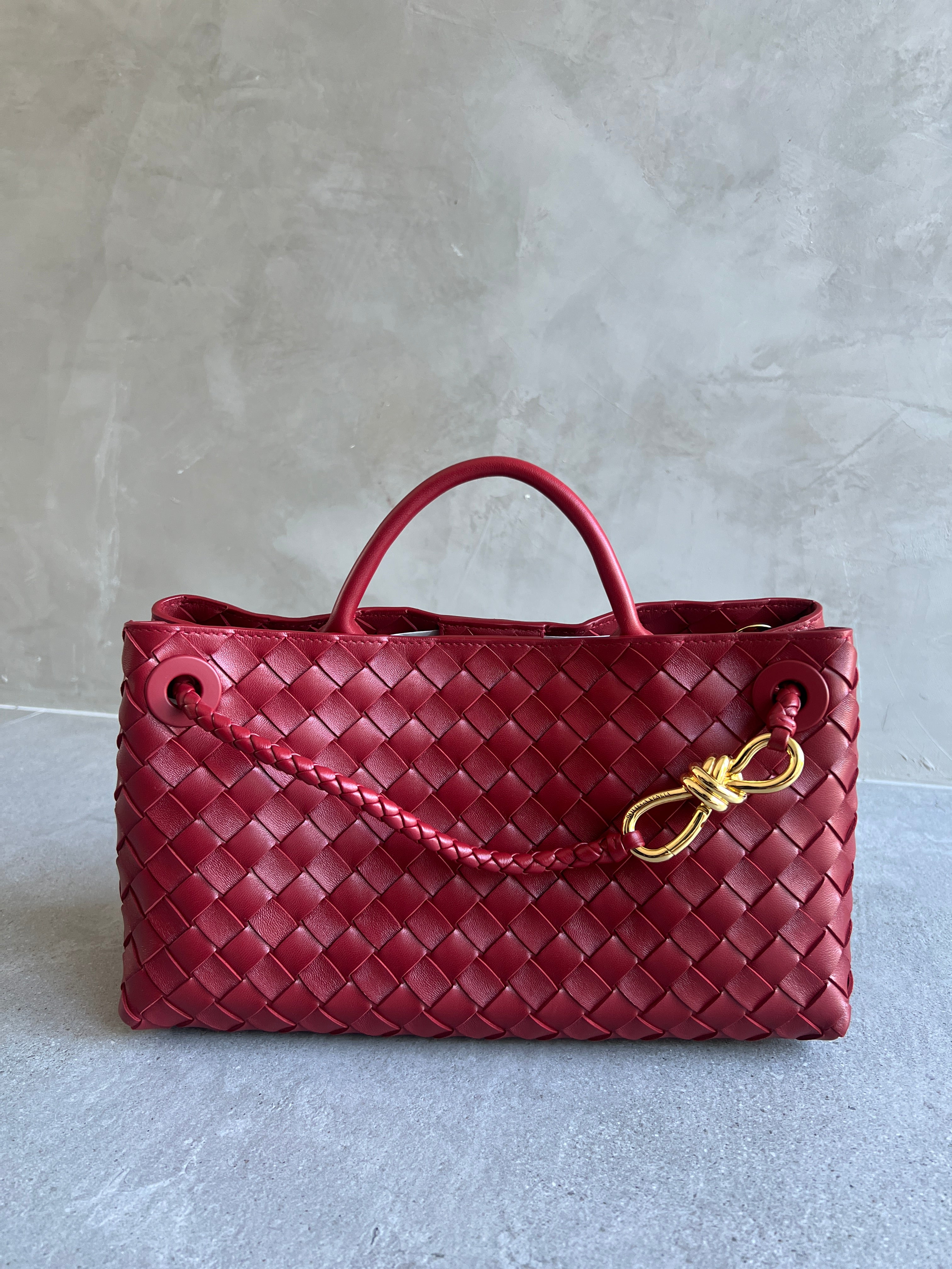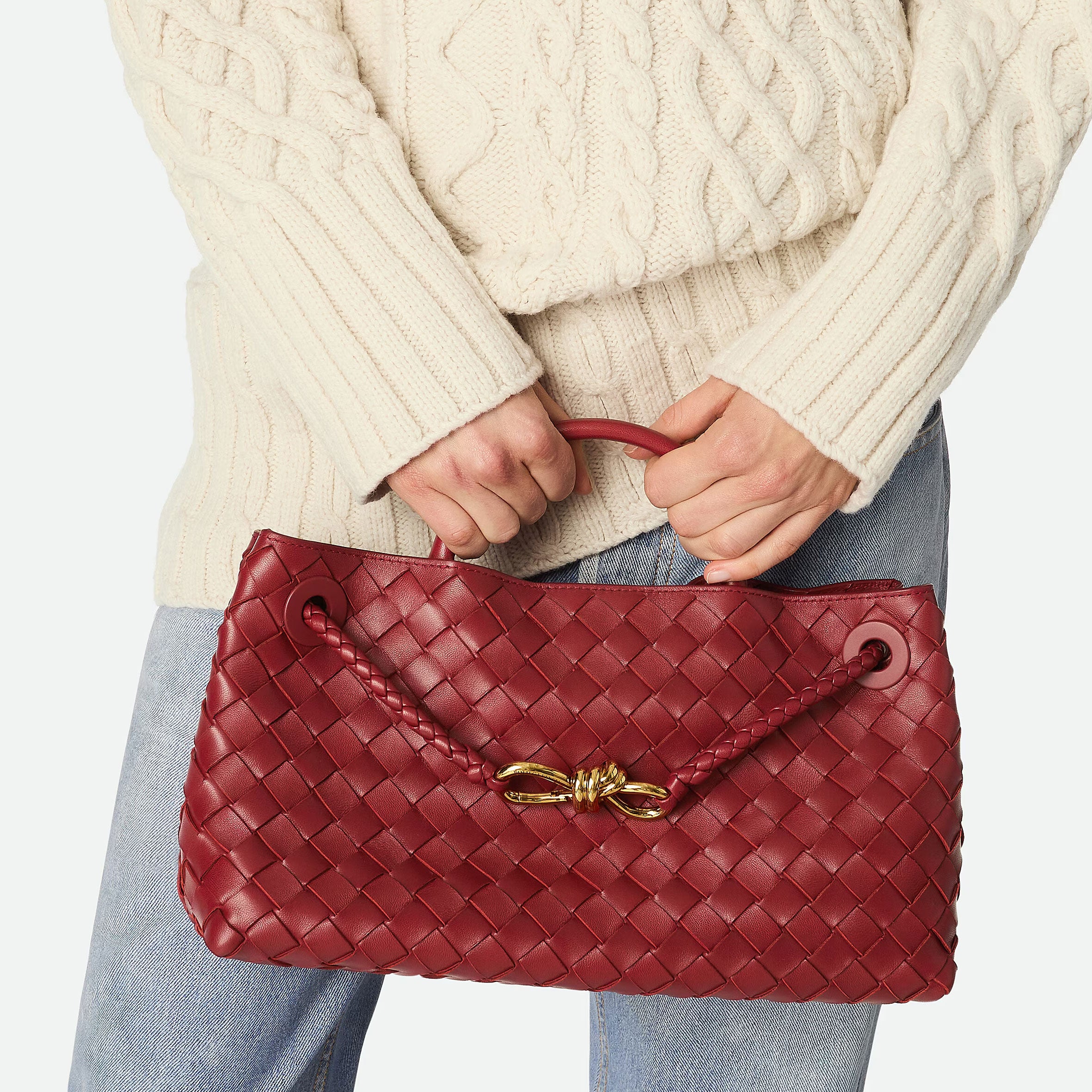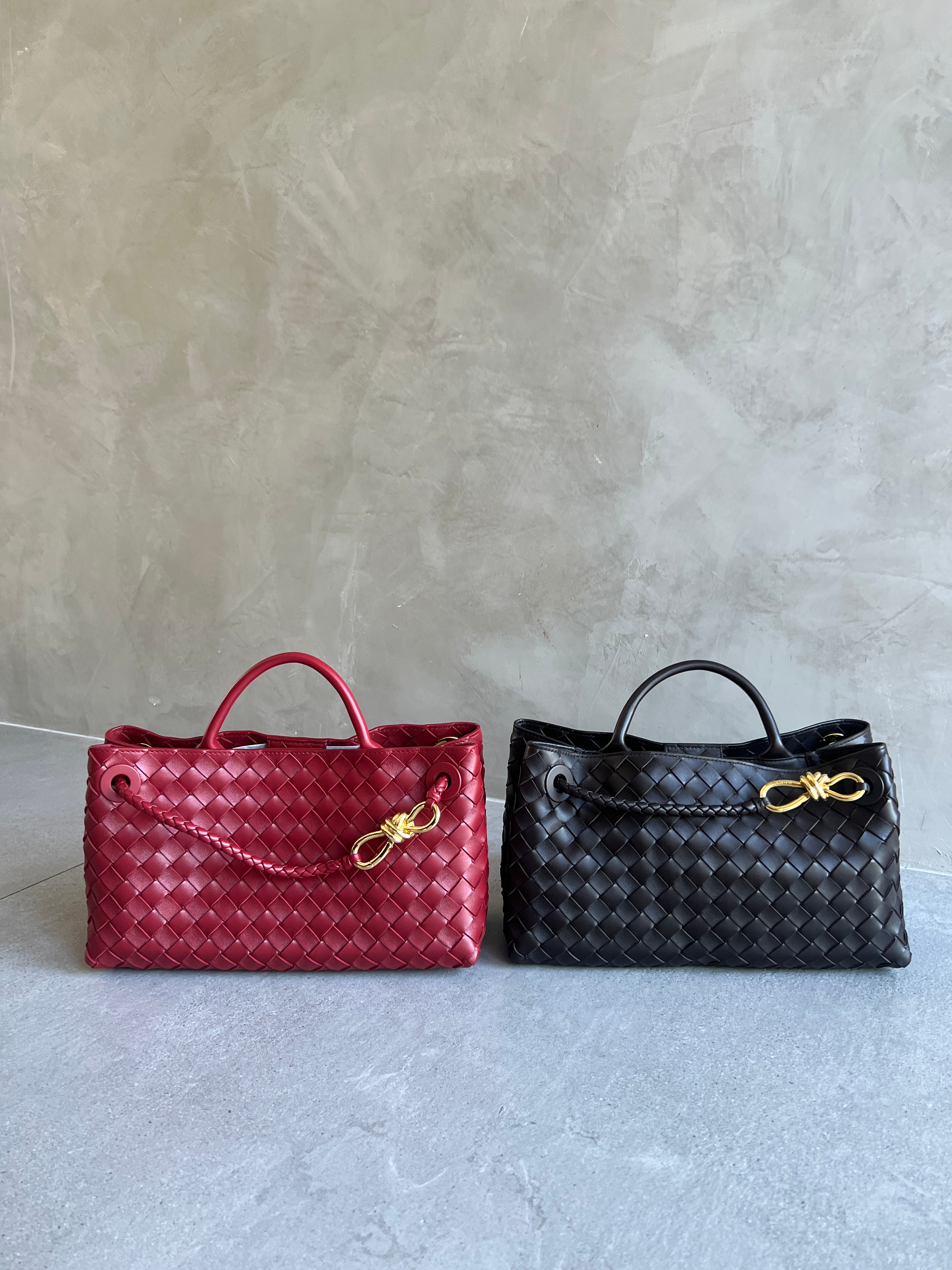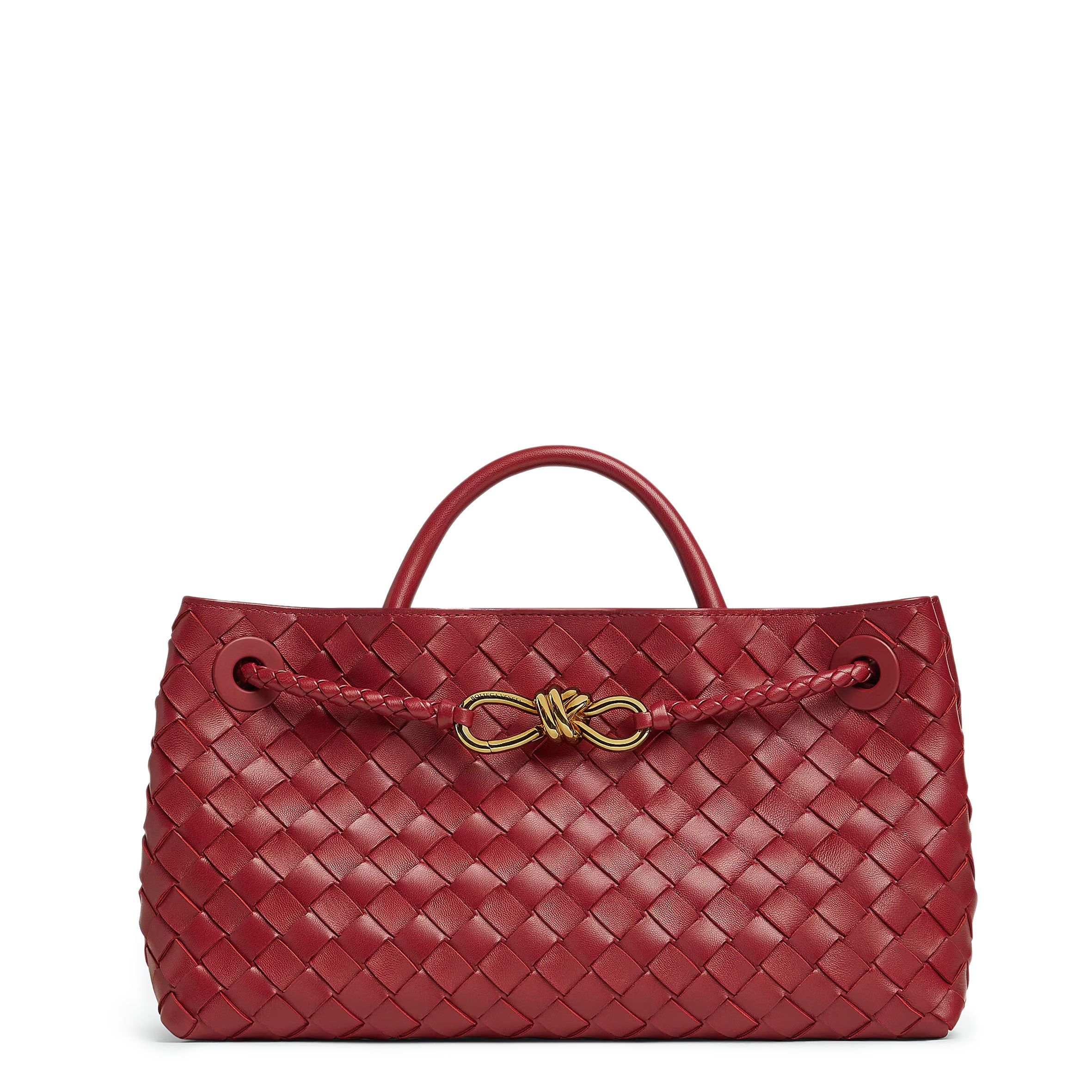 Top handle bag with an elongated silhouette meticulously crafted from supple Intrecciato nappa leather featuring a sliding cross-body strap and signature knot detail. Andiamo is a new expression of the signature Intrecciato weave realised by the expert craftsmanship of artisans in the house’s atelier. Its name, Andiamo, “Let’s go” in Italian, embodies the spirit of the bag, a tribute to going places and the concept of craft in motion. The bag features a timeless Intrecciato silhouette woven by hand. A metal knot adorns and fastens its sliding braided straps, allowing it to be adjusted over the shoulder or across the body, giving the bag a soft tapered volume.