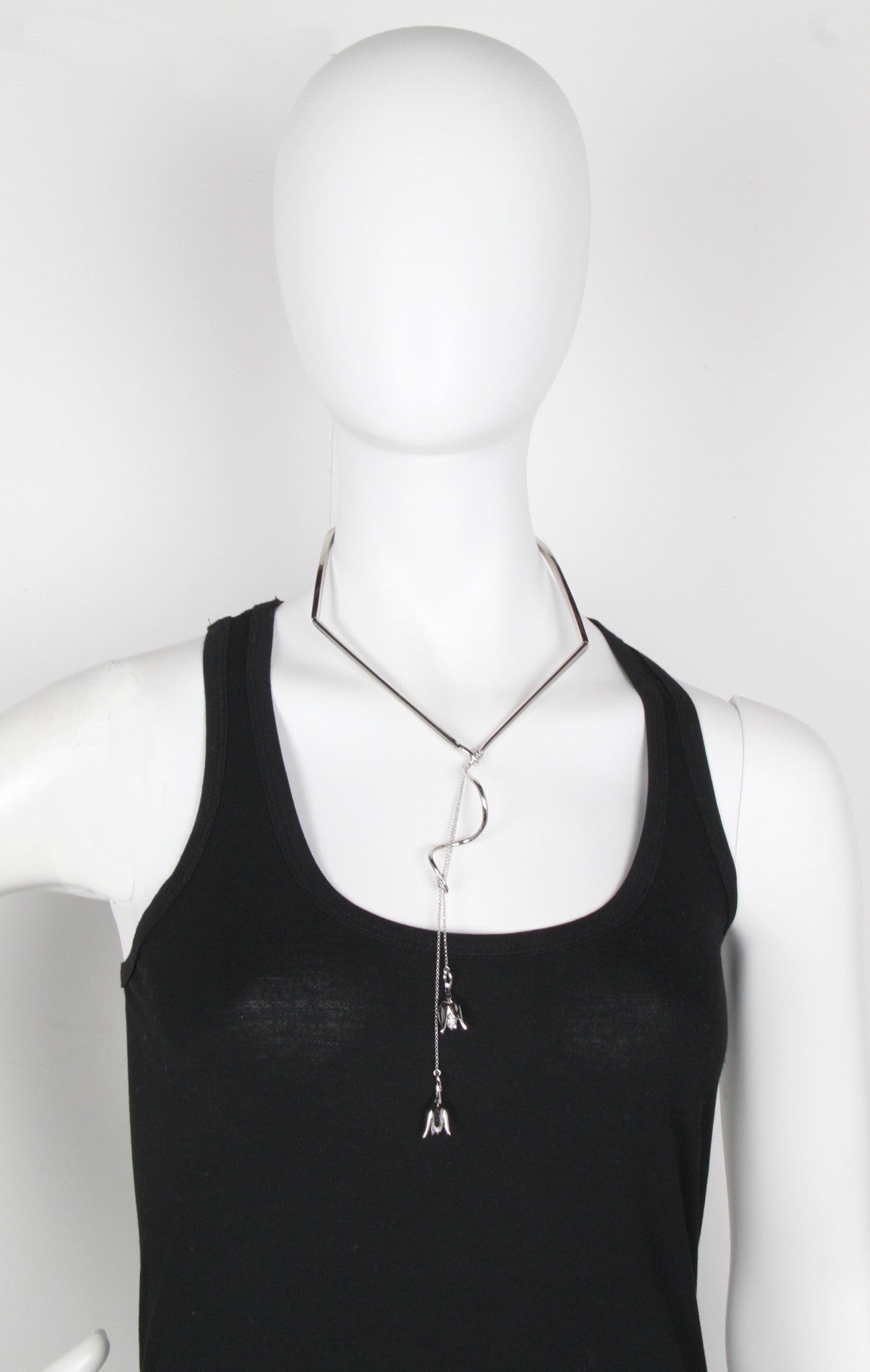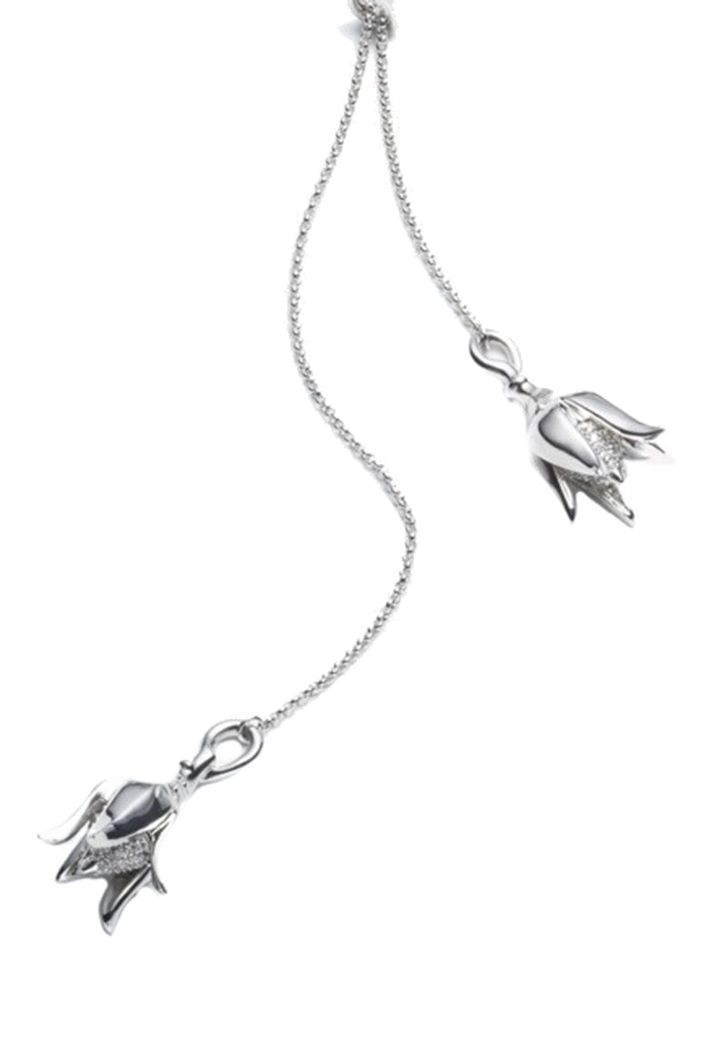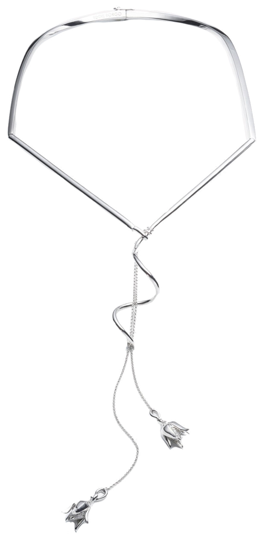 Pave Bud Drop Necklace. Pavé Bud Drop Necklace plated in silver with structured collar , vine-like tendrils, and handcut pavé rose buds on a delicate chain.