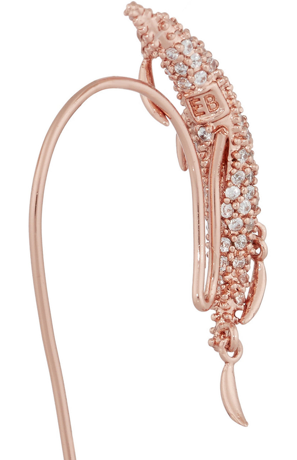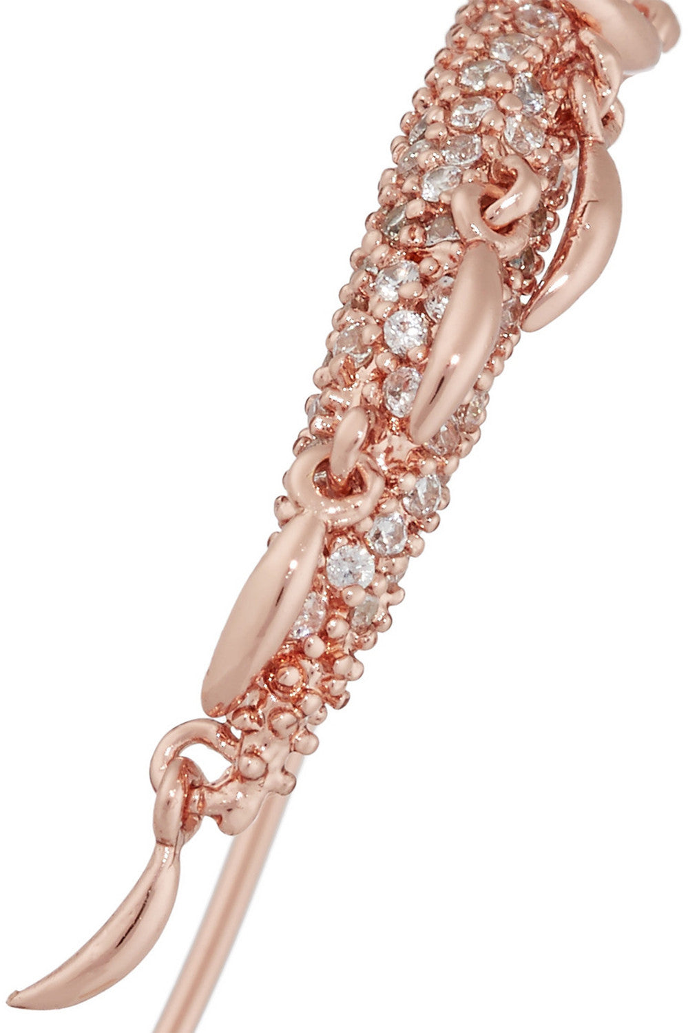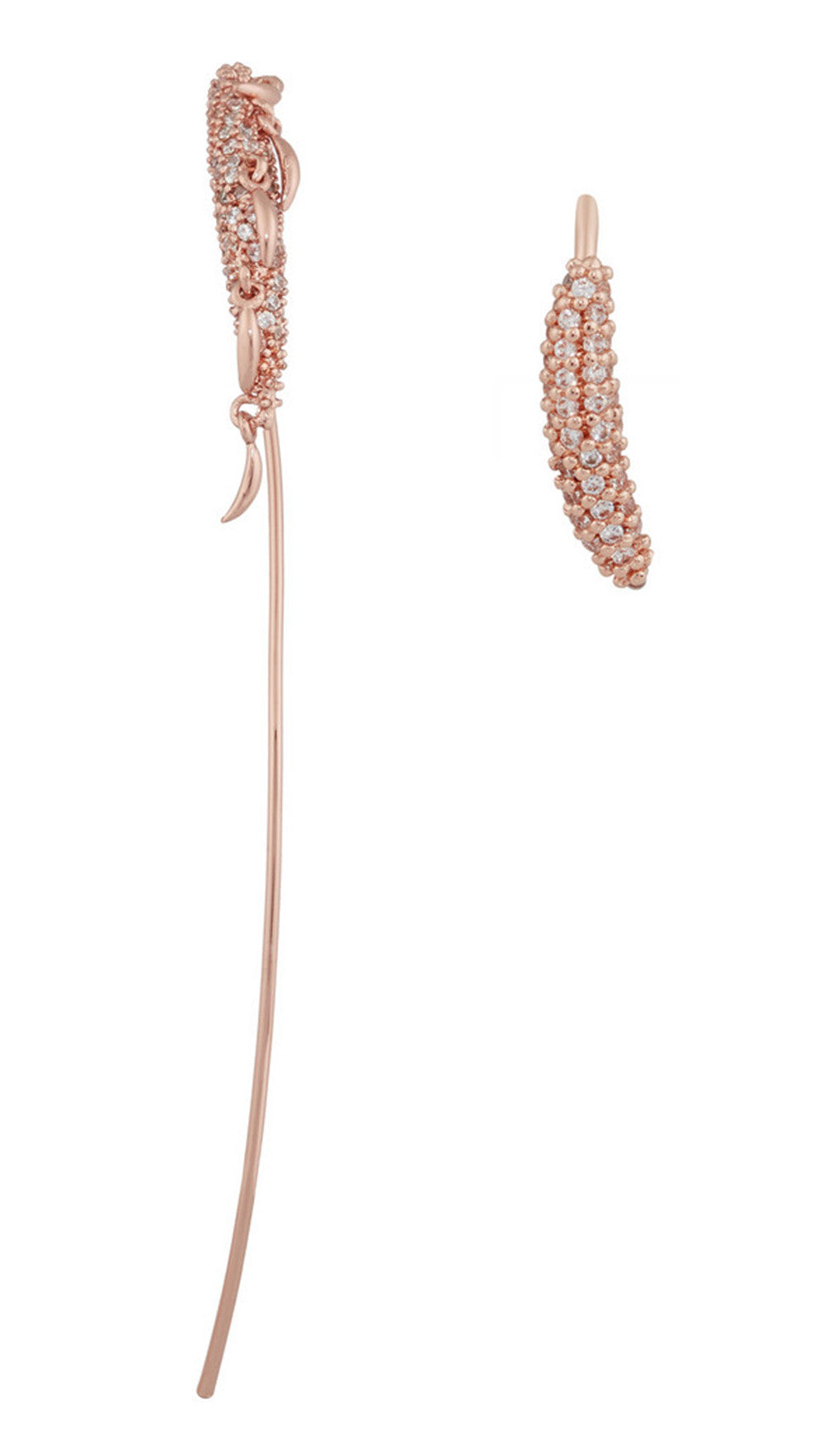 This earring set designed in plated rose gold and handcut pavé crystals is an asymmetrical set, where one piece climbs up the ear, while the other has mini fluid prickles and an extended ear wire. This statement pair comes with one elongated side and a more understated shorter hook. The short piece can be used as a drop OR positioned upwards horizontally along the lobe.