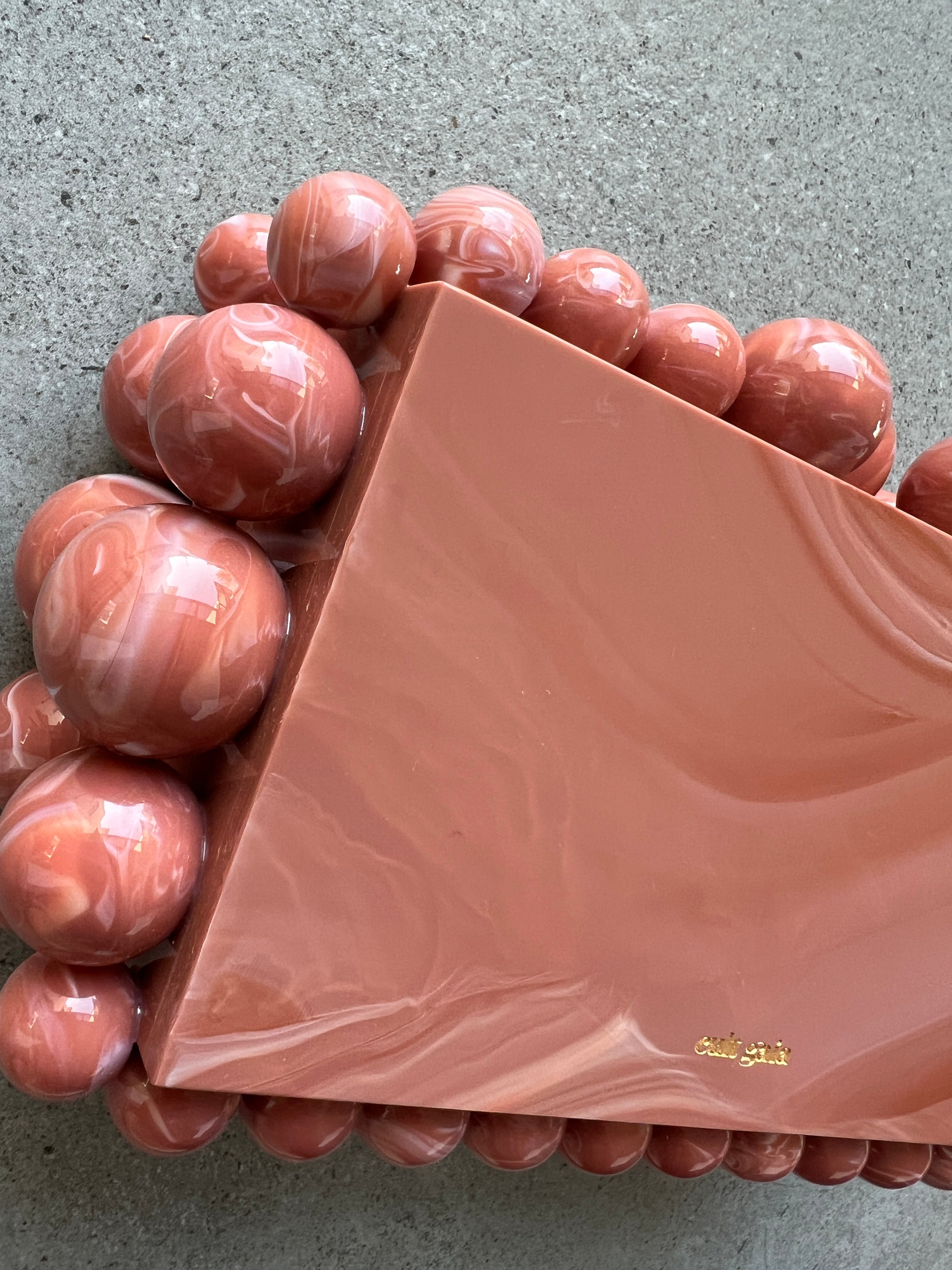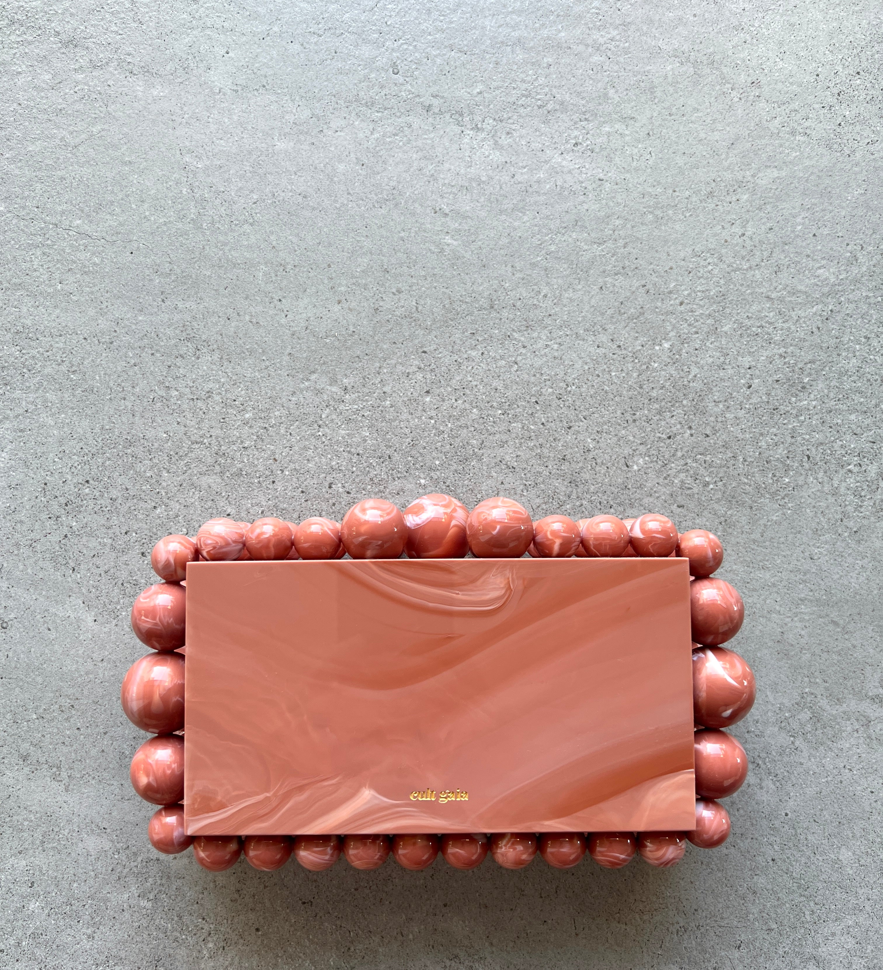 The EOS Clutch is a work of art. A handheld pearlized and marbled acrylic clutch featuring beaded trims designed in a luxurious material. The Enid is the perfect size for your essentials and an eye-catching accent to any outfit, while the hard case and clasp keep your belongings safe.