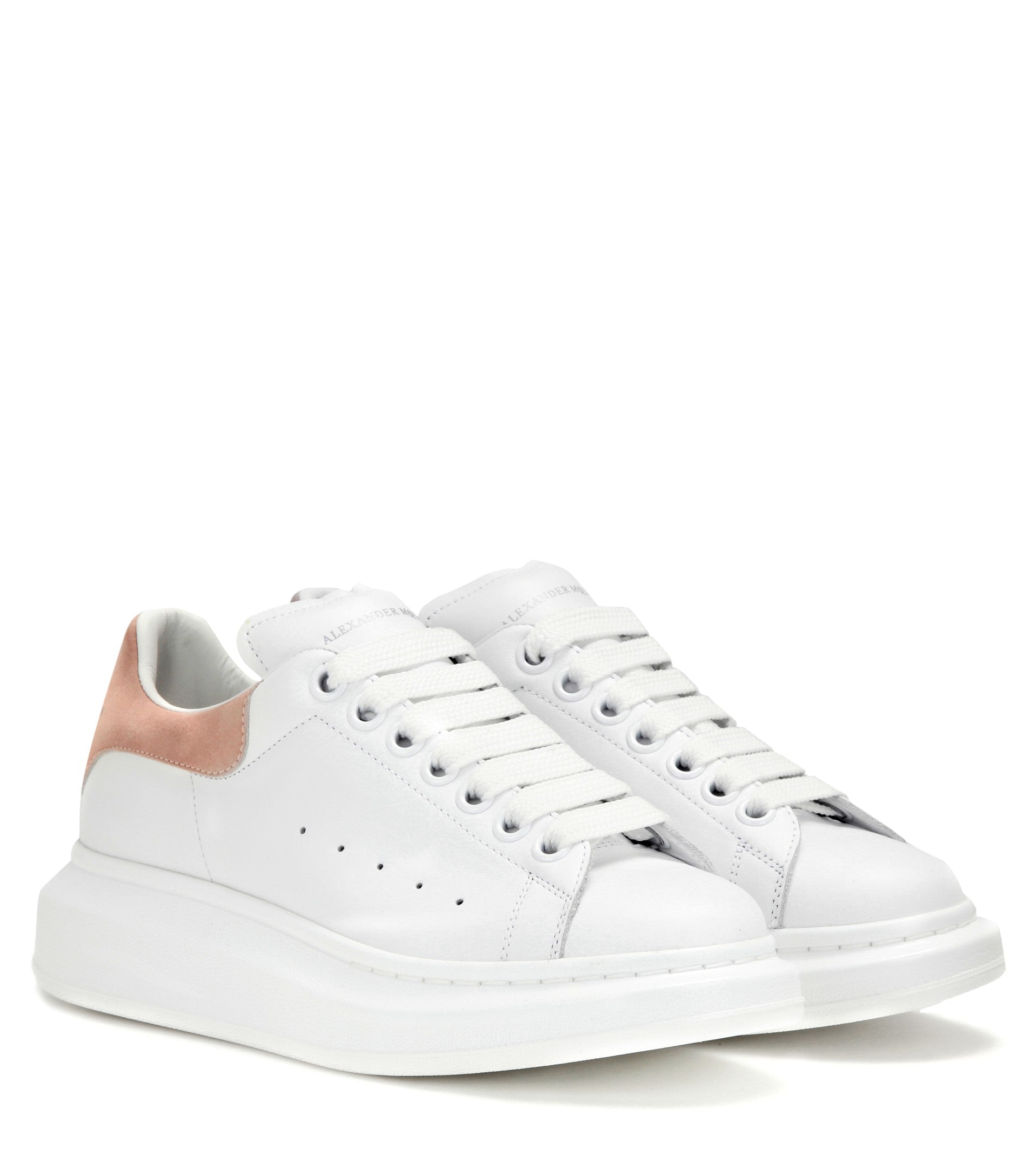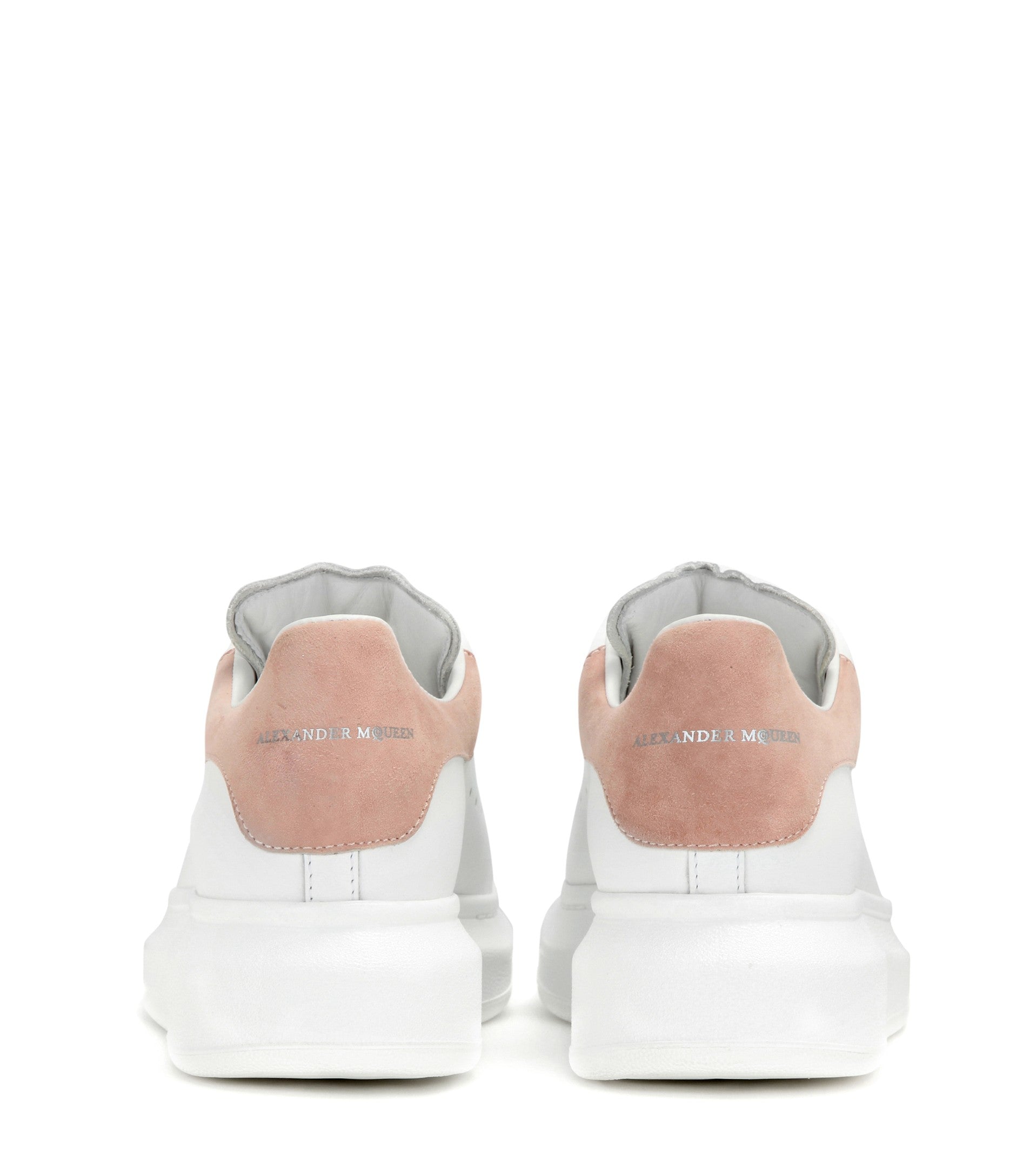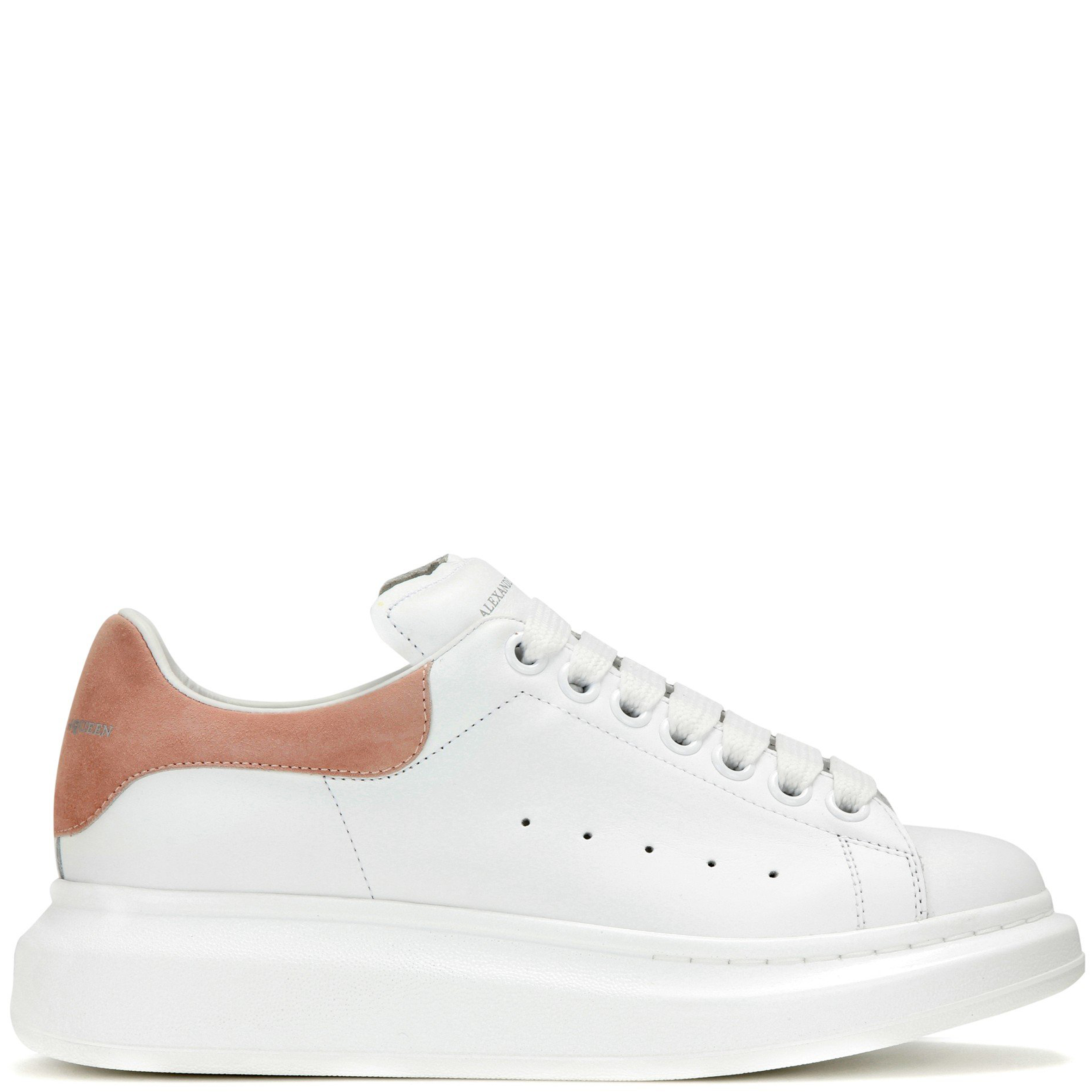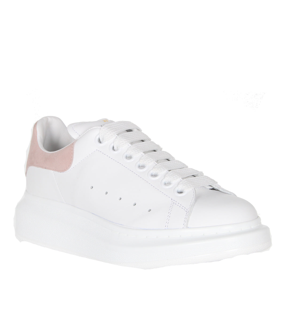 White smooth calf leather lace up sneaker with rounded toe and trimmed with patchouli suede heel detail. The sneaker features large flat laces and is finished with an Alexander McQueen signature on the heel counter and leather tongue. Oversized rubber sole.