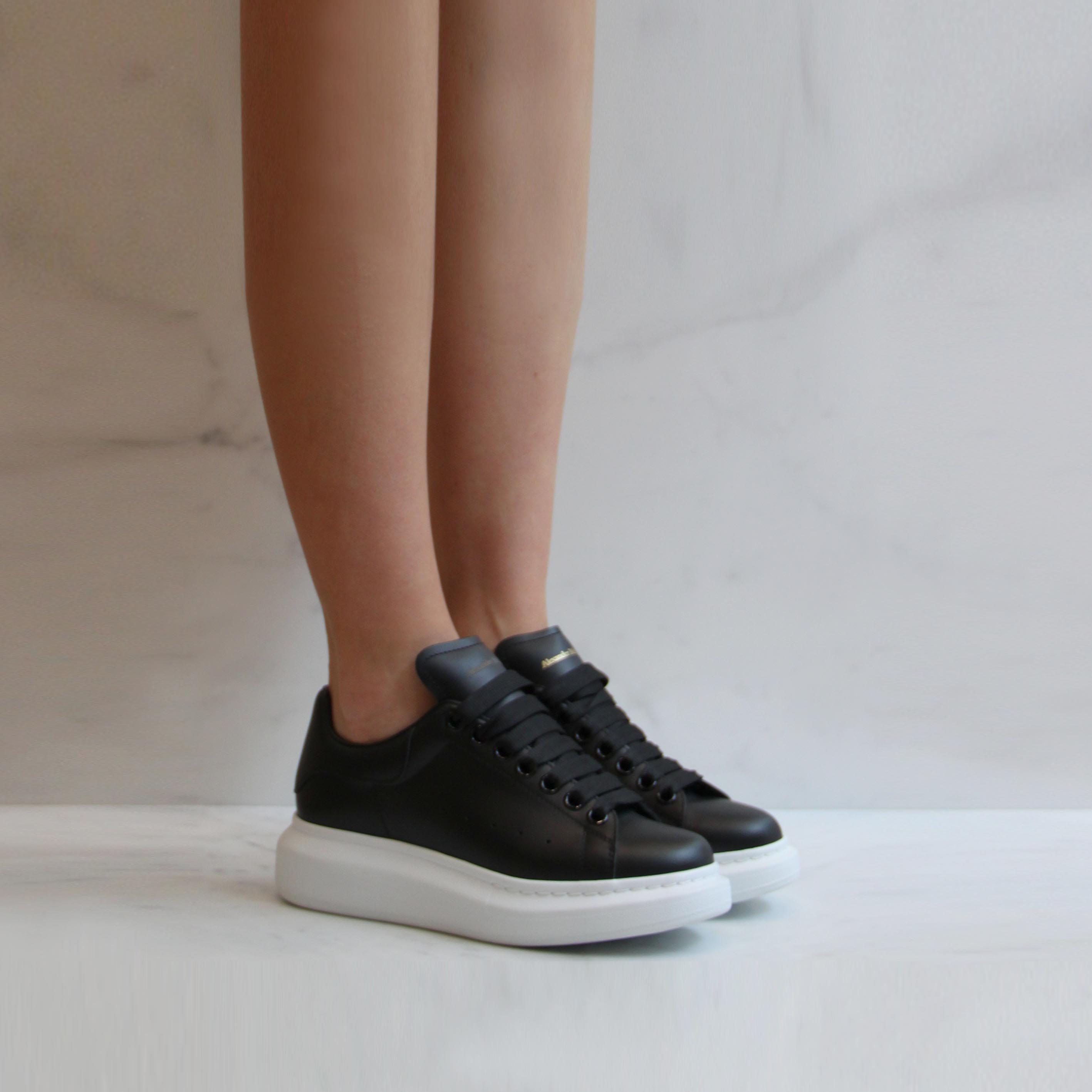 White leather paneled sneakers from Alexander McQueen featuring a round toe, a lace-up front fastening, a brand embossed tongue, a brand embossed insole and a white rubber exaggerated-sole.
