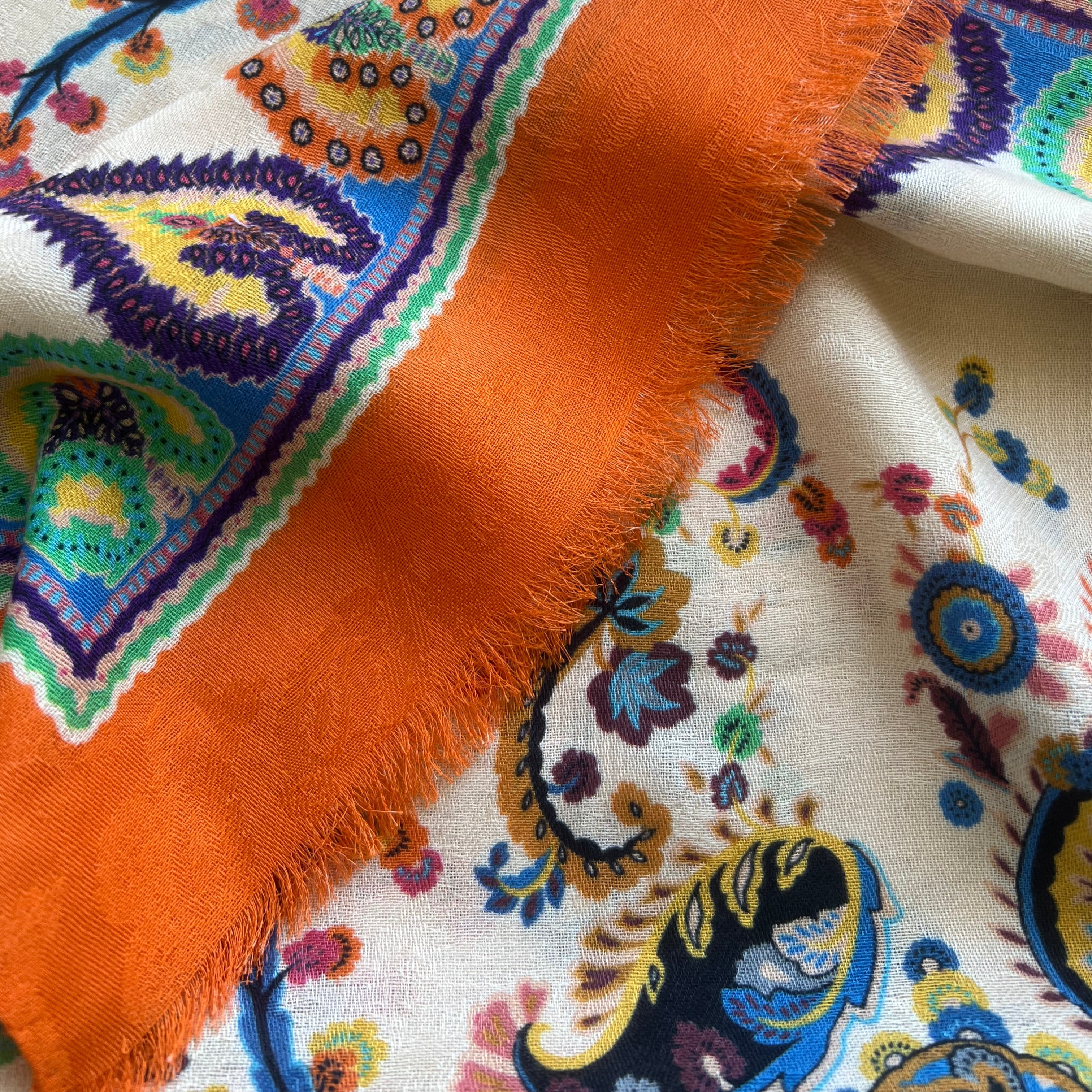 Modal and cotton-blend jacquard scarf embellished with floral-inspired Paisley pattern framed by a medallion motif with contrasting edges. The ETRO logo and slightly frayed short sides complete the design.