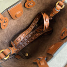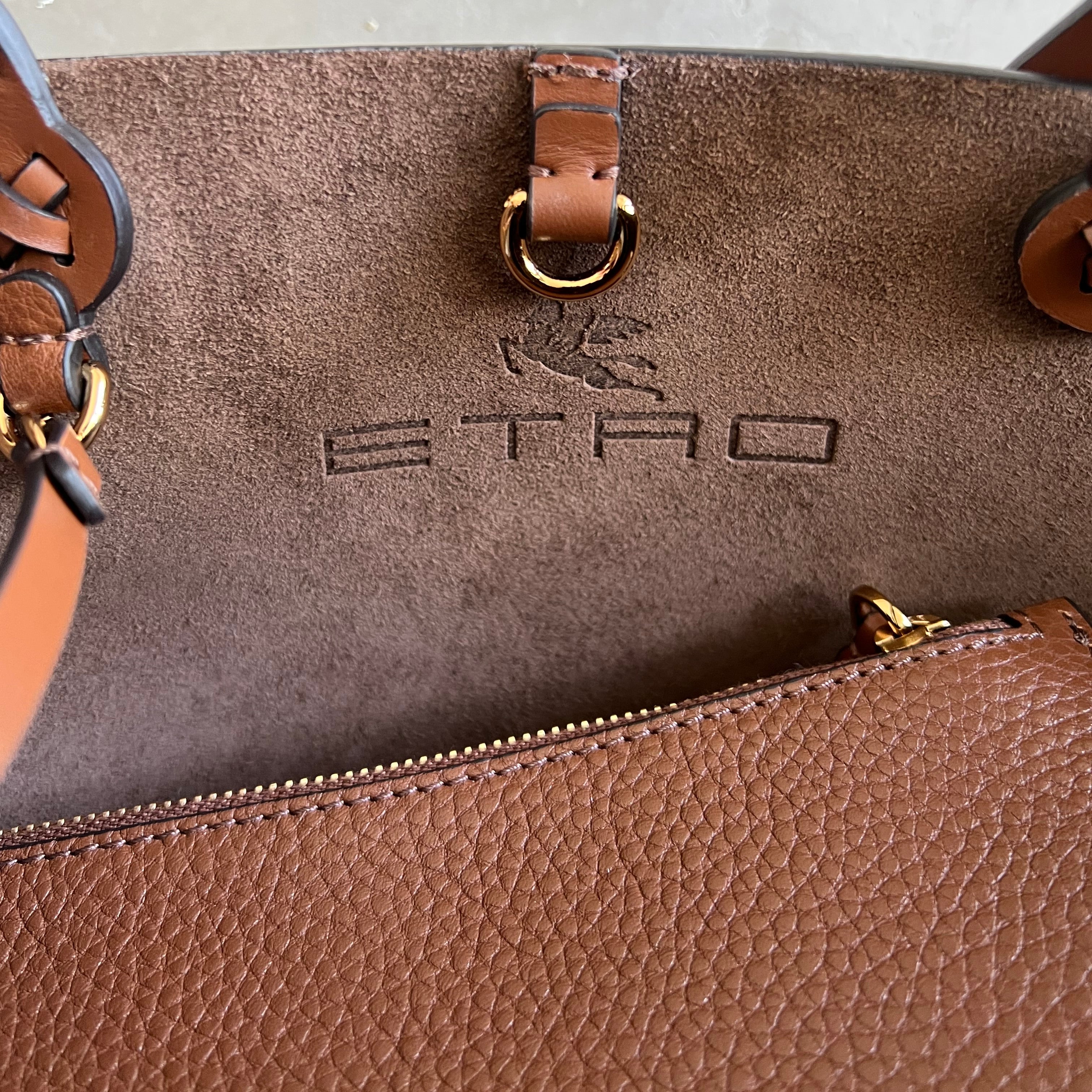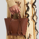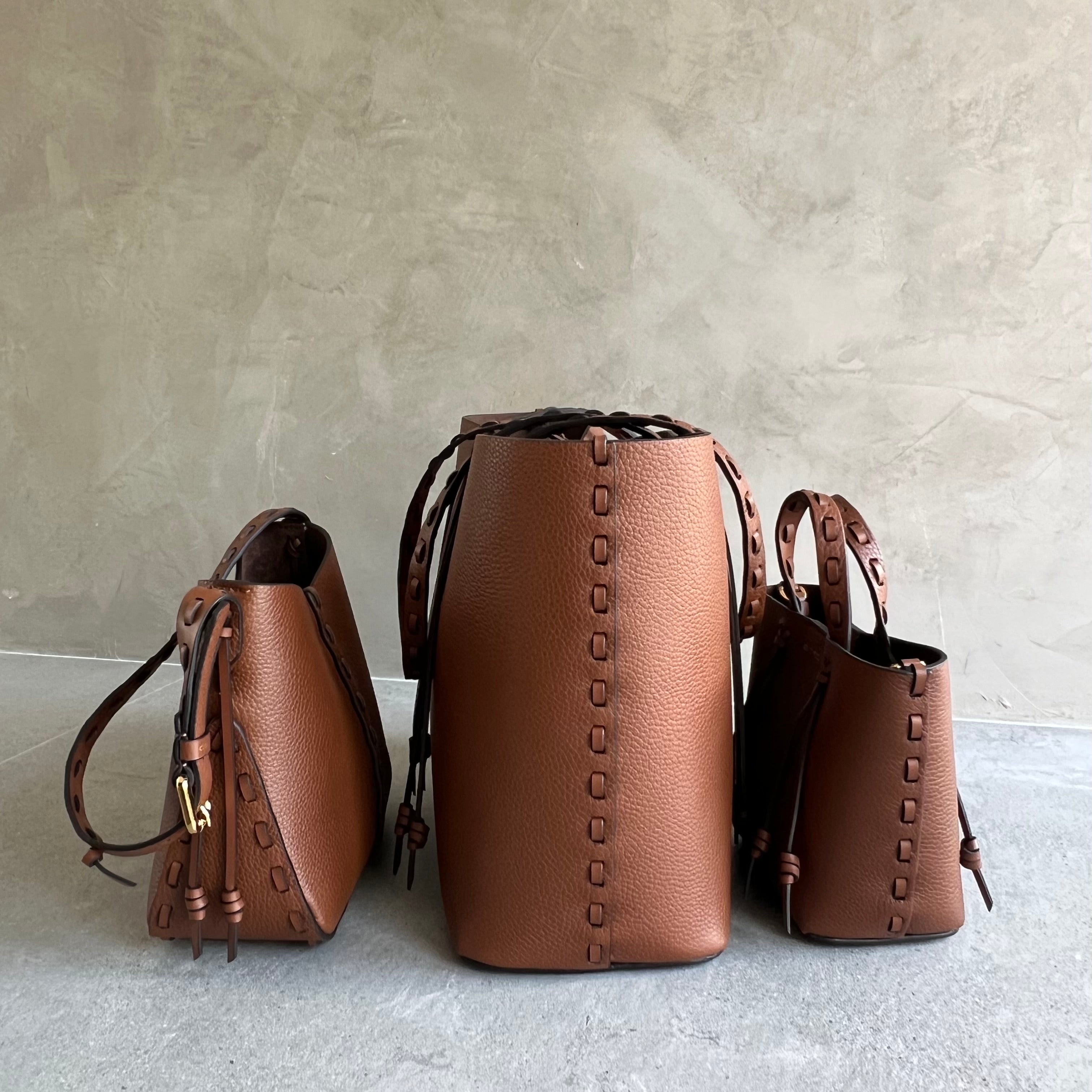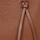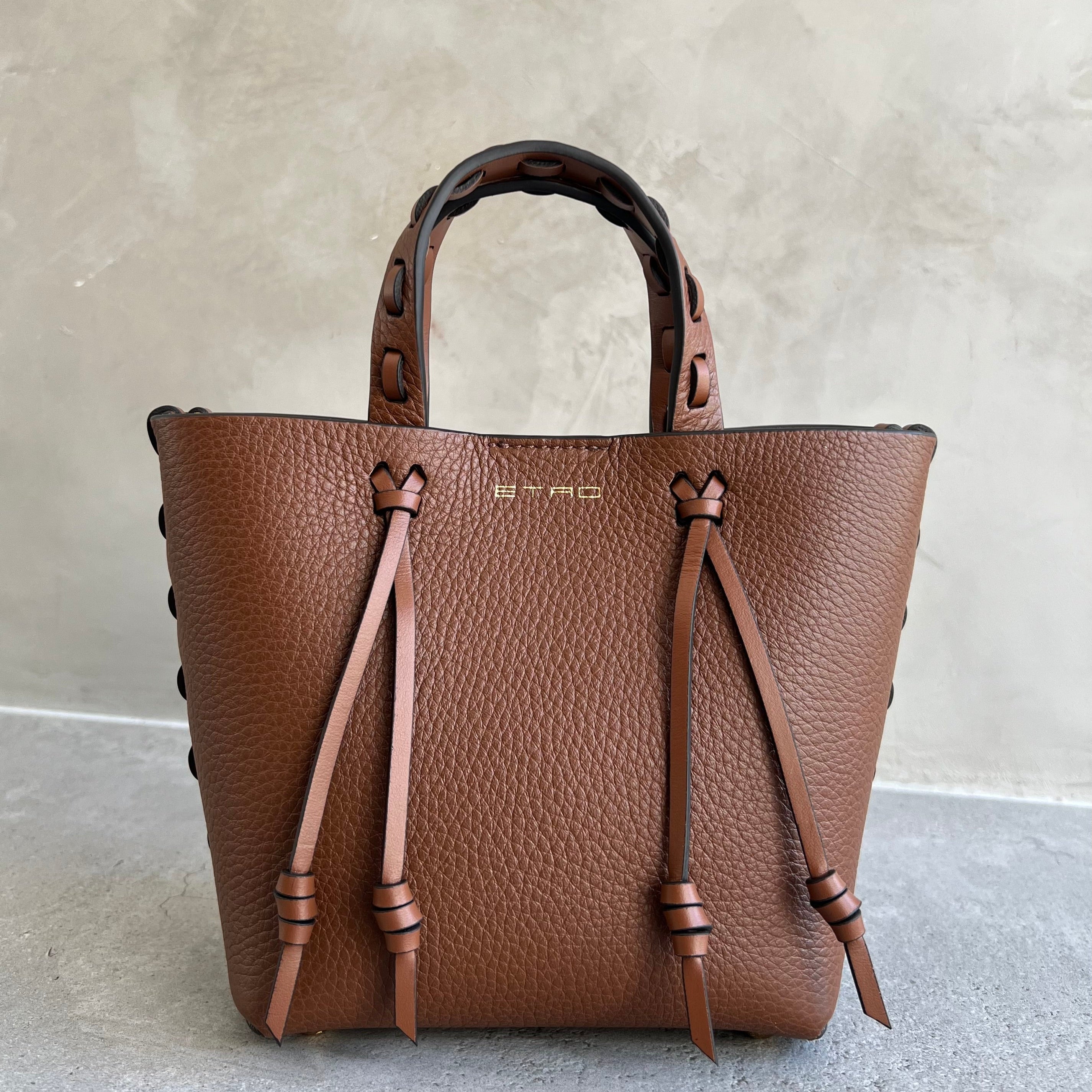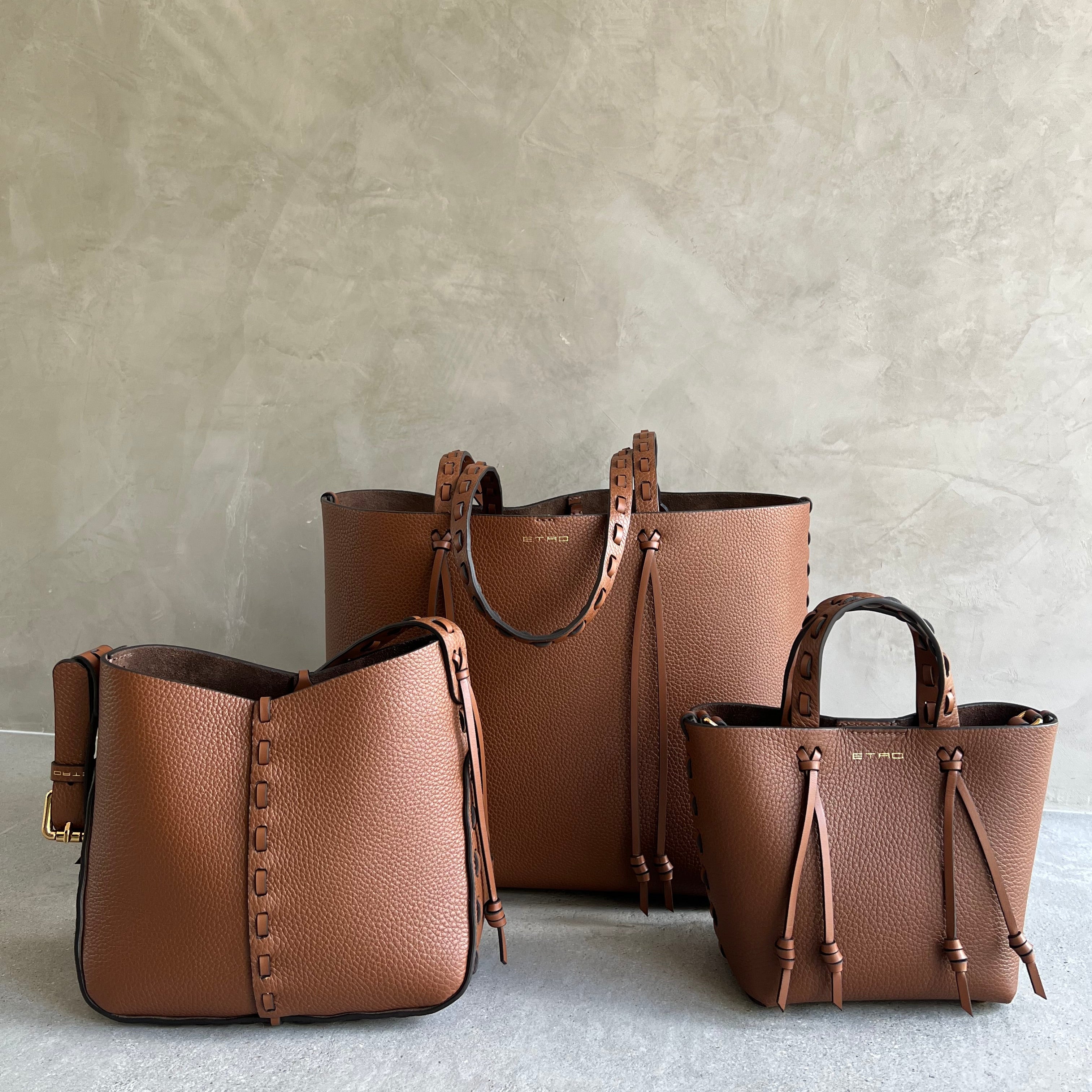 Tote bag in plain-coloured tumbled leather with suede interior. This item boasts a special construction with threading and a handle finished with lacing and knots at the end.
