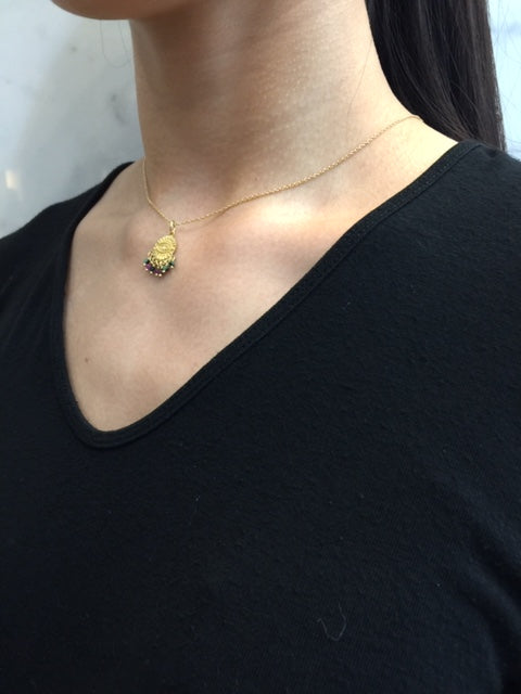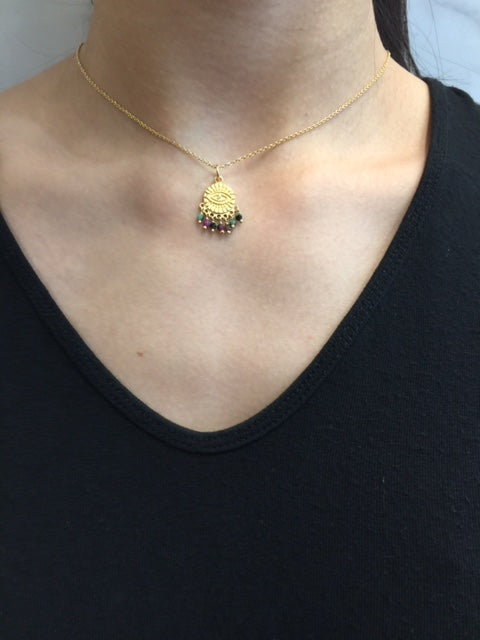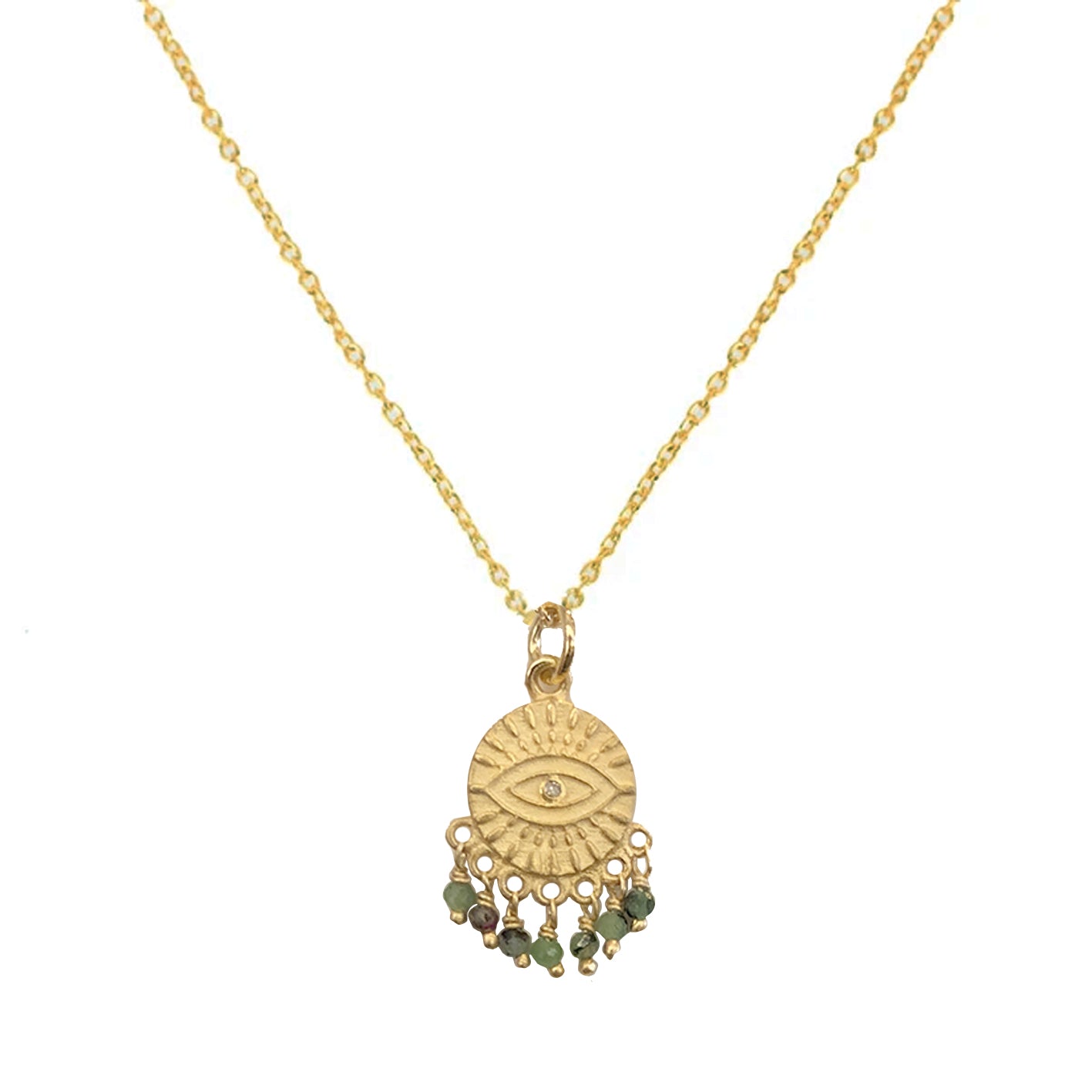 Yellow gold plated necklace featuring a sterling silver evil eye pendant with a white central; diamond. The base of the charm is adorned with ruby zoisite crystals to mimic tears from the eye.