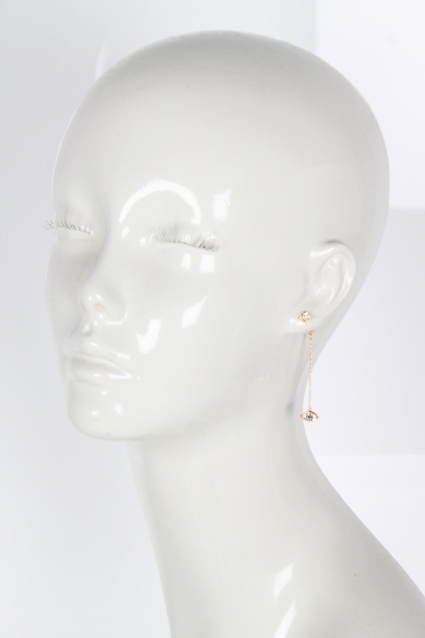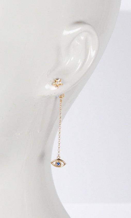 Mini star stud with a bell-back fastening for pierced ears. Finished with a delicate chain that sits behind the ear and features a miniature eye charm.