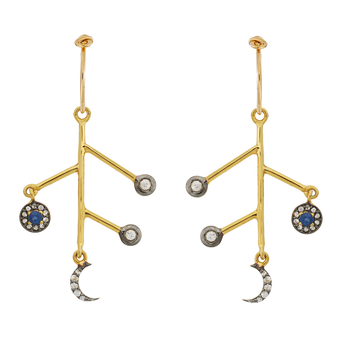 These hoop earrings, featuring a small hanging branch with white sapphires at the tips, adorned with hanging moon and sun charms that are set with blue and white sapphires, Oxidised Around The Stones. Wear them as a pair or mix n match.