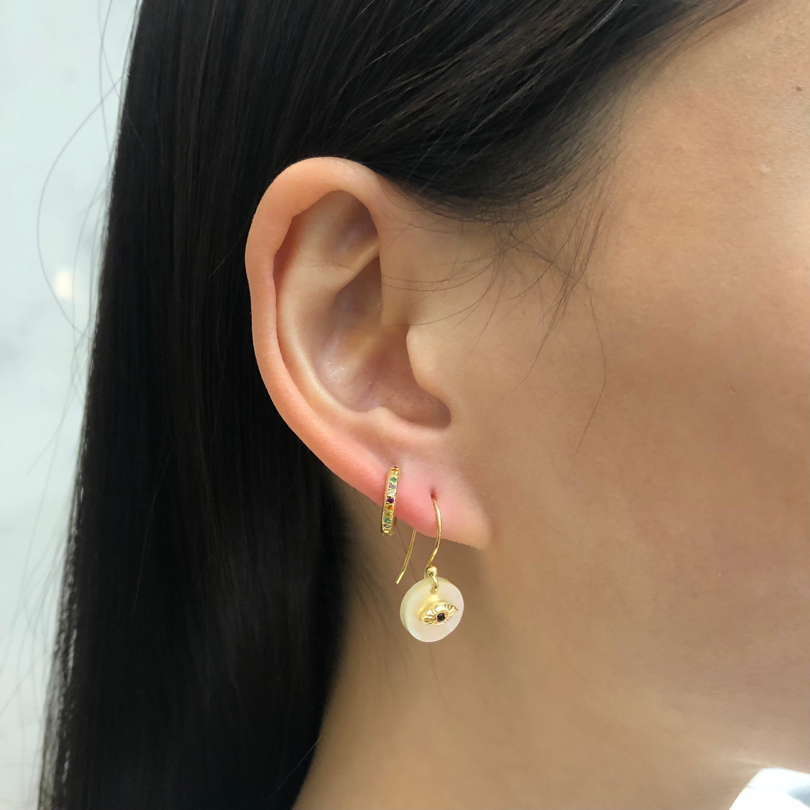 Yellow gold plated evil eye earrings with mother of pearl and black spinel detail,
