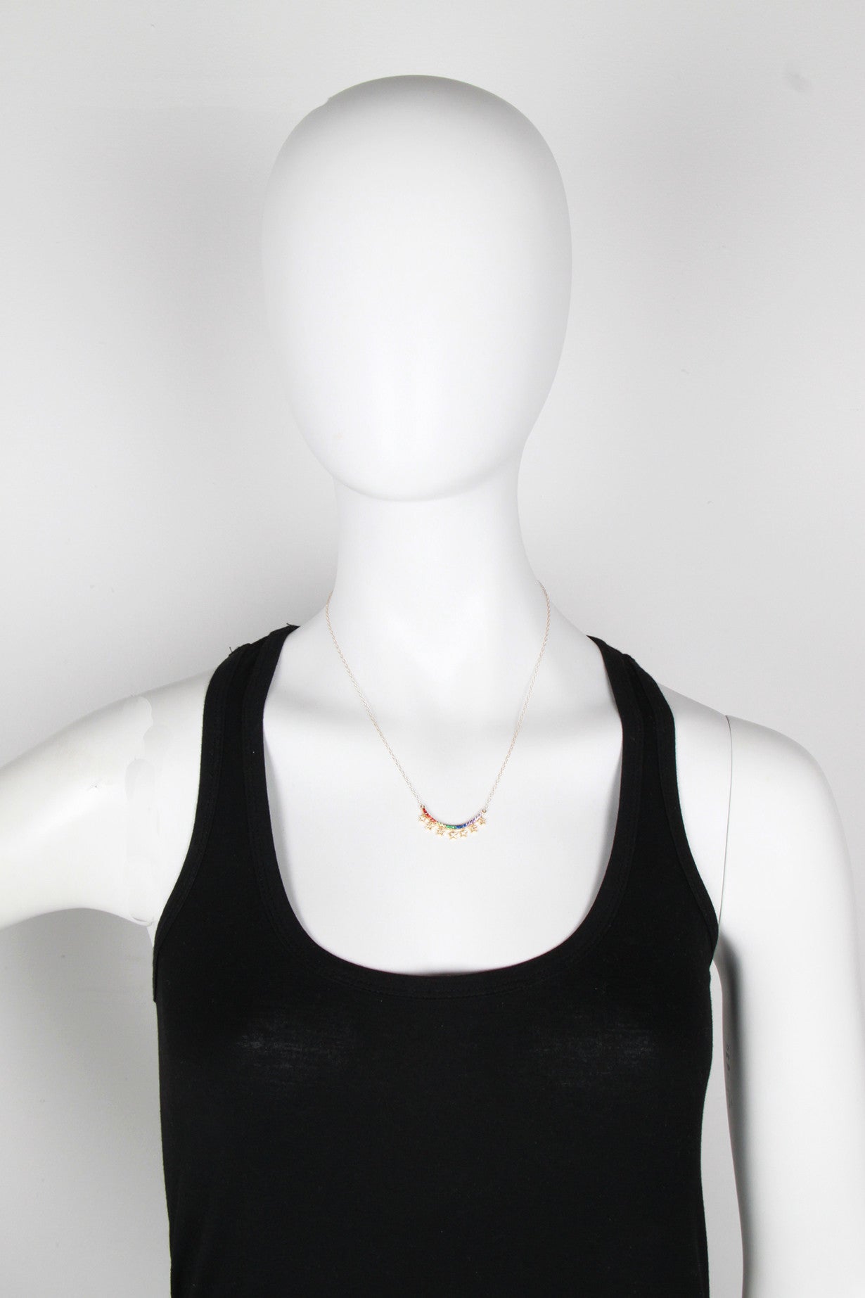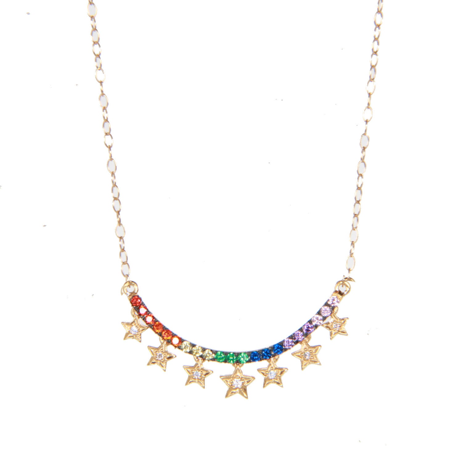 Smiling rainbow necklace featuring zircon crystals and accented with gold stars.