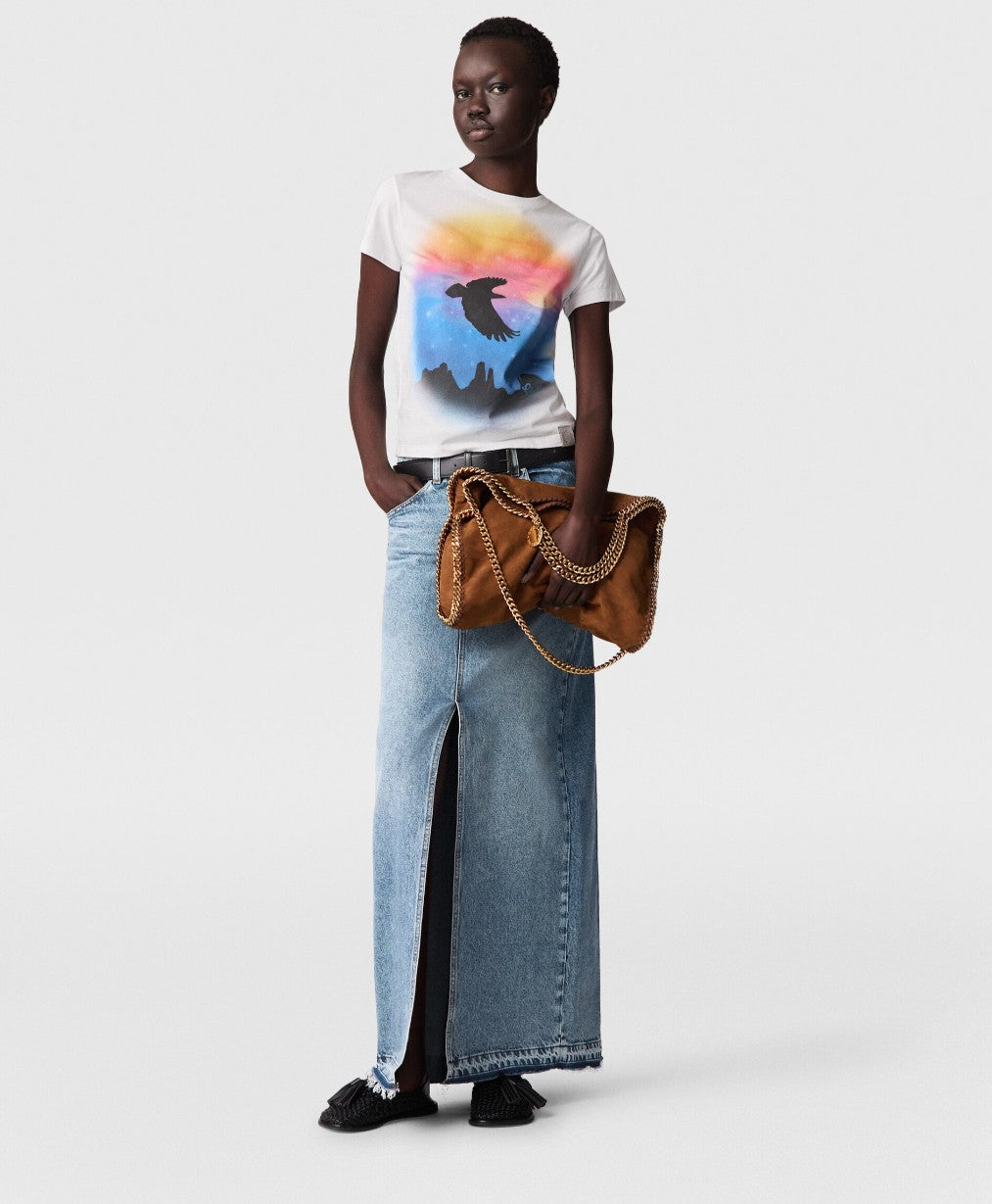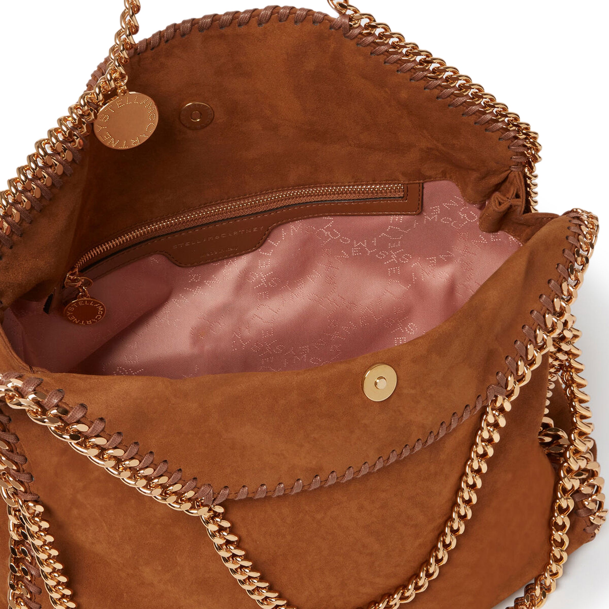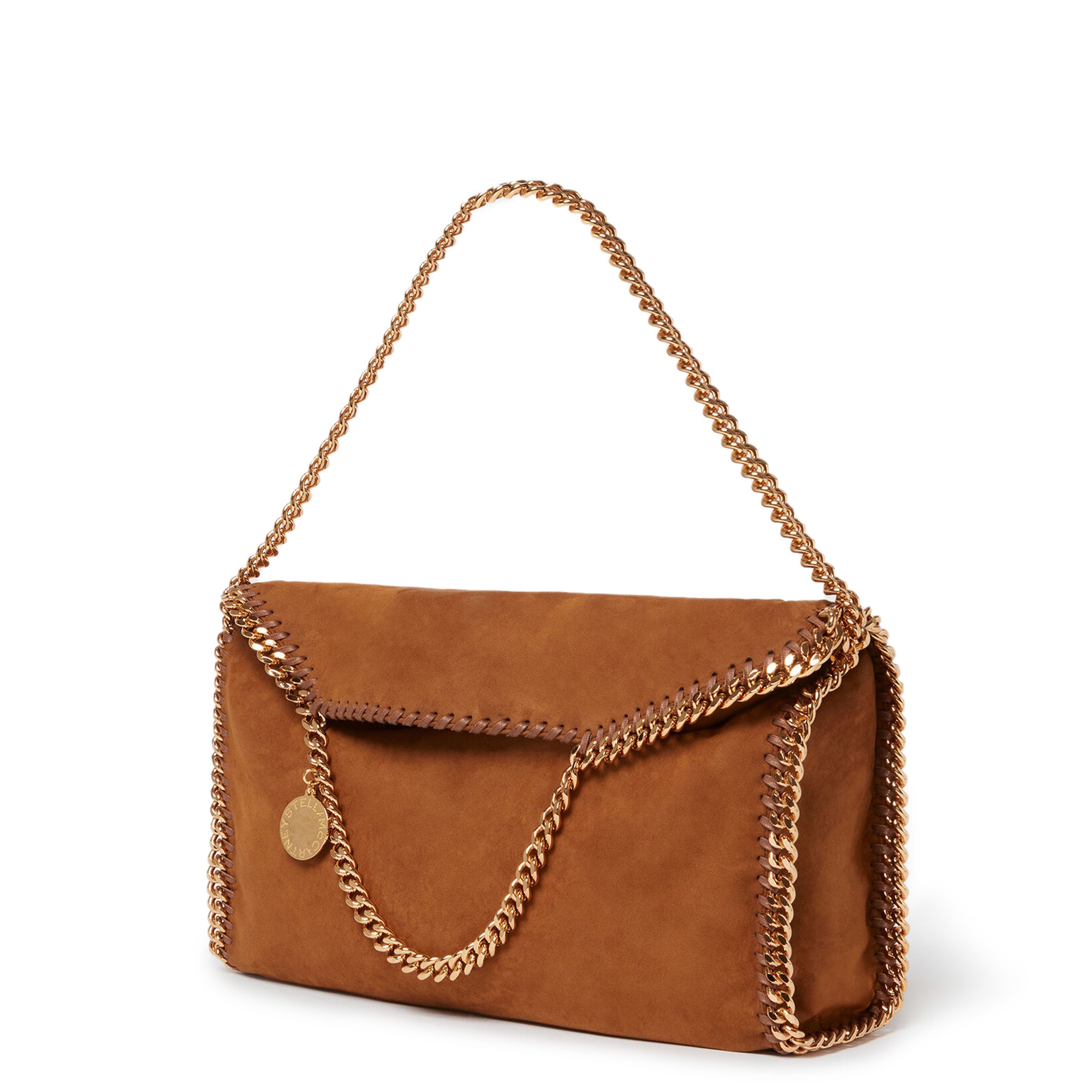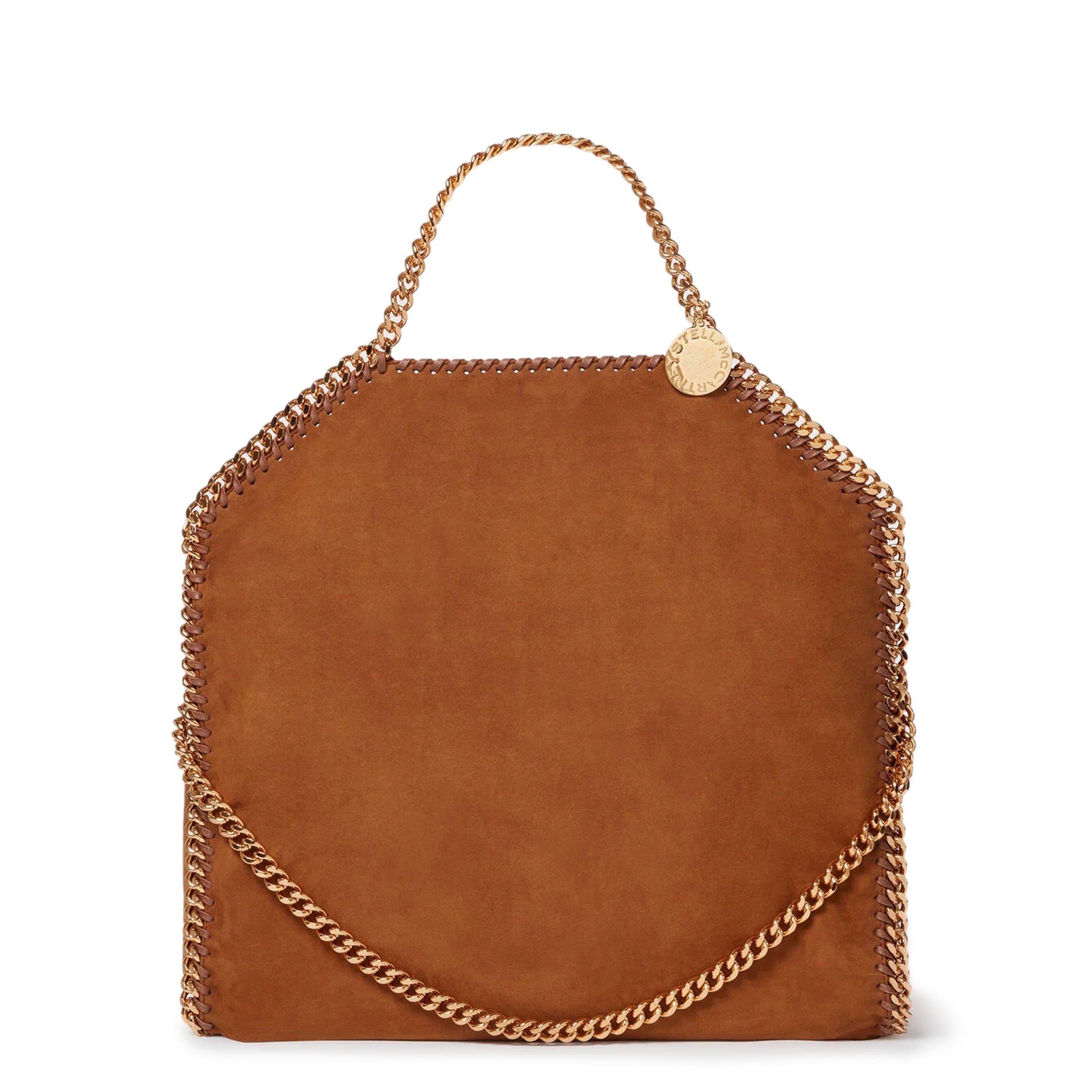 An adaptable iteration of our iconic Falabella tote in a vegan alternative to suede, this fold-over tote bag is infinitely wearable. The signature diamond-cut recycled brass and aluminium chain instantly characterises this dynamic bag. Fully lined with a recycled fabric made from plastic bottles, wear the Falabella fold-over tote in one hand for a classic look or over the shoulder to showcase its duality.