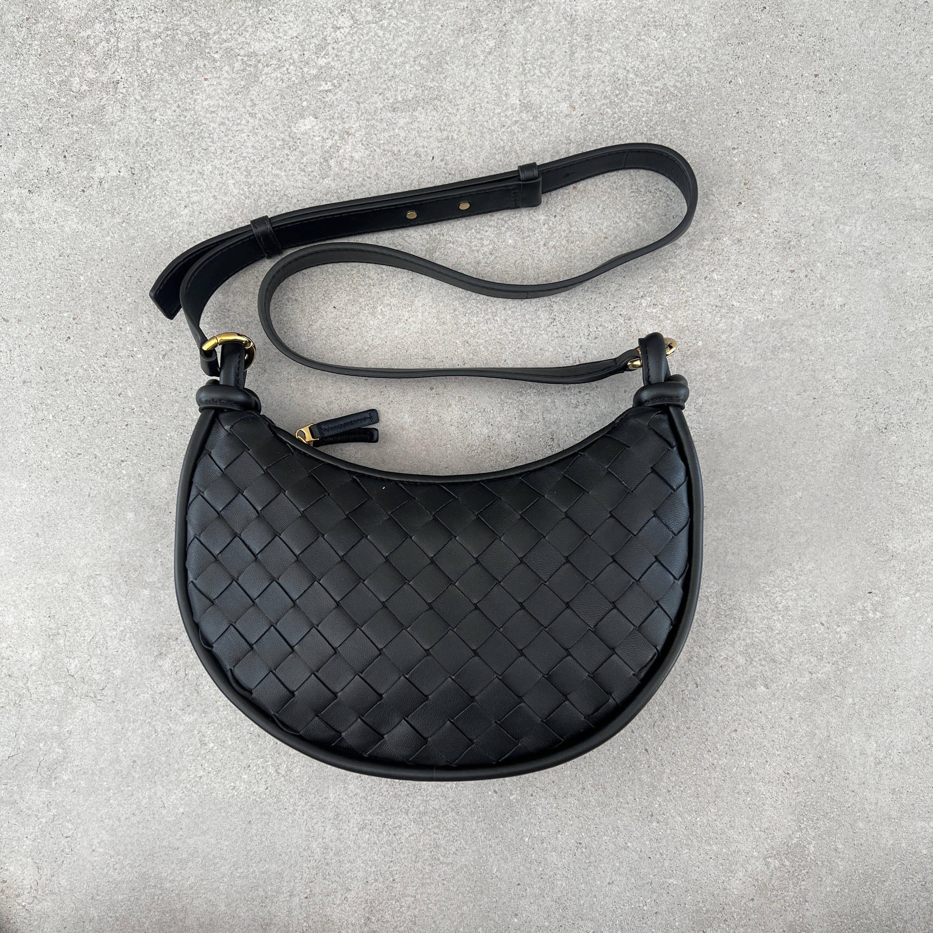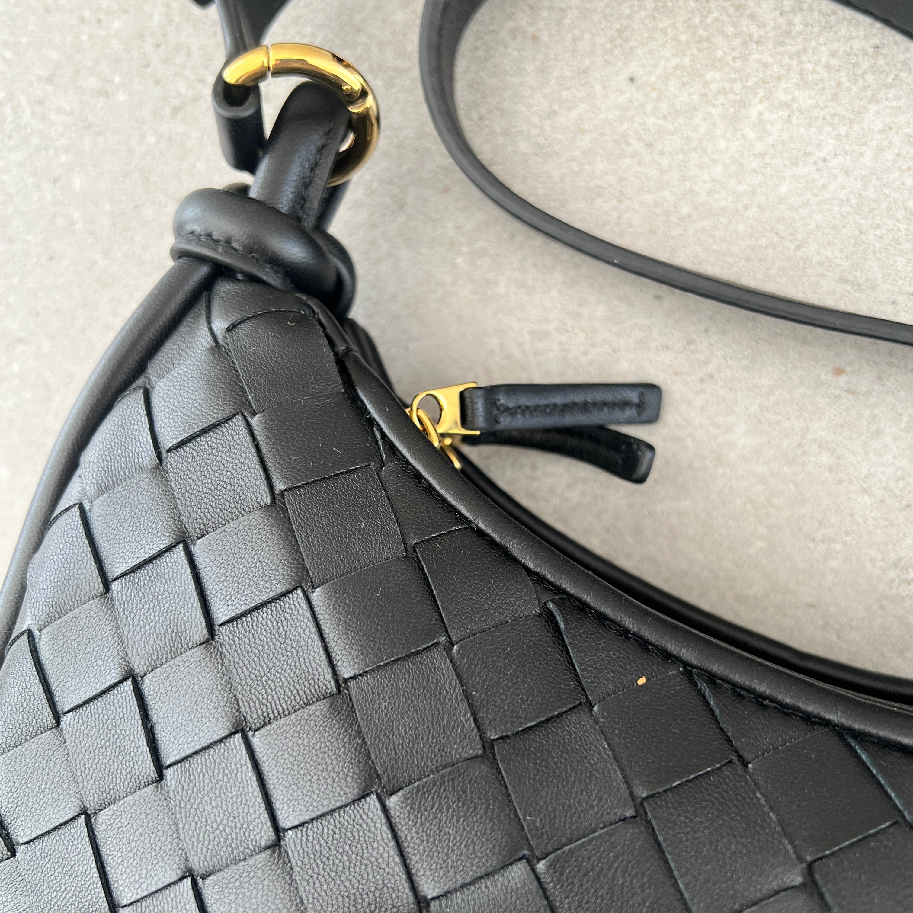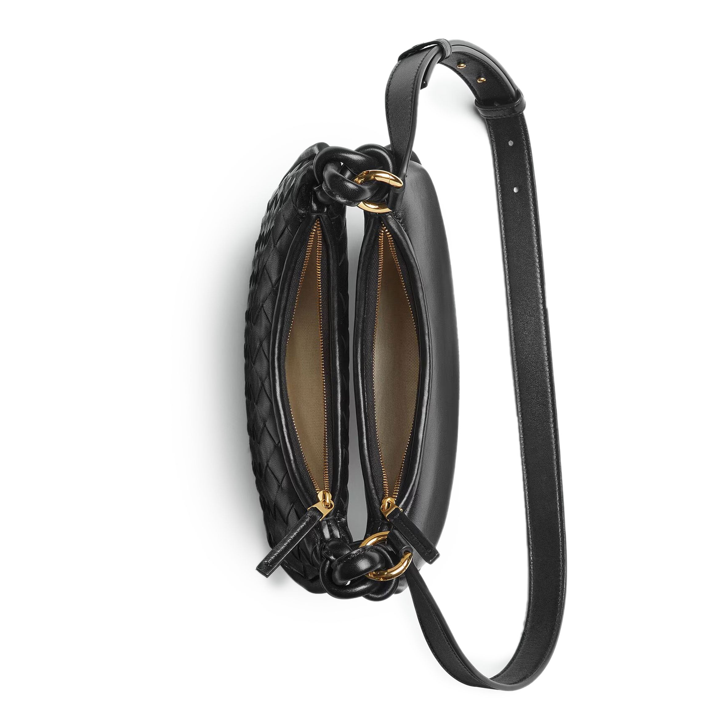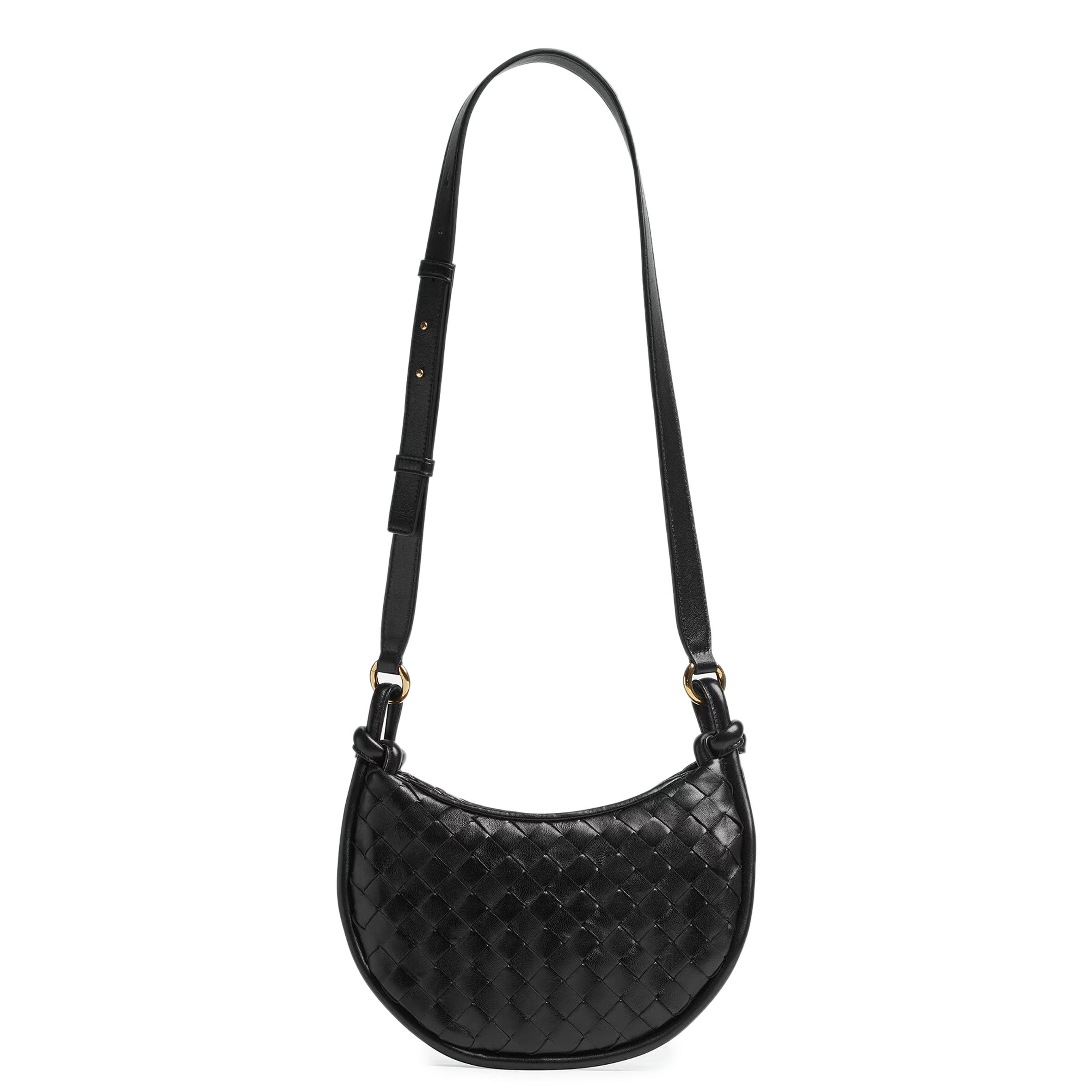 Small Intrecciato and smooth leather half-moon cross-body bag with adjustable strap.