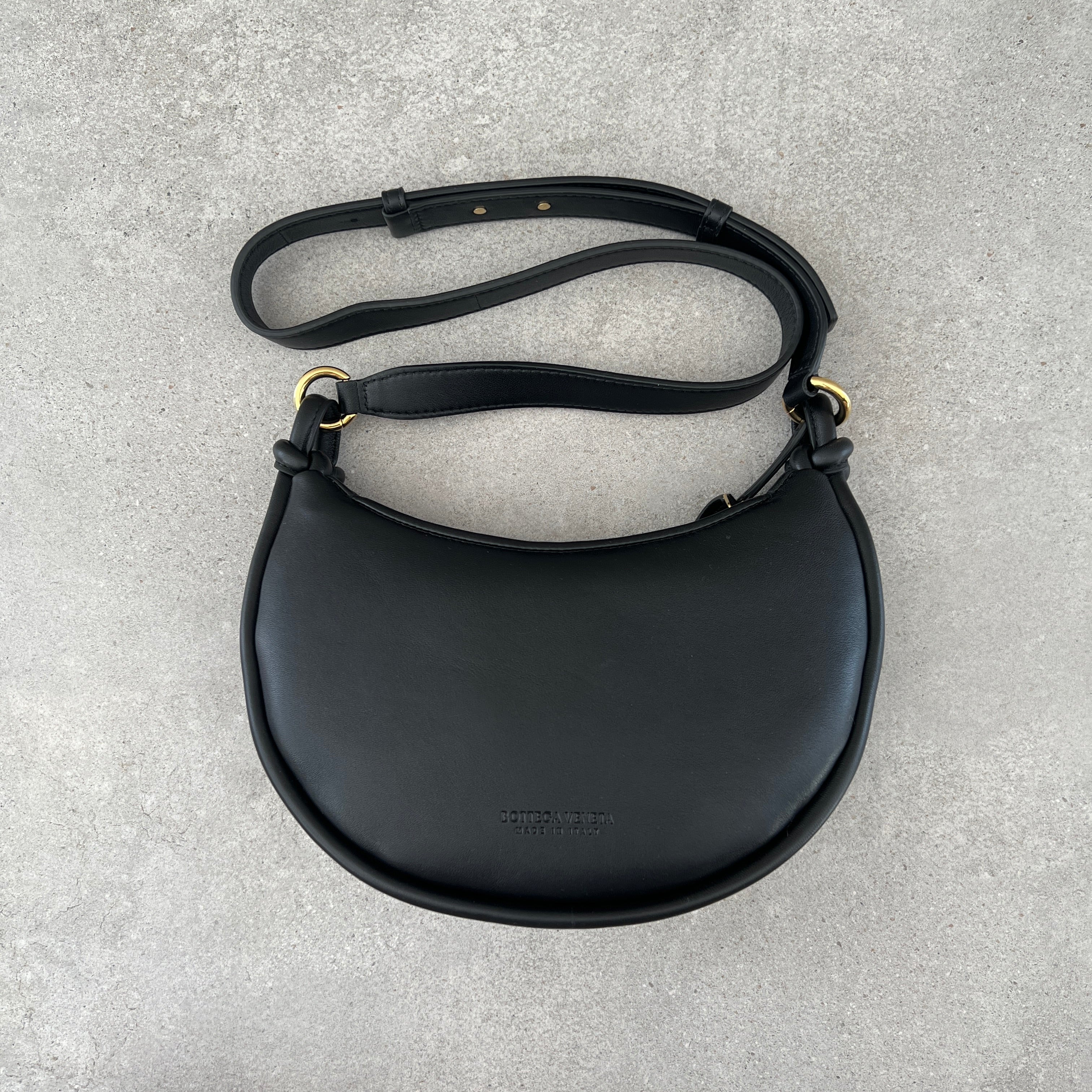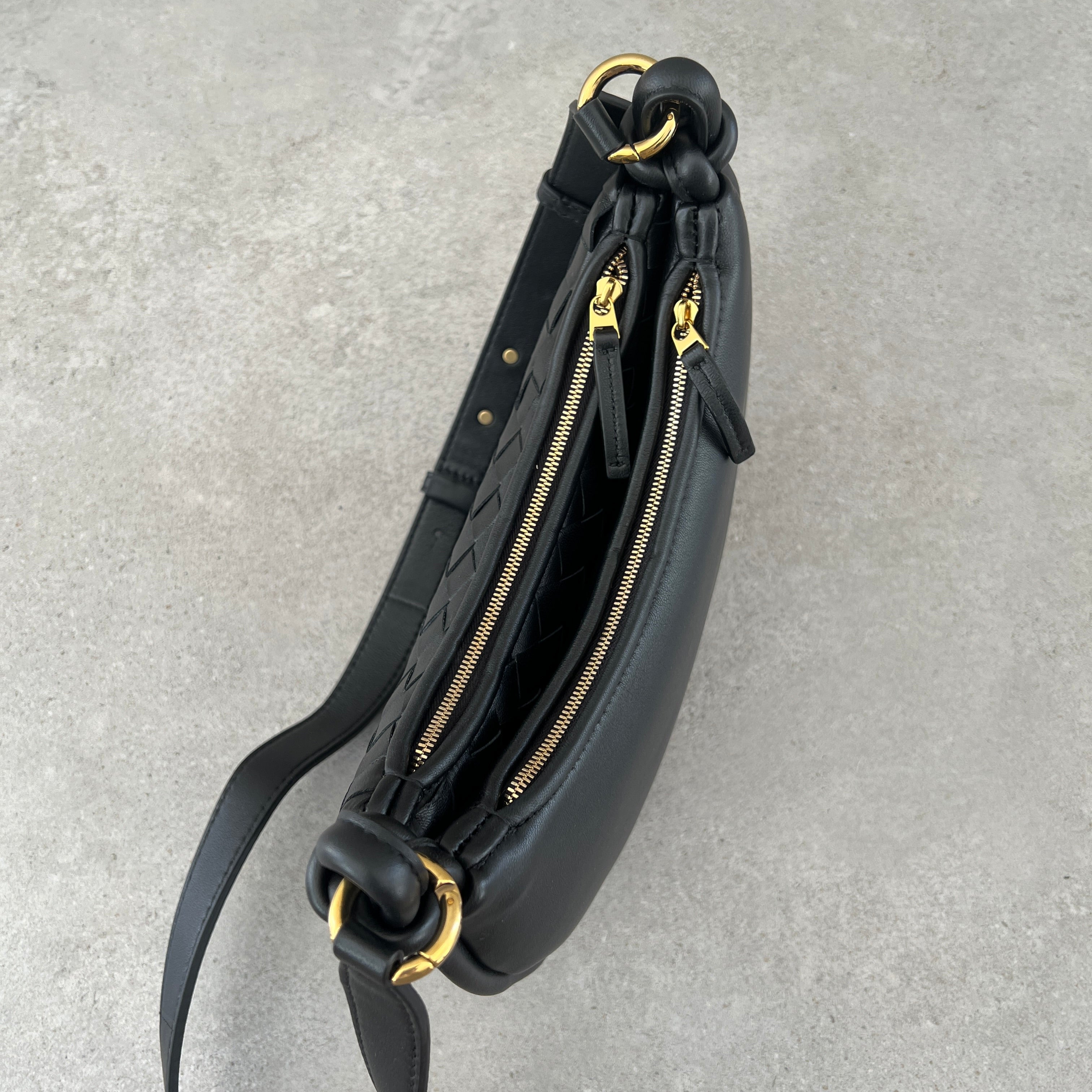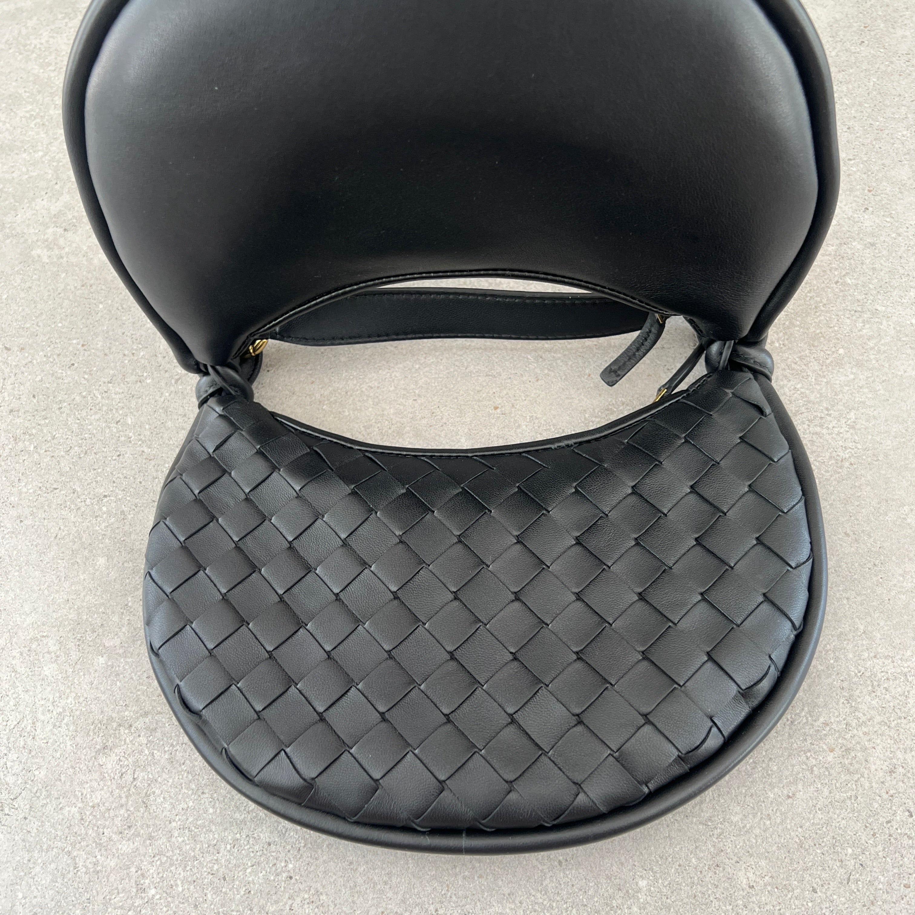 Small Intrecciato and smooth leather half-moon cross-body bag with adjustable strap.