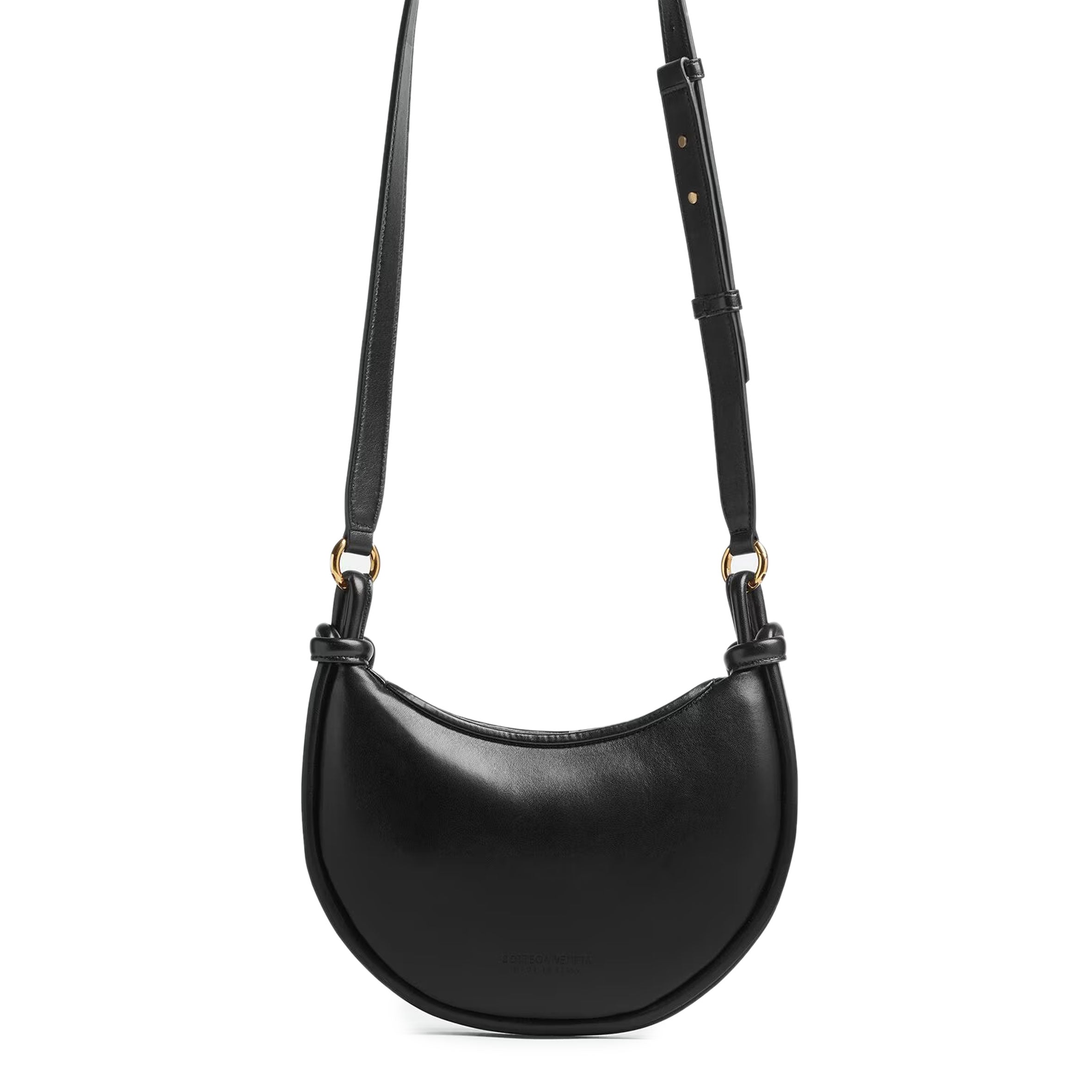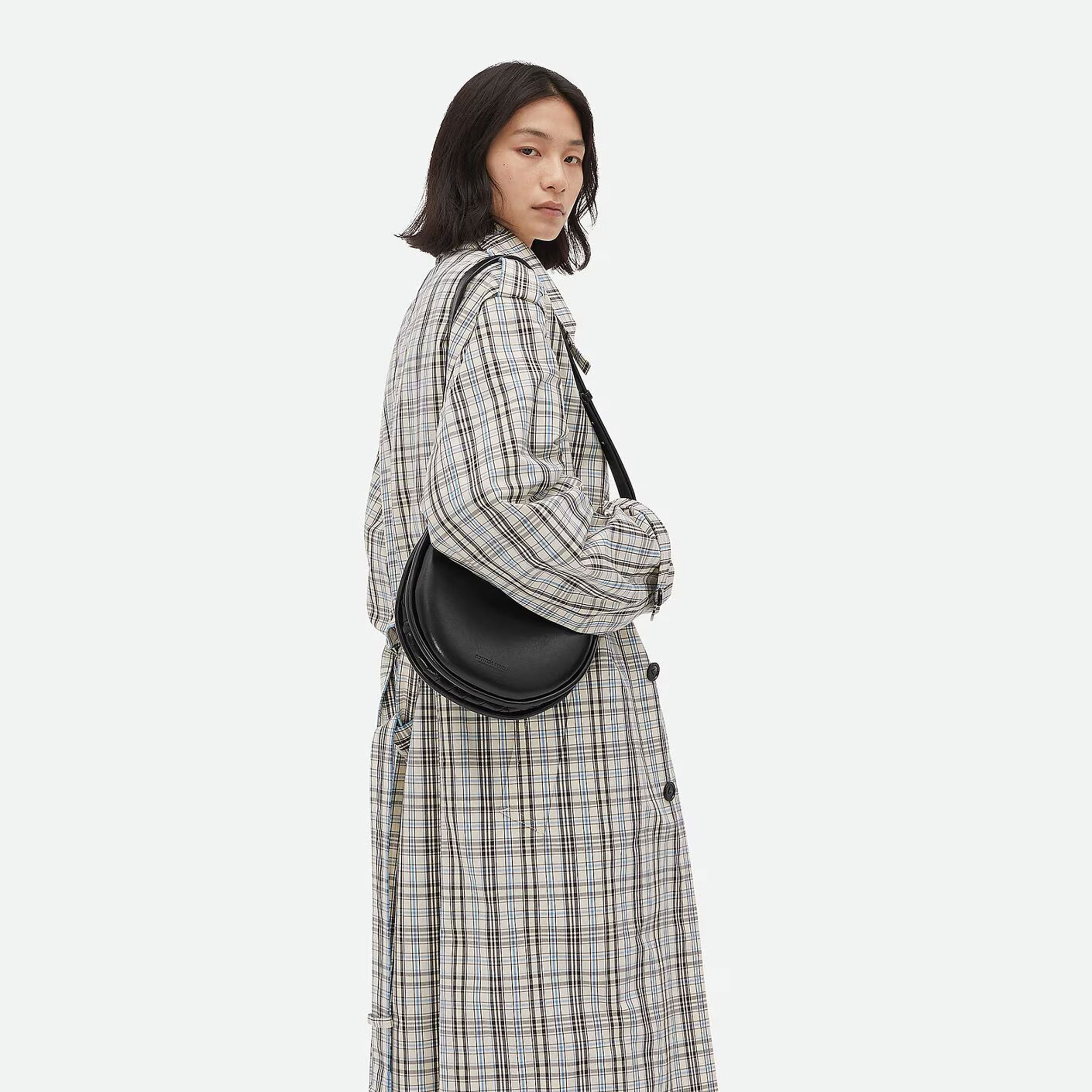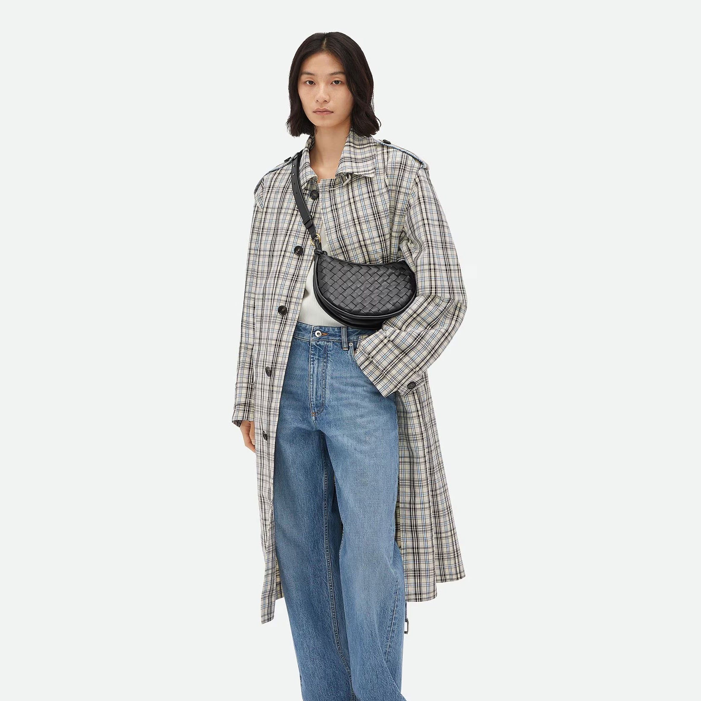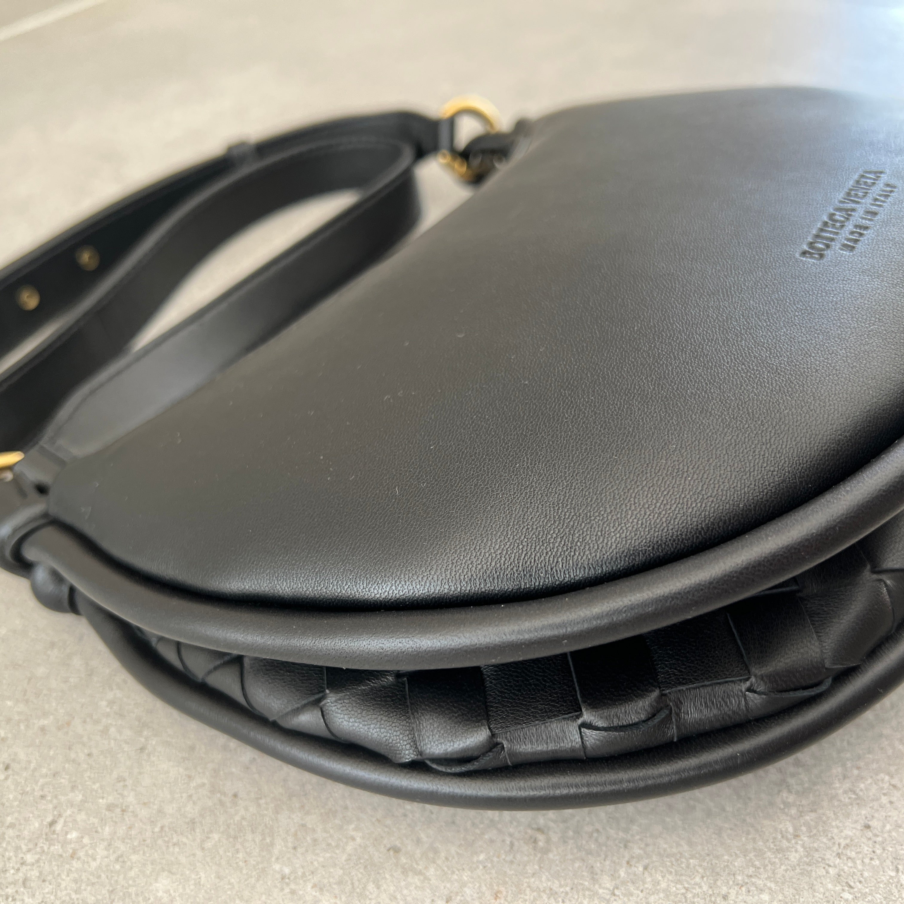 Small Intrecciato and smooth leather half-moon cross-body bag with adjustable strap.