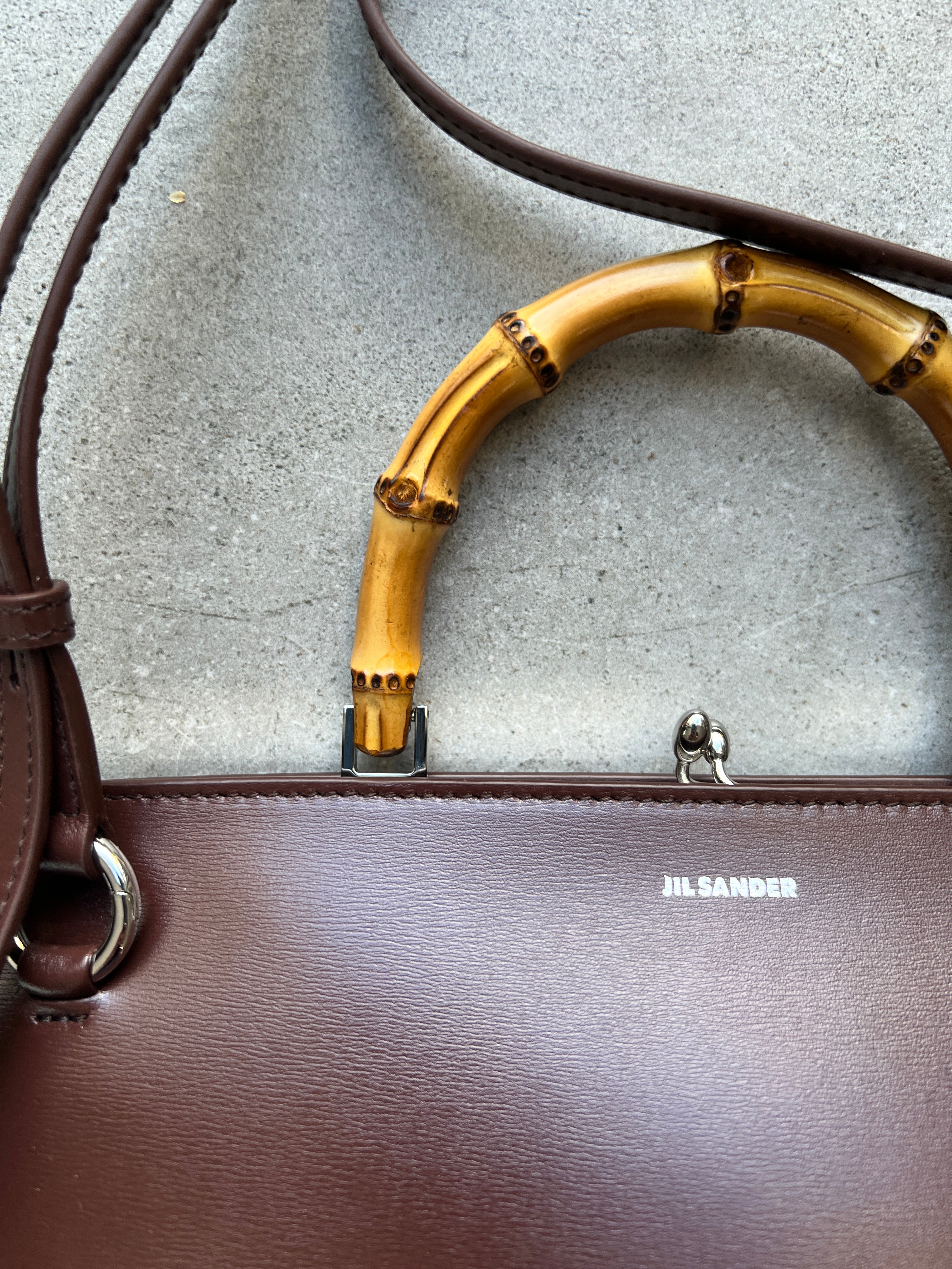 Small calf leather bag with metal frame detail and embossed Jil Sander logo. Leather strap with enamelled finishing and clutch closure with goji berry detail. Nappa lining with one interior zipped pocket and detachable strap. Foil embossed Jil Sander logo.