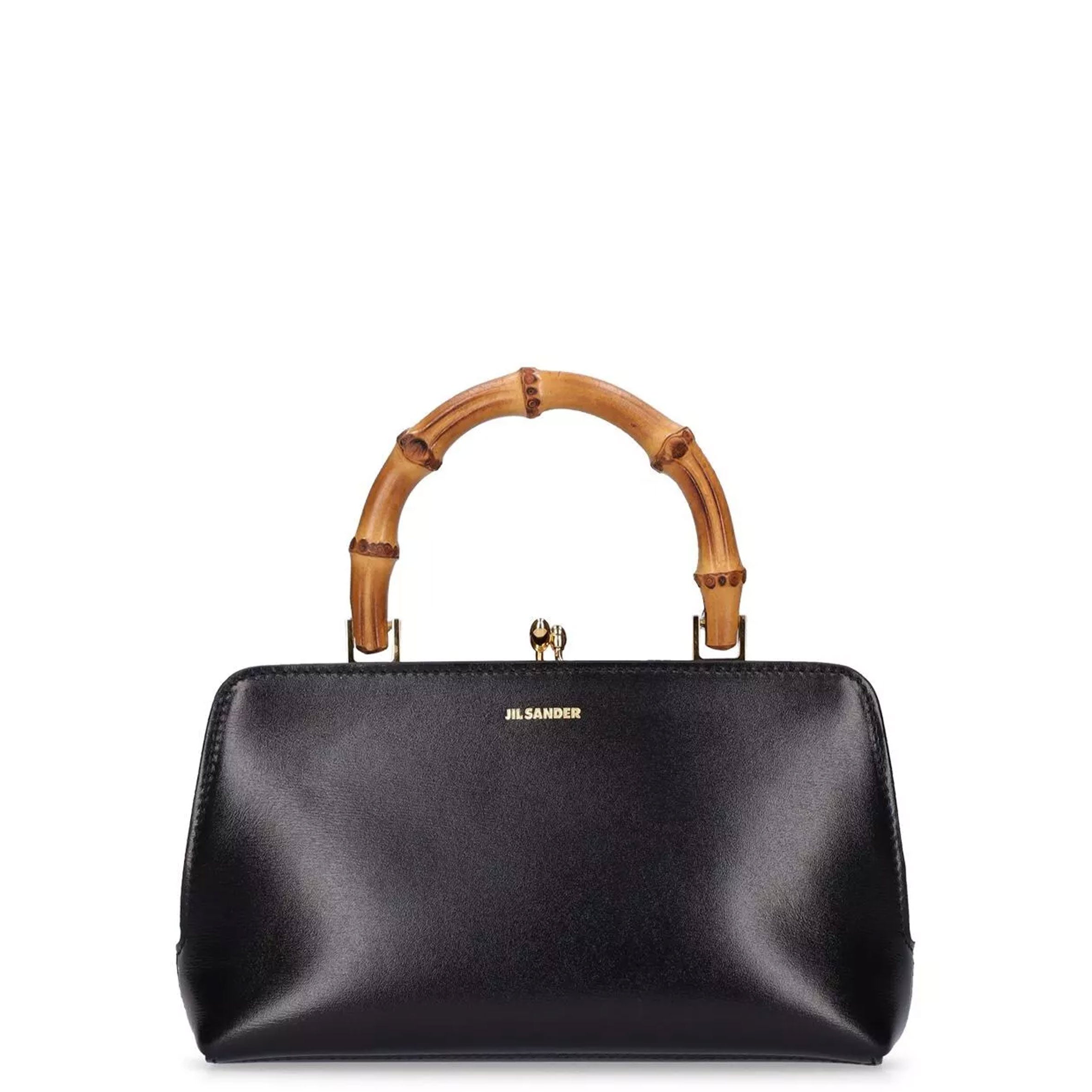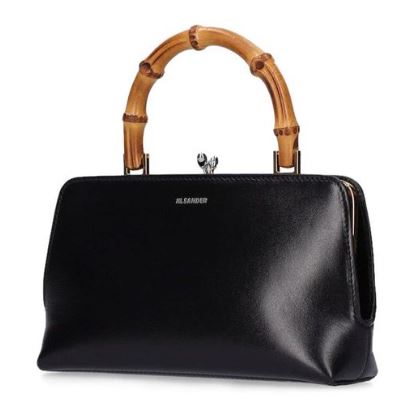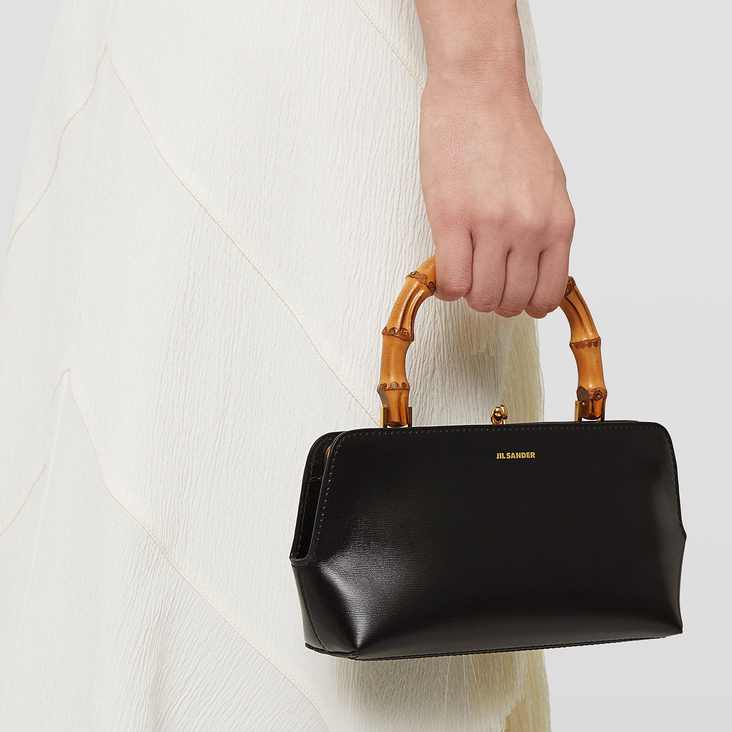 Mini calf leather bag with metal frame detail and embossed Jil Sander logo. Bamboo handle with enamelled finishing and clutch closure with goji berry detail. Nappa lining with one interior zipped pocket and detachable strap. Foil embossed Jil Sander logo.