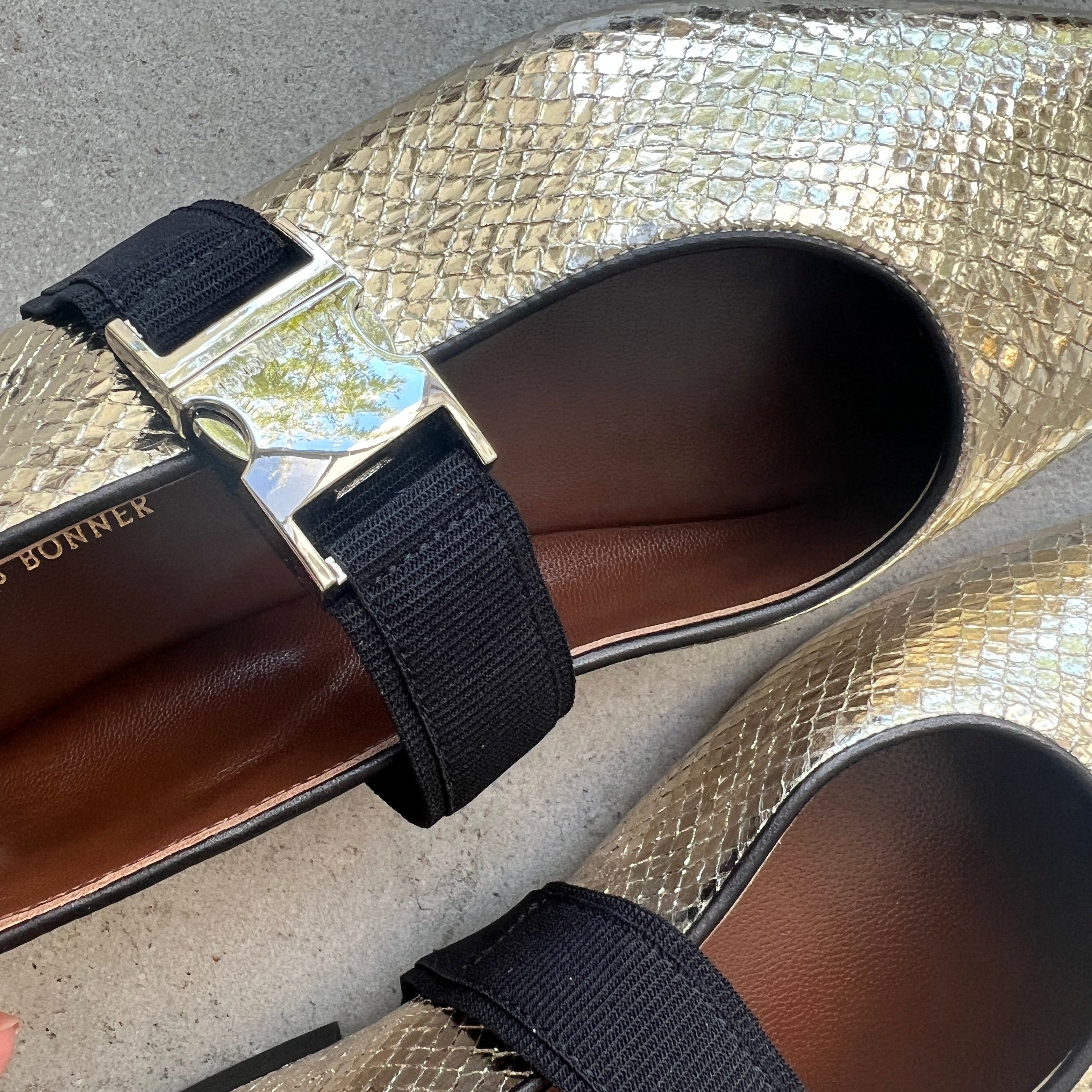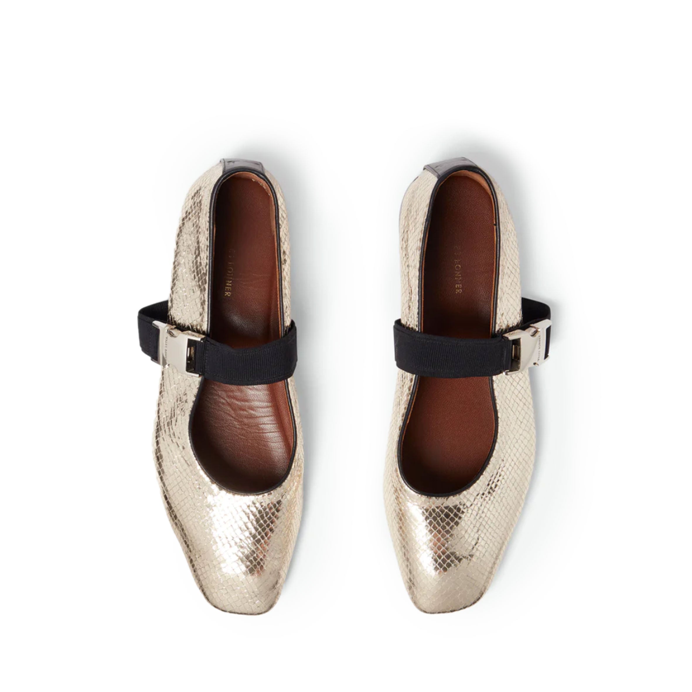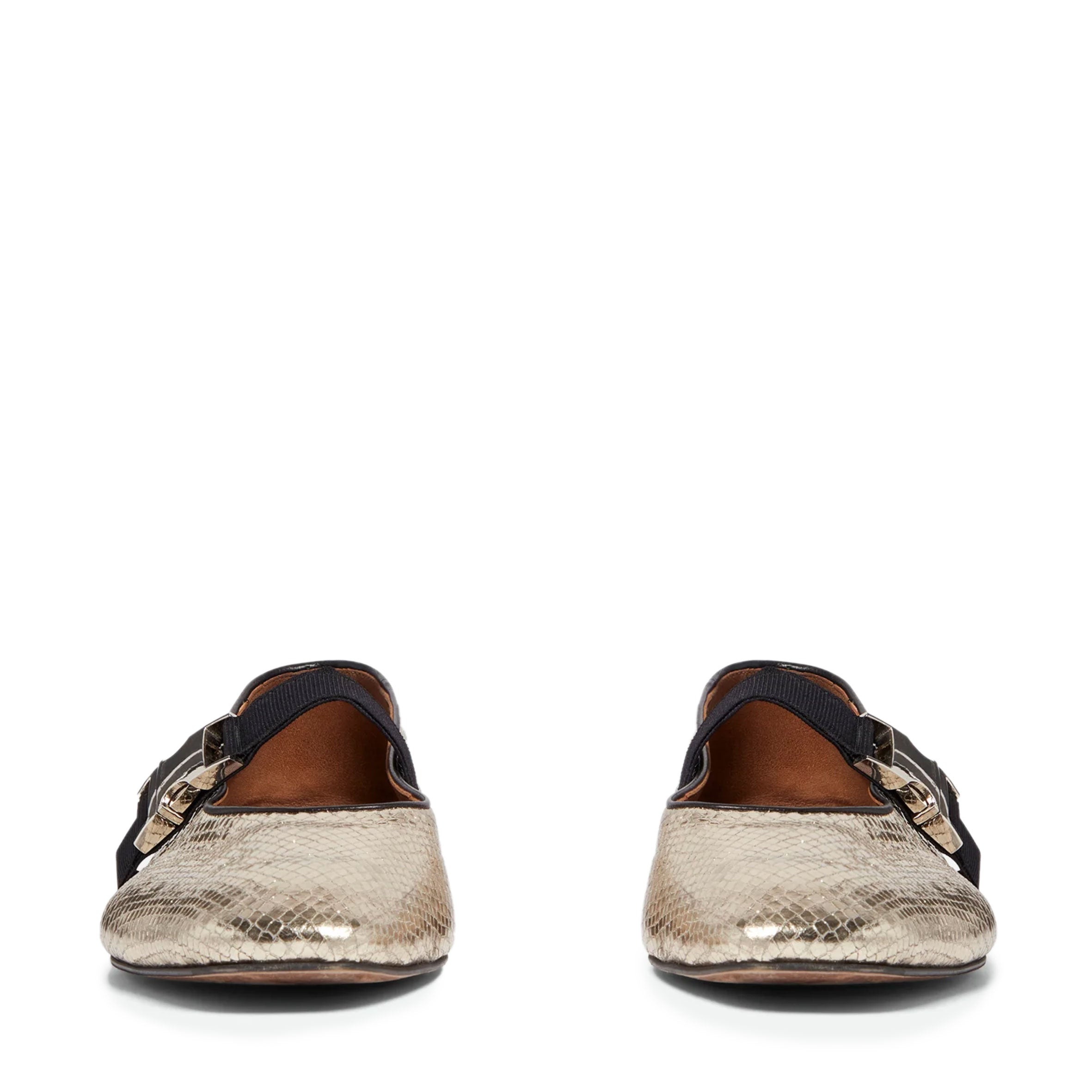 The Glide Slippers shine with gold printed lambskin leather and a silver metal buckle.