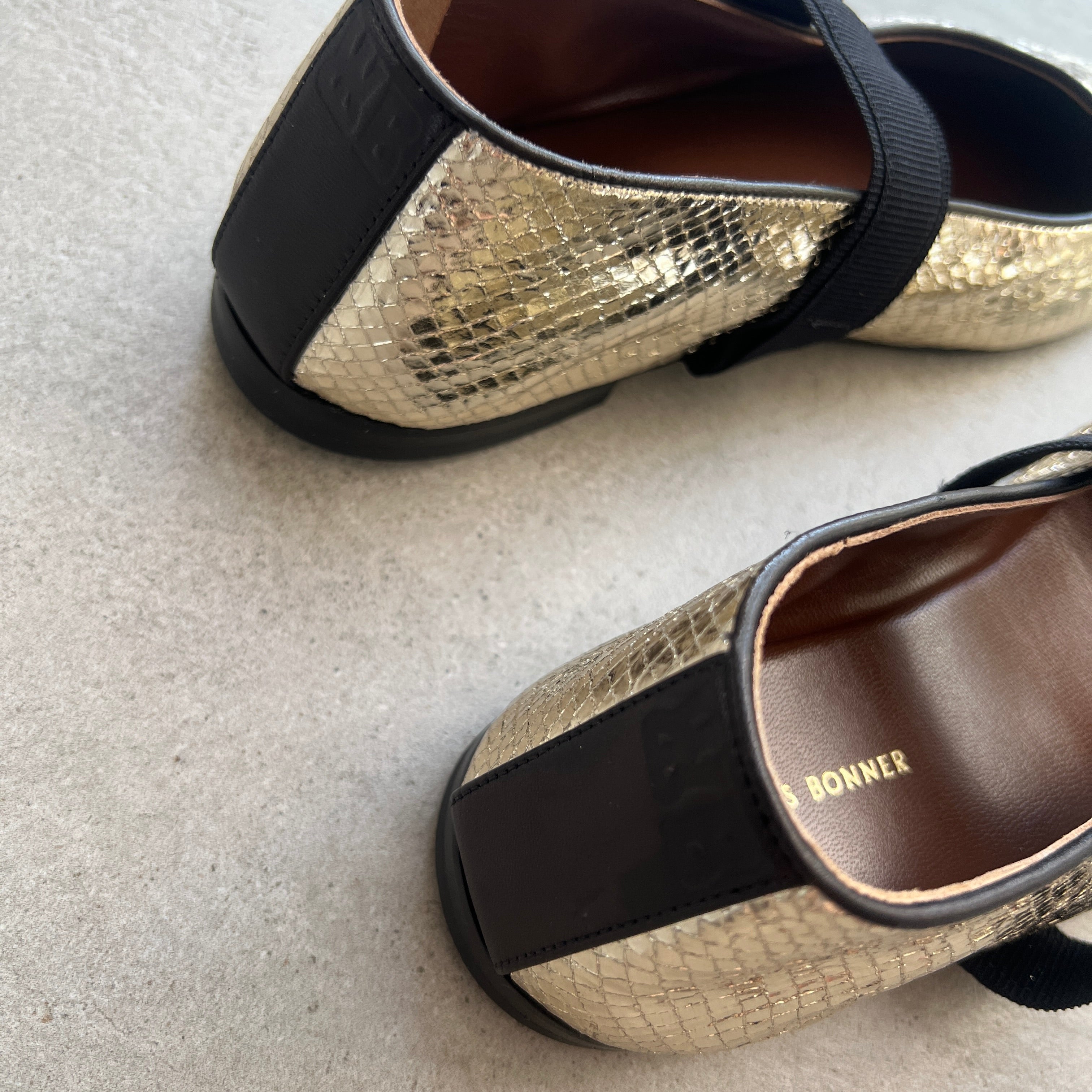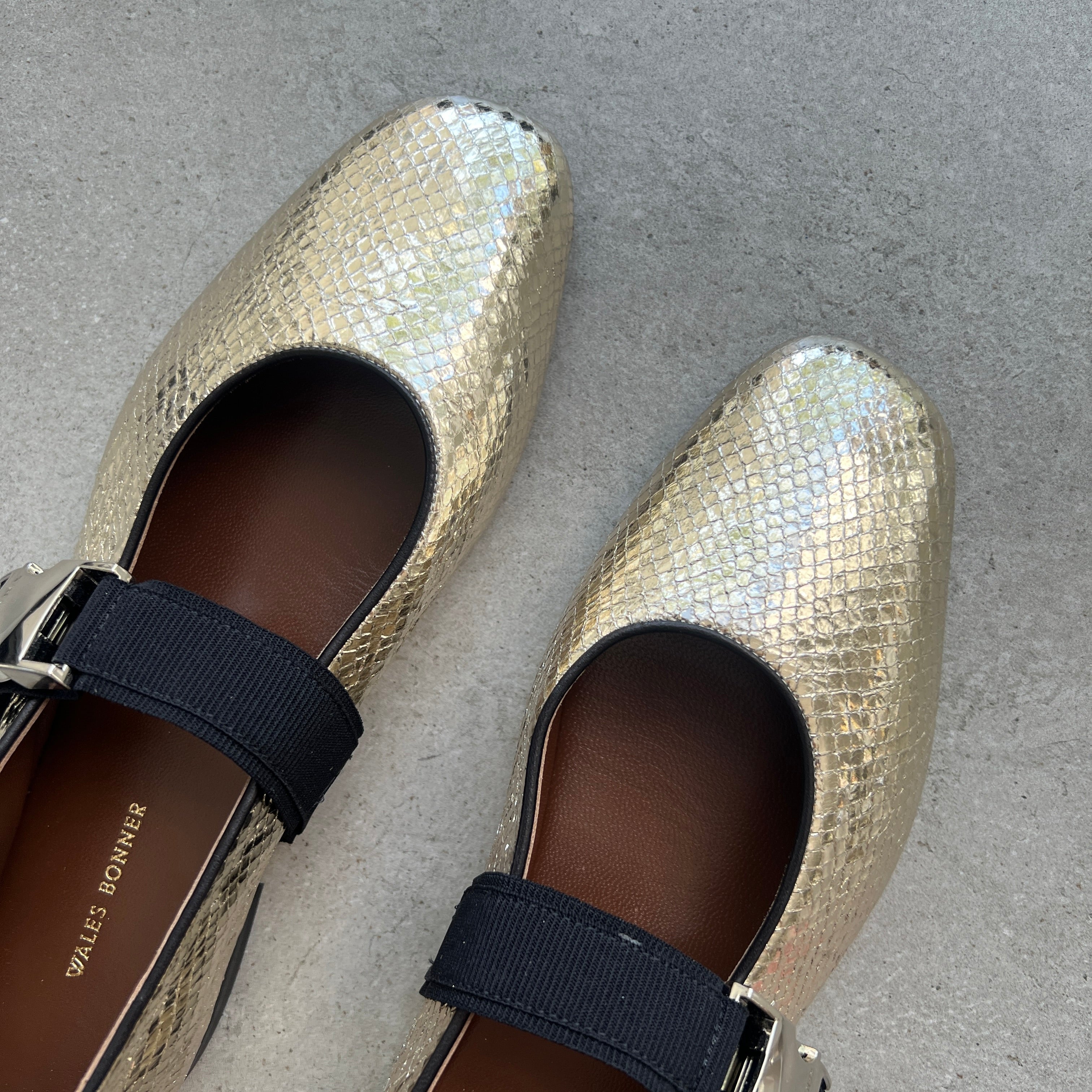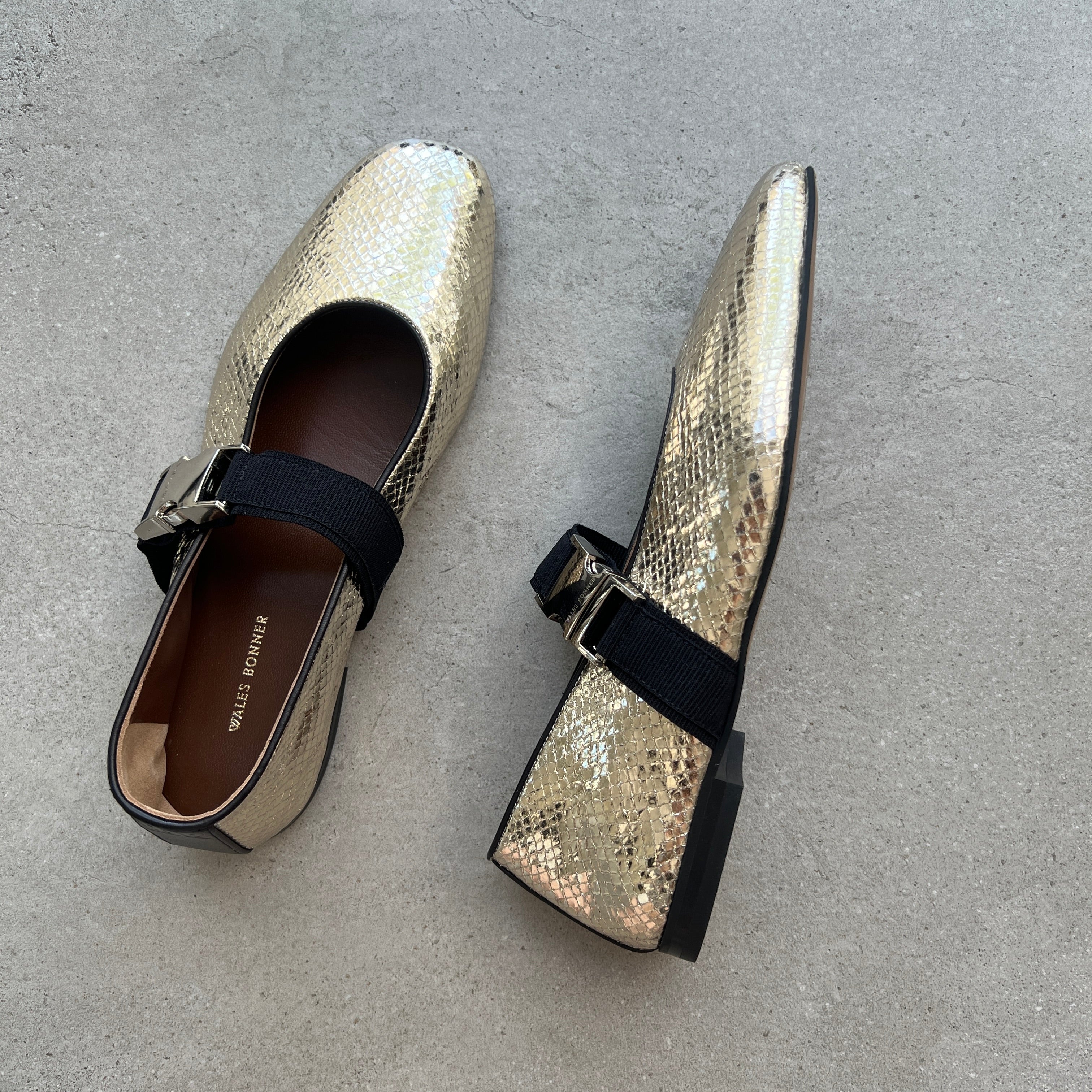 The Glide Slippers shine with gold printed lambskin leather and a silver metal buckle.