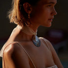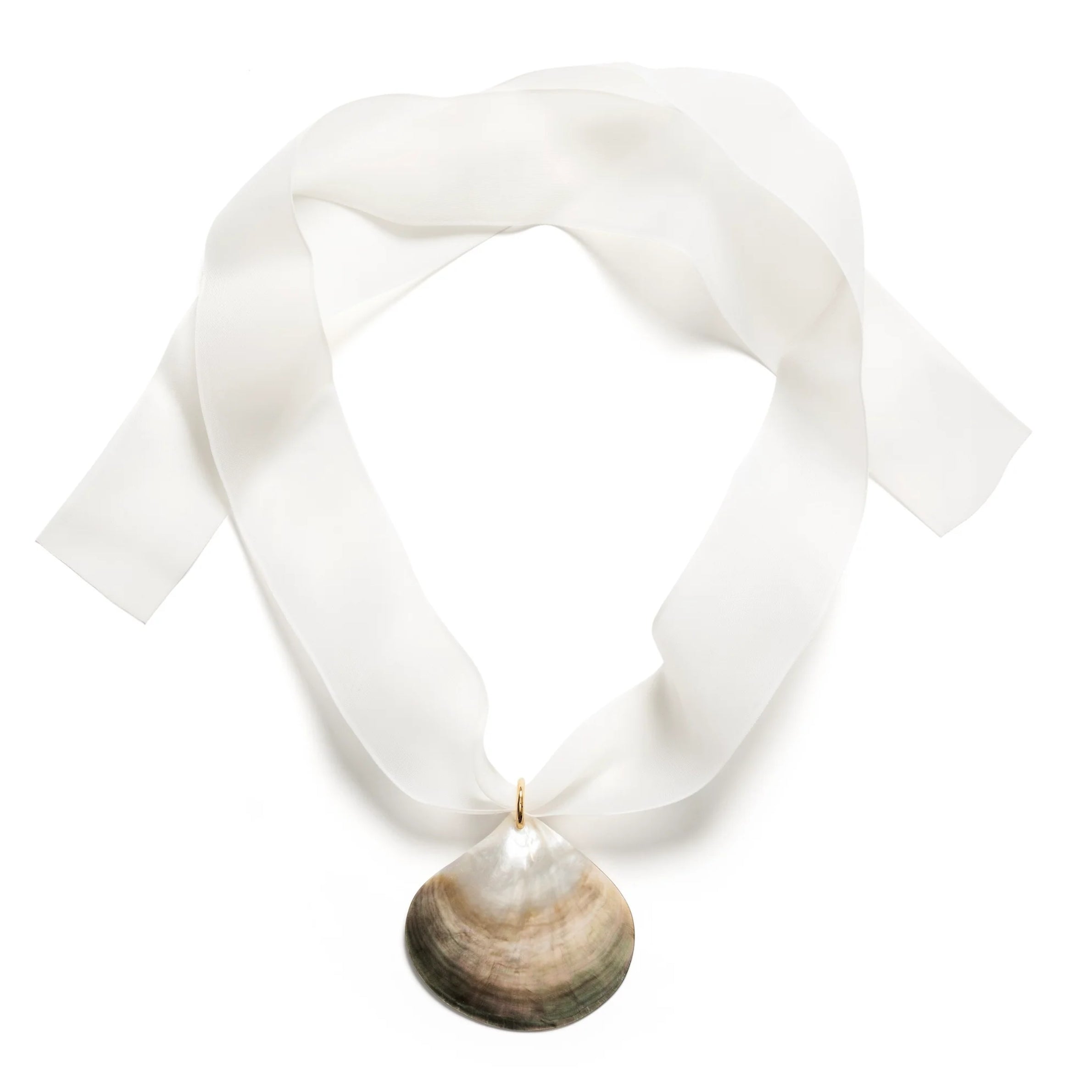 GOLDEN SHELL makes a refined statement — a sculptural shell resting on a soft ecru ribbon, designed to be worn close to the neck as a choker. Paired with a chunky rolo chain, it invites play and transforms effortlessly from understated elegance to bold expression.