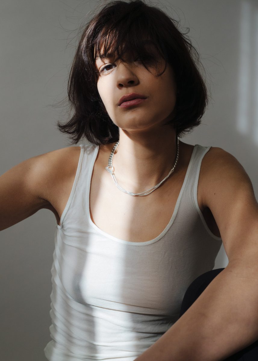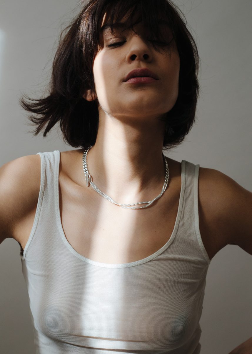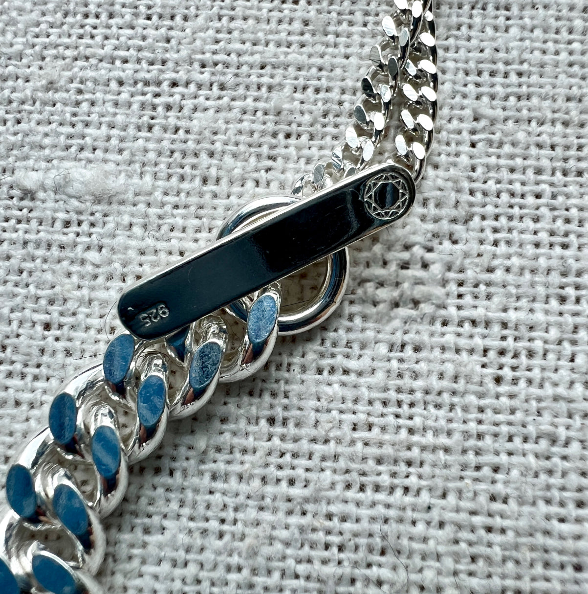 A short silver necklace, made from a bolder and a more narrow curbed chain. Closes with a toggle.