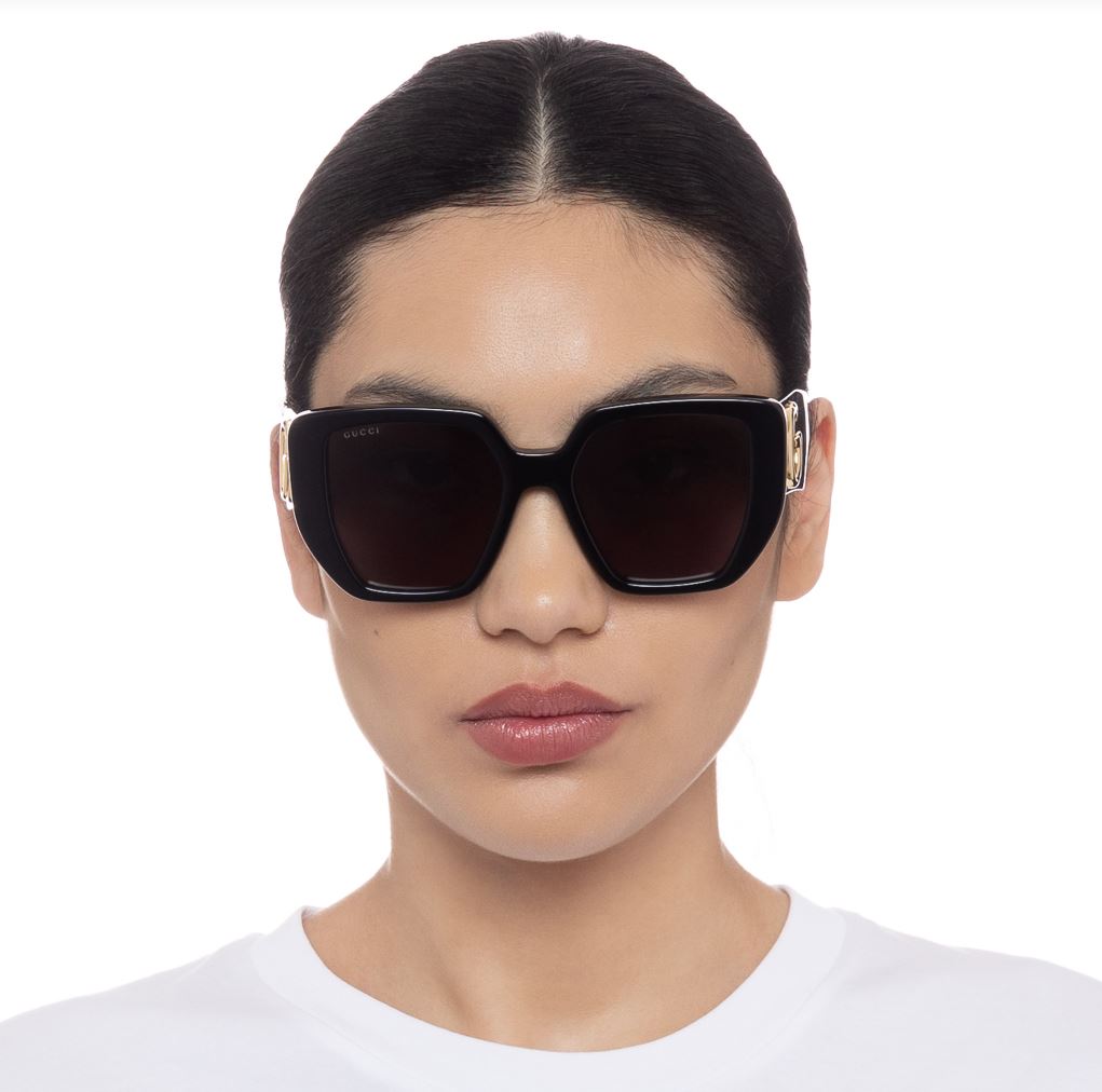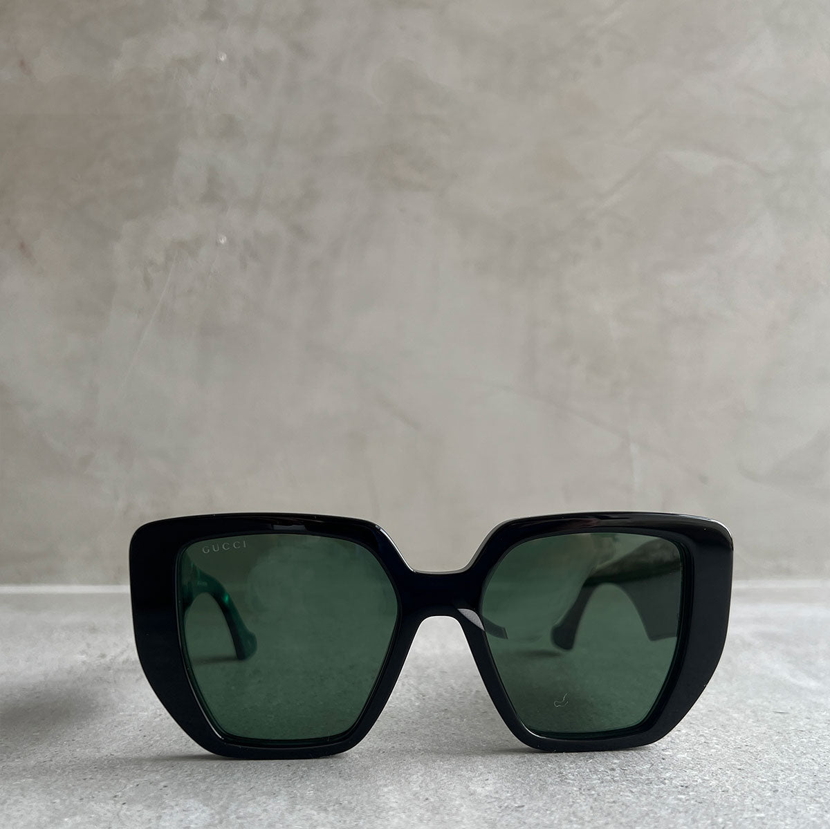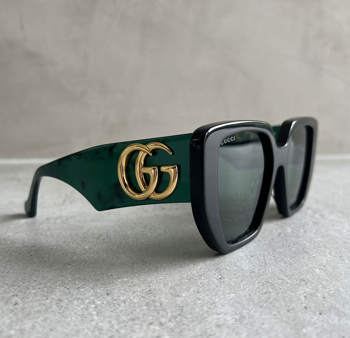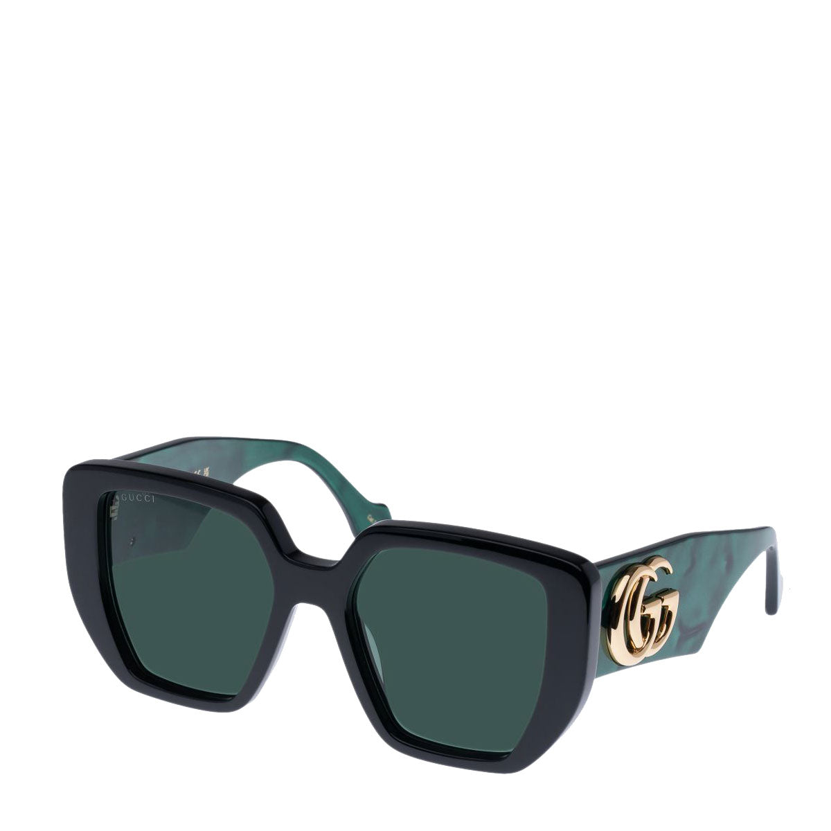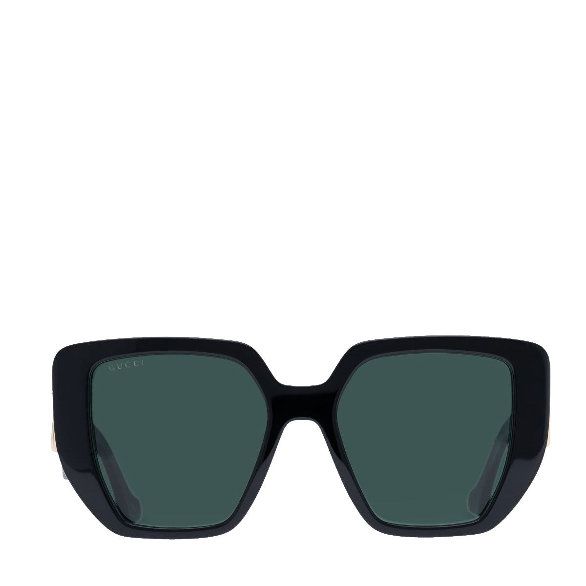 A pair of rectangular-frame sunglasses crafted in black acetate frame and solid green lenses. The distinctive Double G detail was originally inspired by a belt buckle from the 1970s and continues to play a large role in the narrative of Gucci.