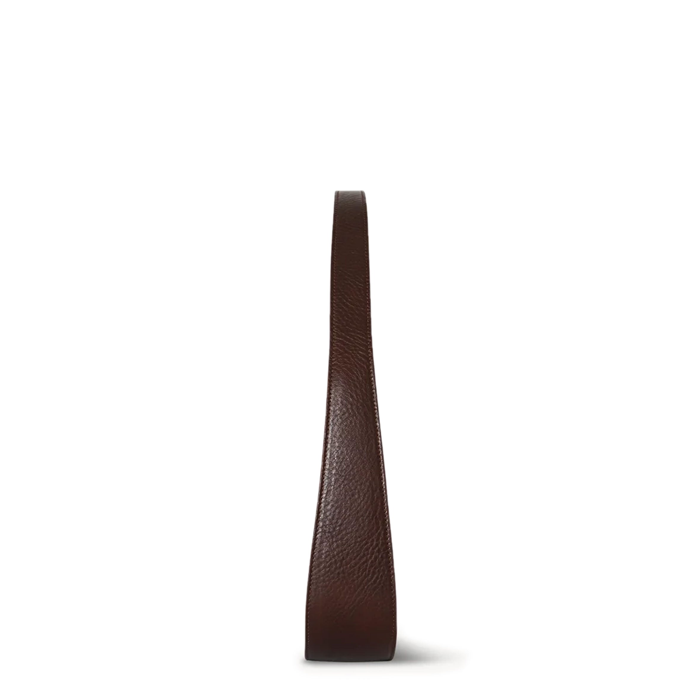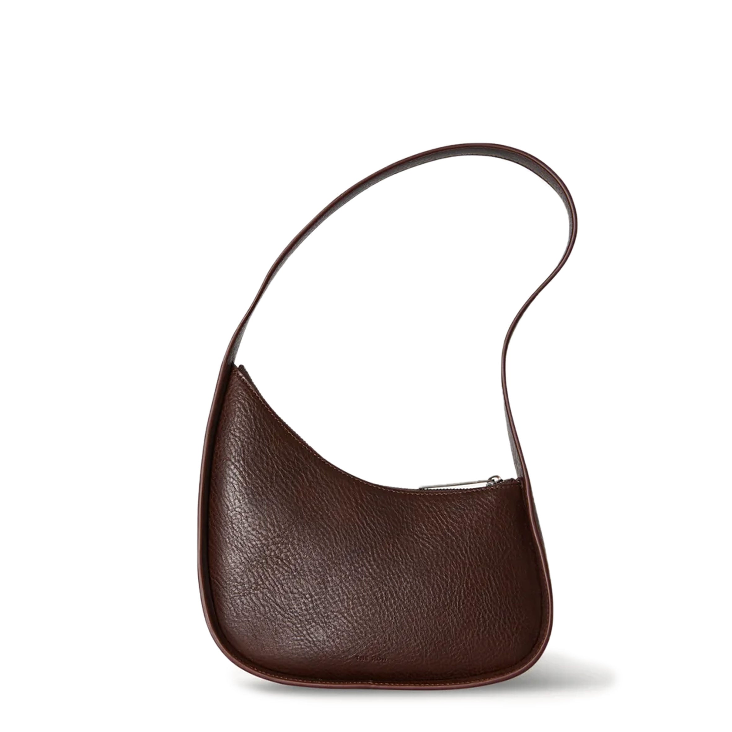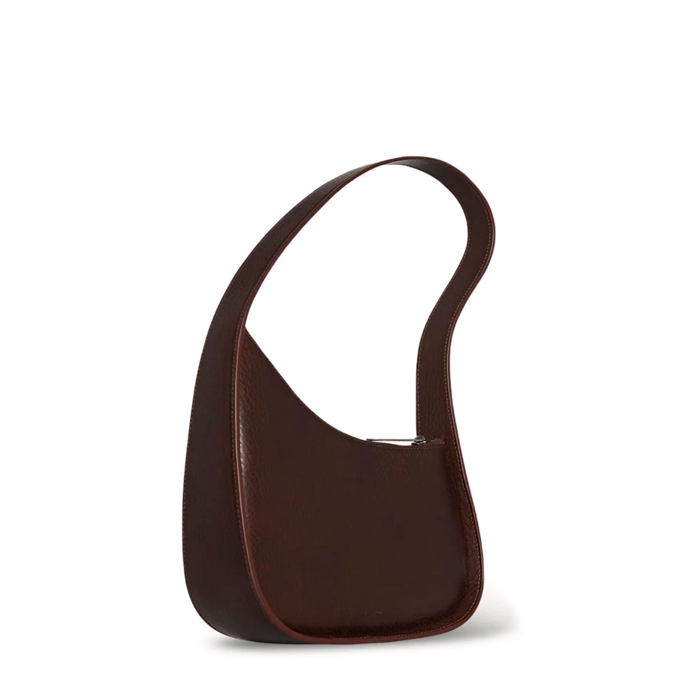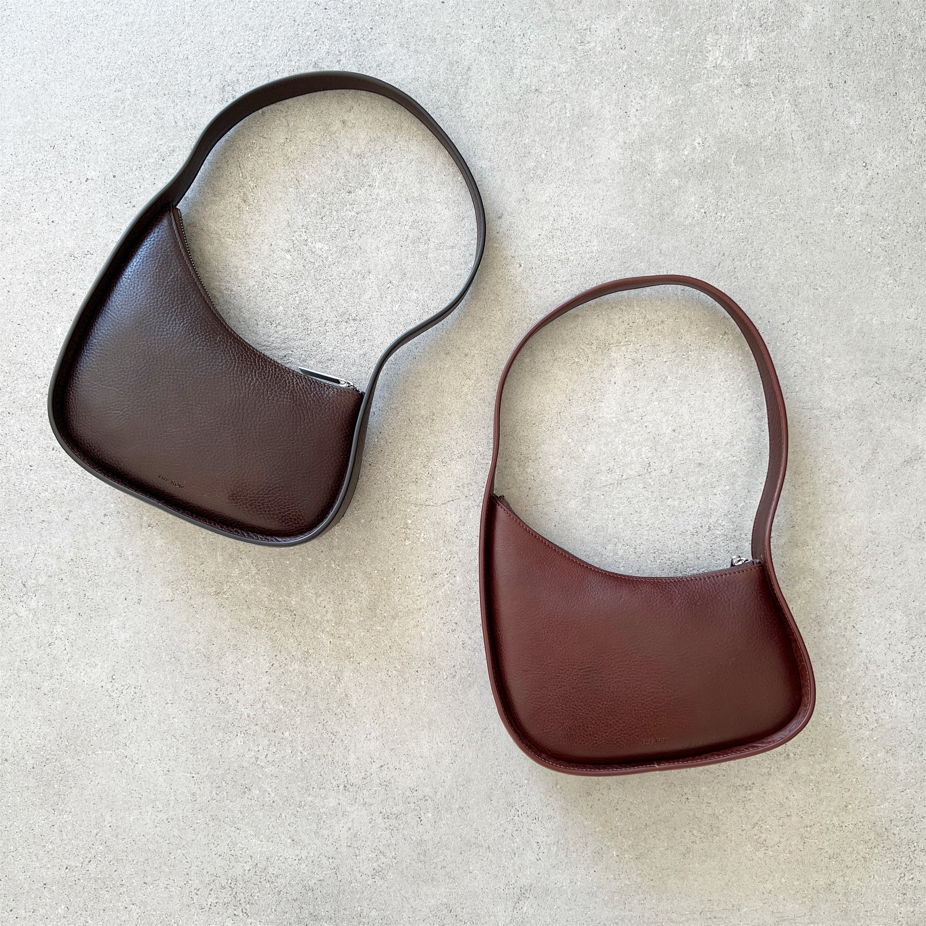 Ergonomic semi-rigid bag in vegetable-grained calfskin leather with flat shoulder strap and curved zipper closure.