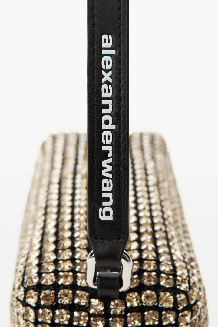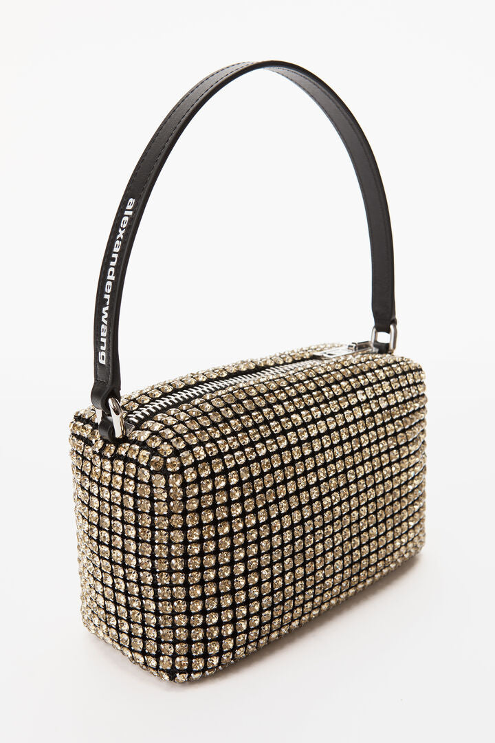 This medium pouch features crystal glass rhinestone embellishments and a statement zipper. The interior lining is made from nylon with an interior card slot. The handle is imprinted with the logo.