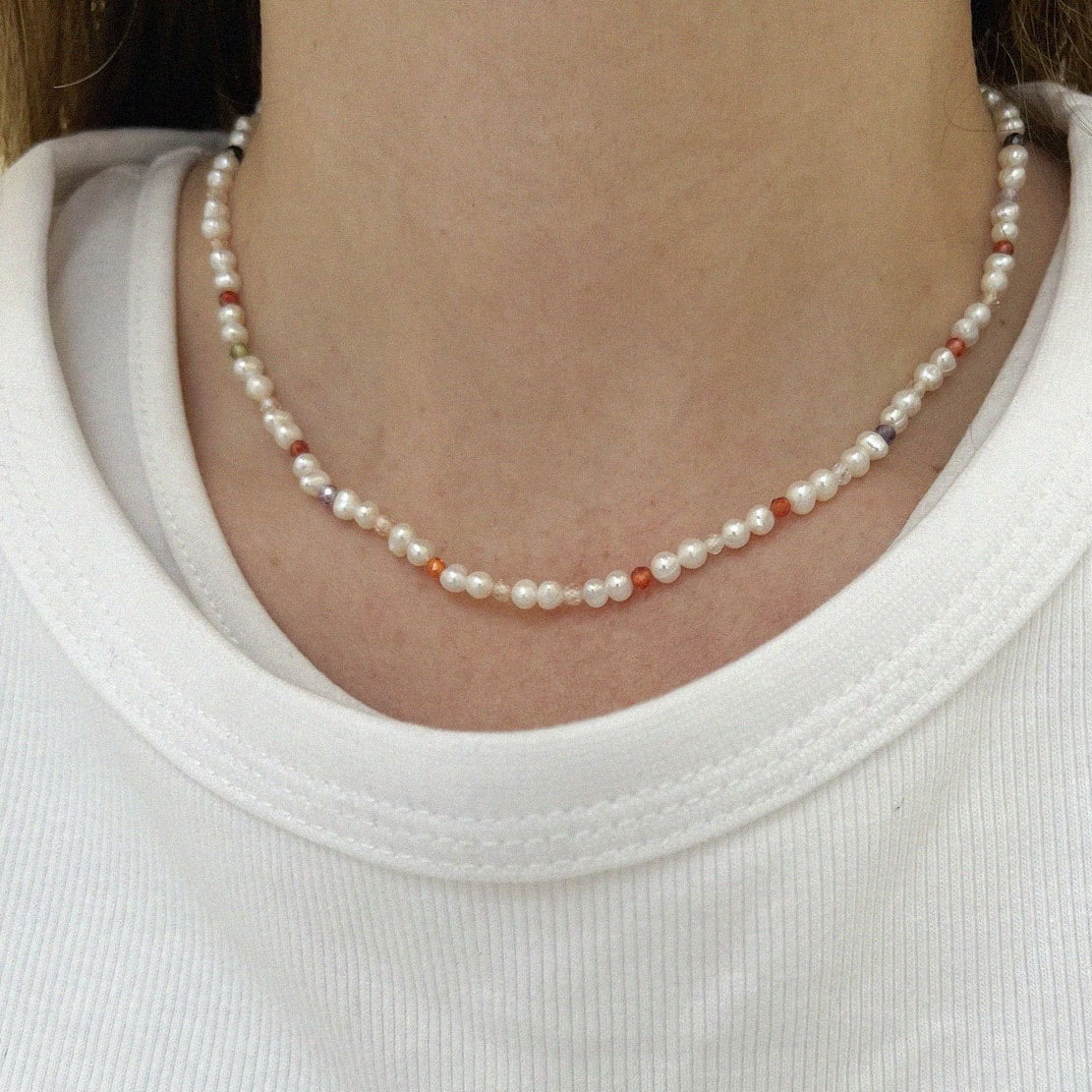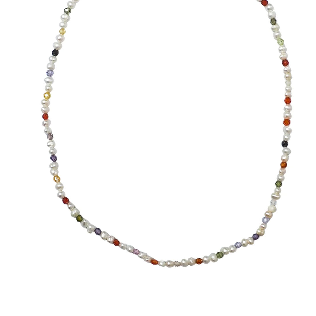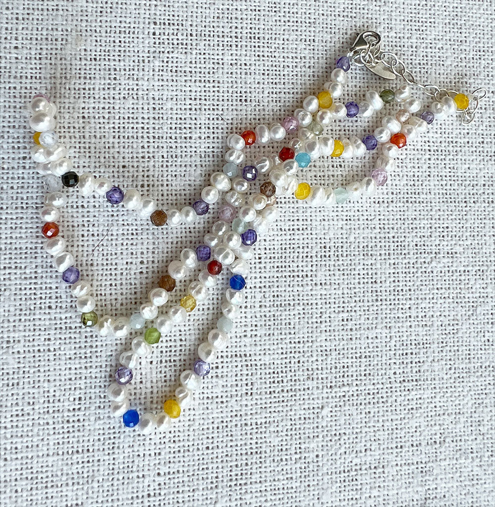 Strung with pearls and zirconia multicolored gemstones, this necklace is pure joy.