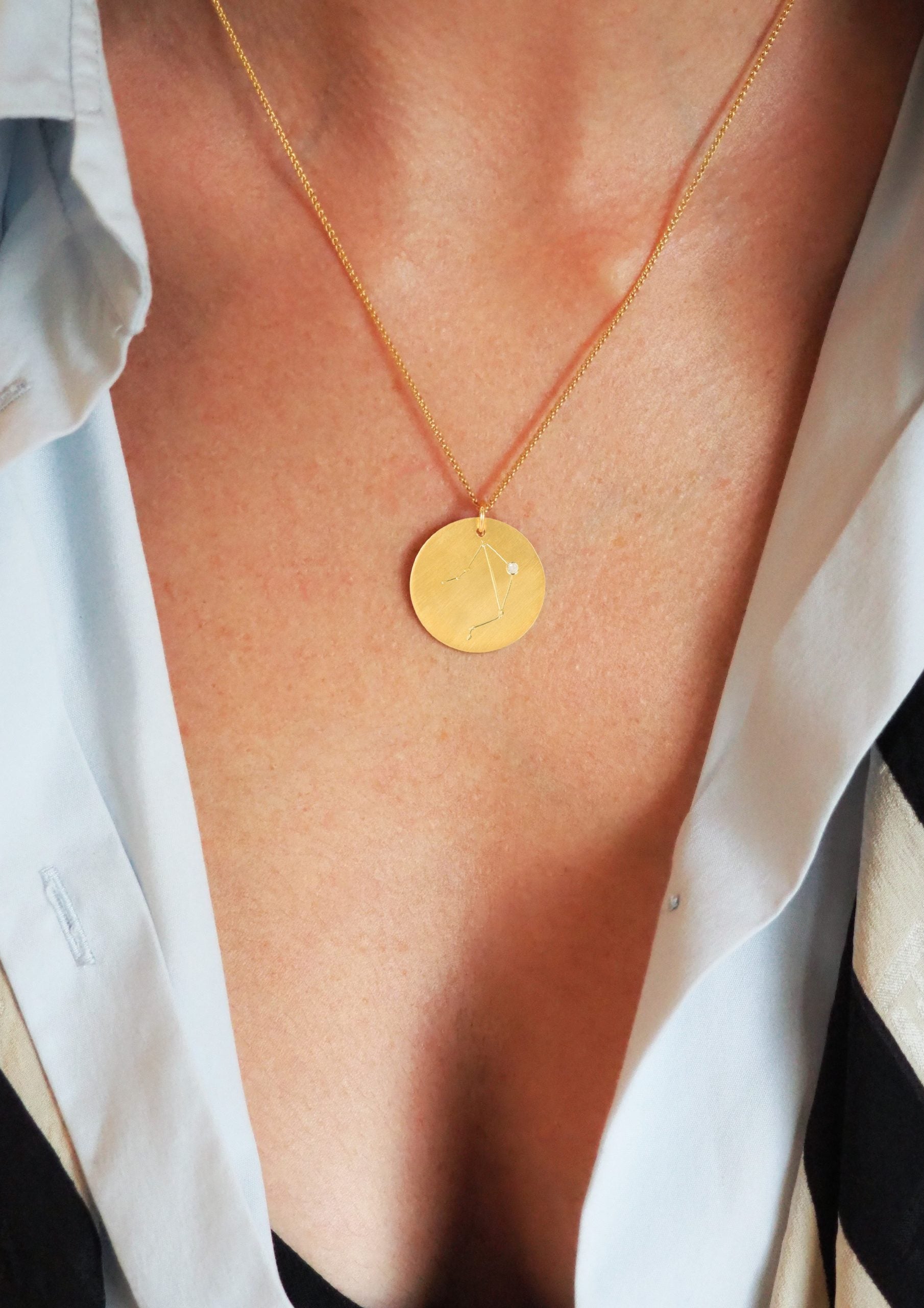 Libra (September 23-October 22): Sociable, charismatic and captivating. This woman believes in justice and balance. Gold plated sterling silver Libra necklace from Hermina Athens featuring gemstone embellishments, a spring-ring fastening, a fine chain and Libra pendant.