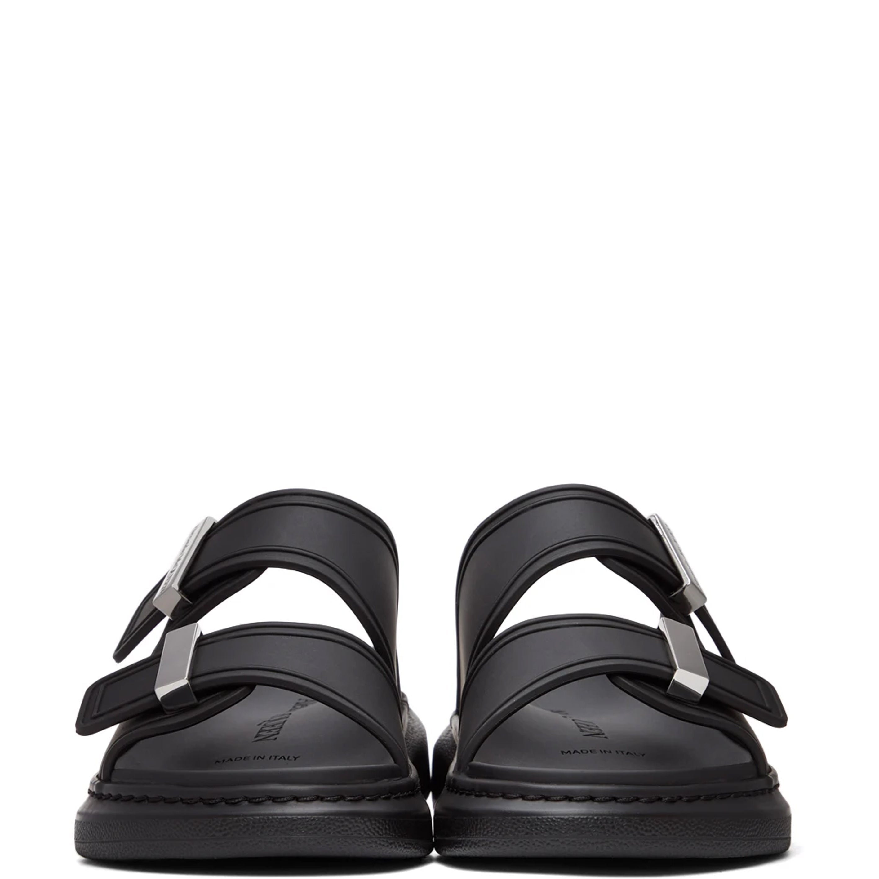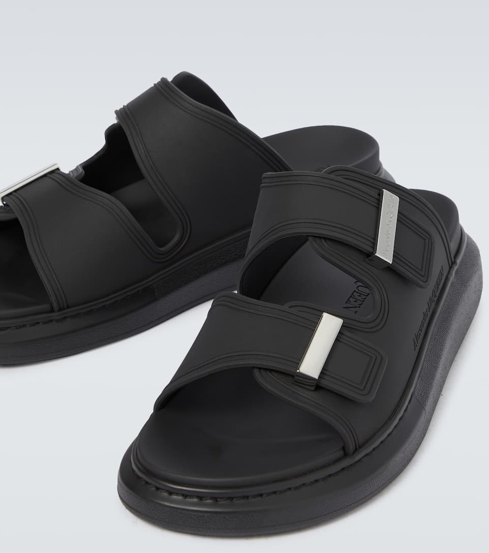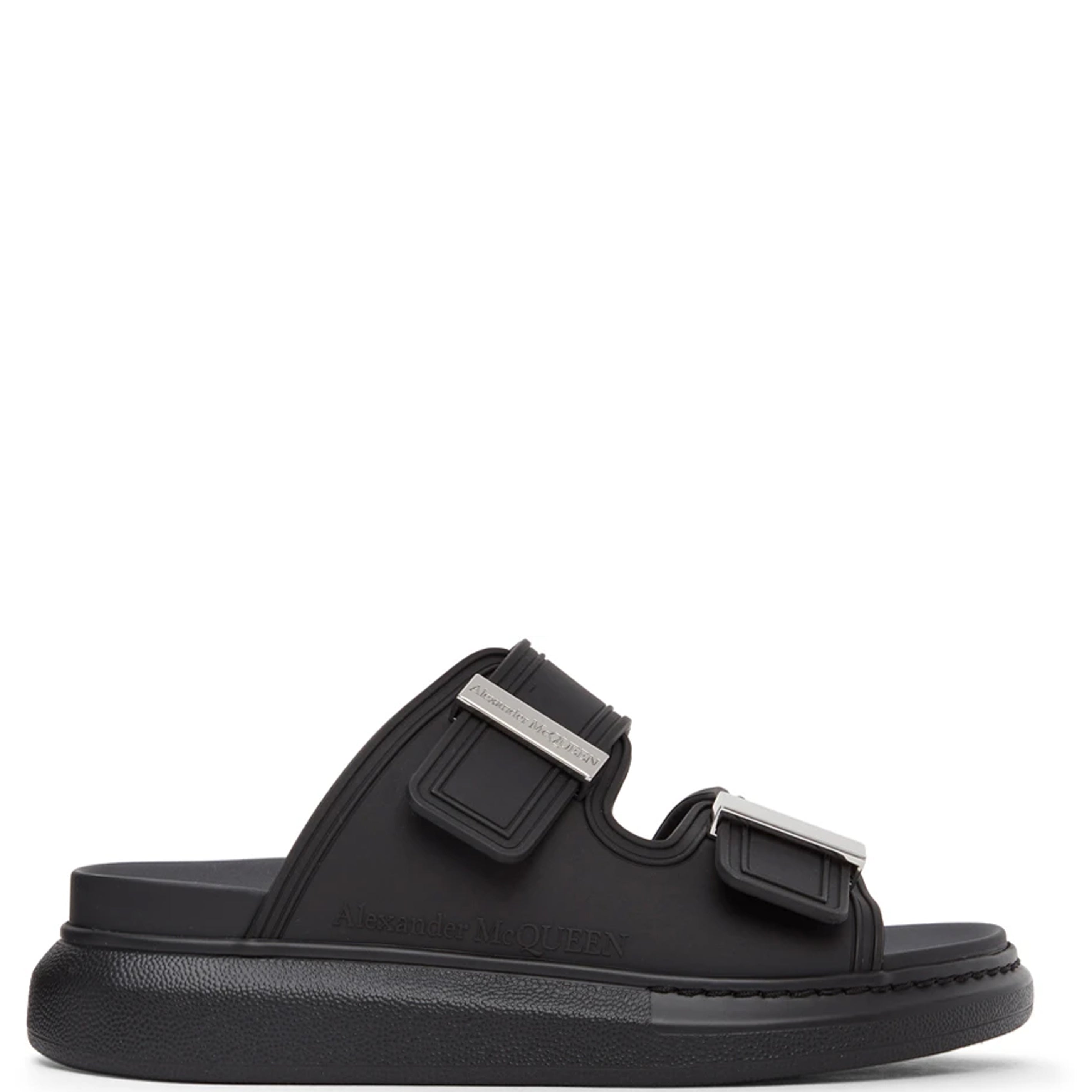 Black rubber slide featuring signature Alexander McQueen silver hardware and an oversized rubber sole. The slide features a round toe silhouette with a metal hardware bar slide and engraved with signature Alexander McQueen.