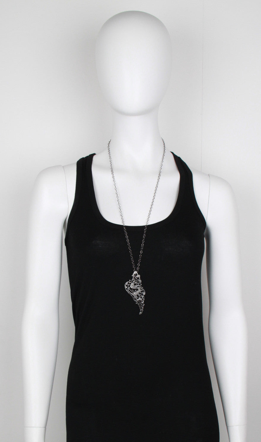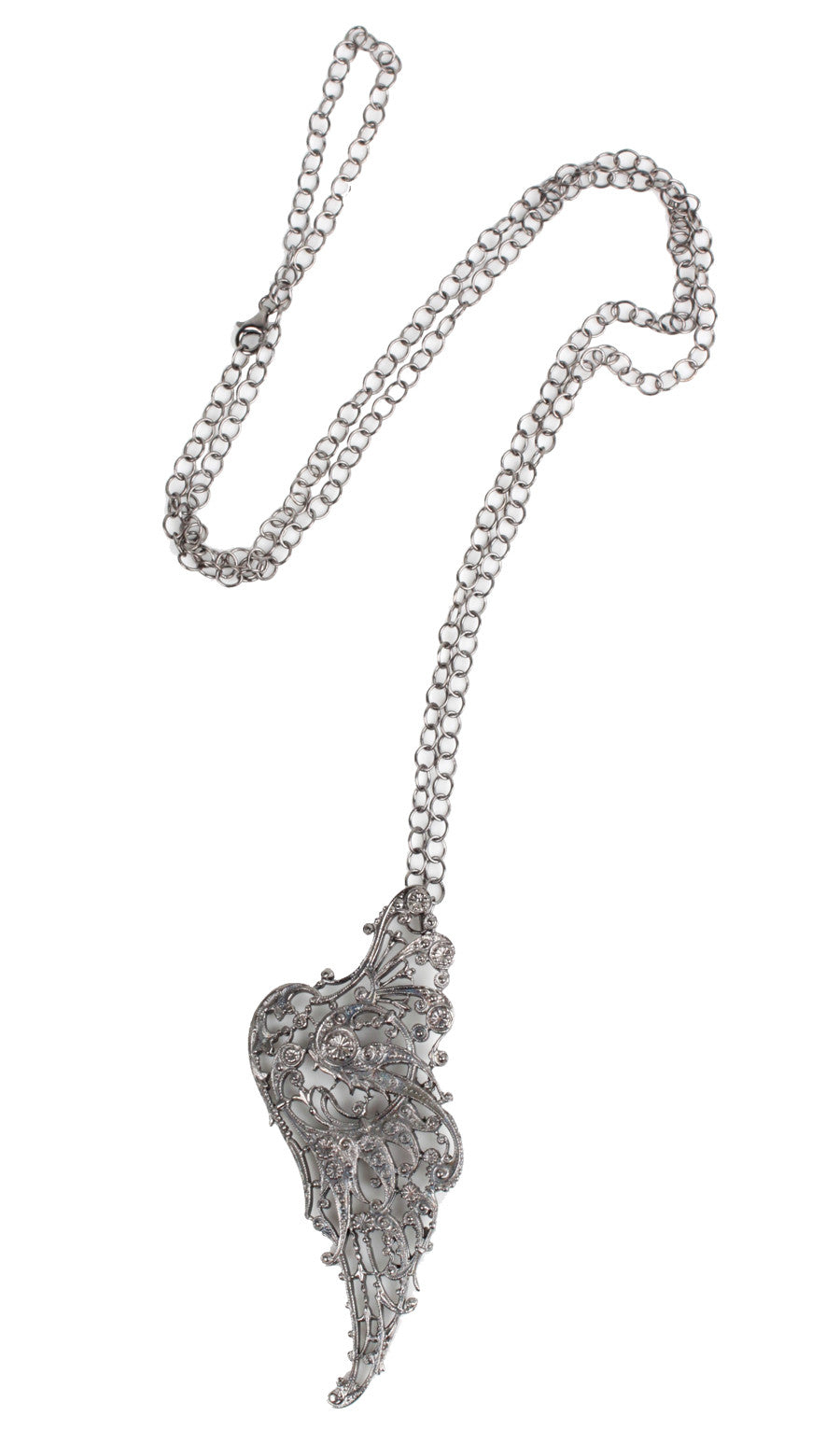 Anoxidized silver necklace with delicately worked lattice wing shape.