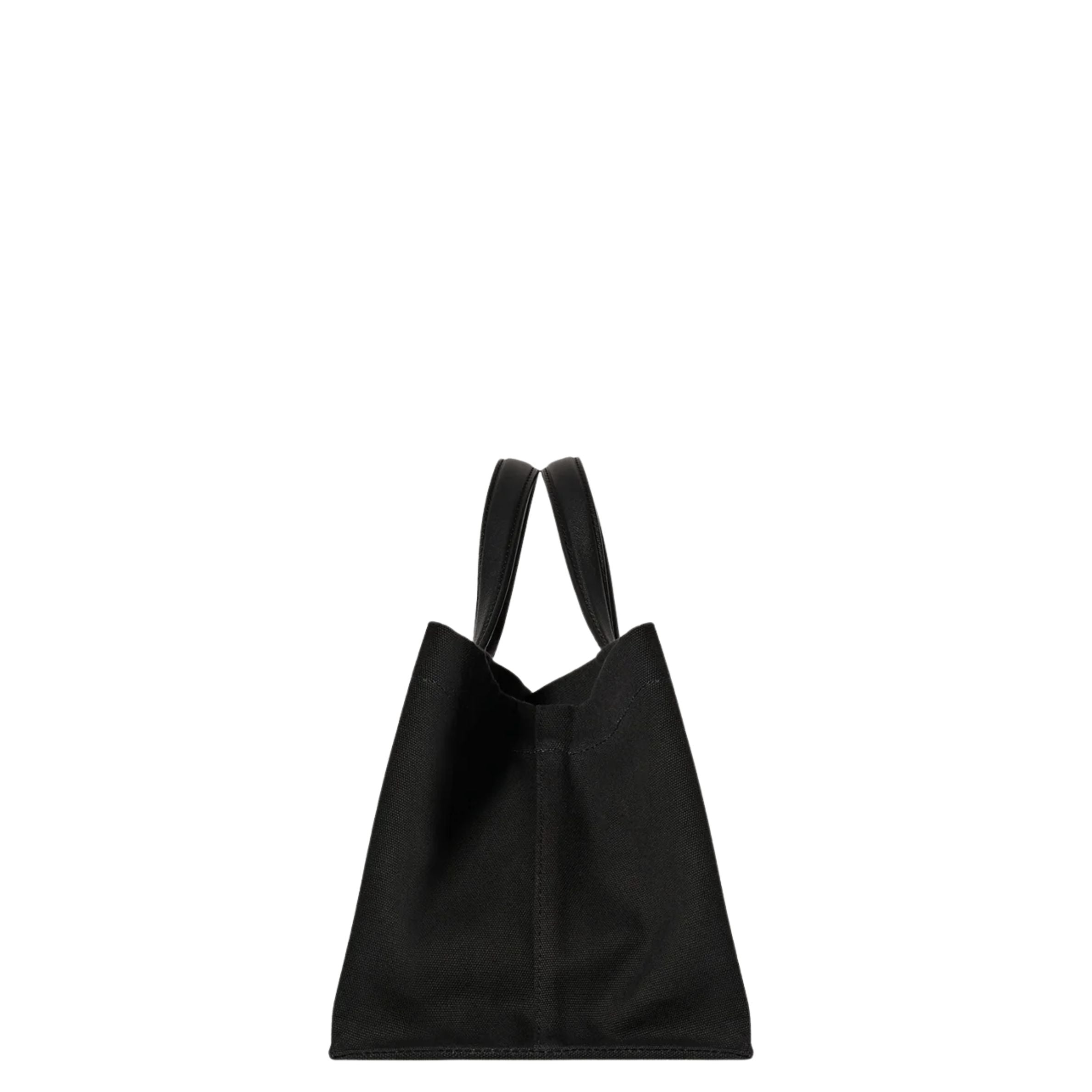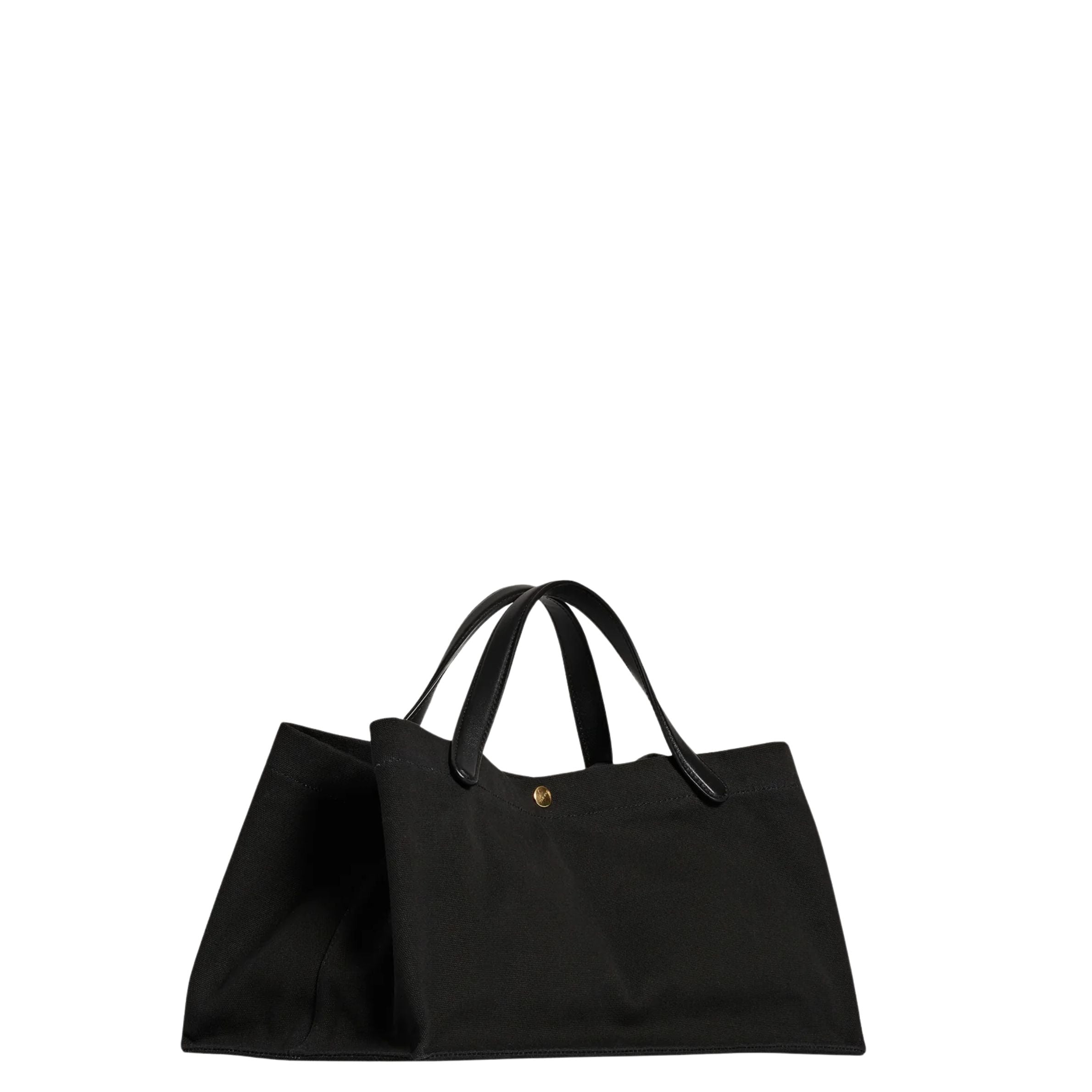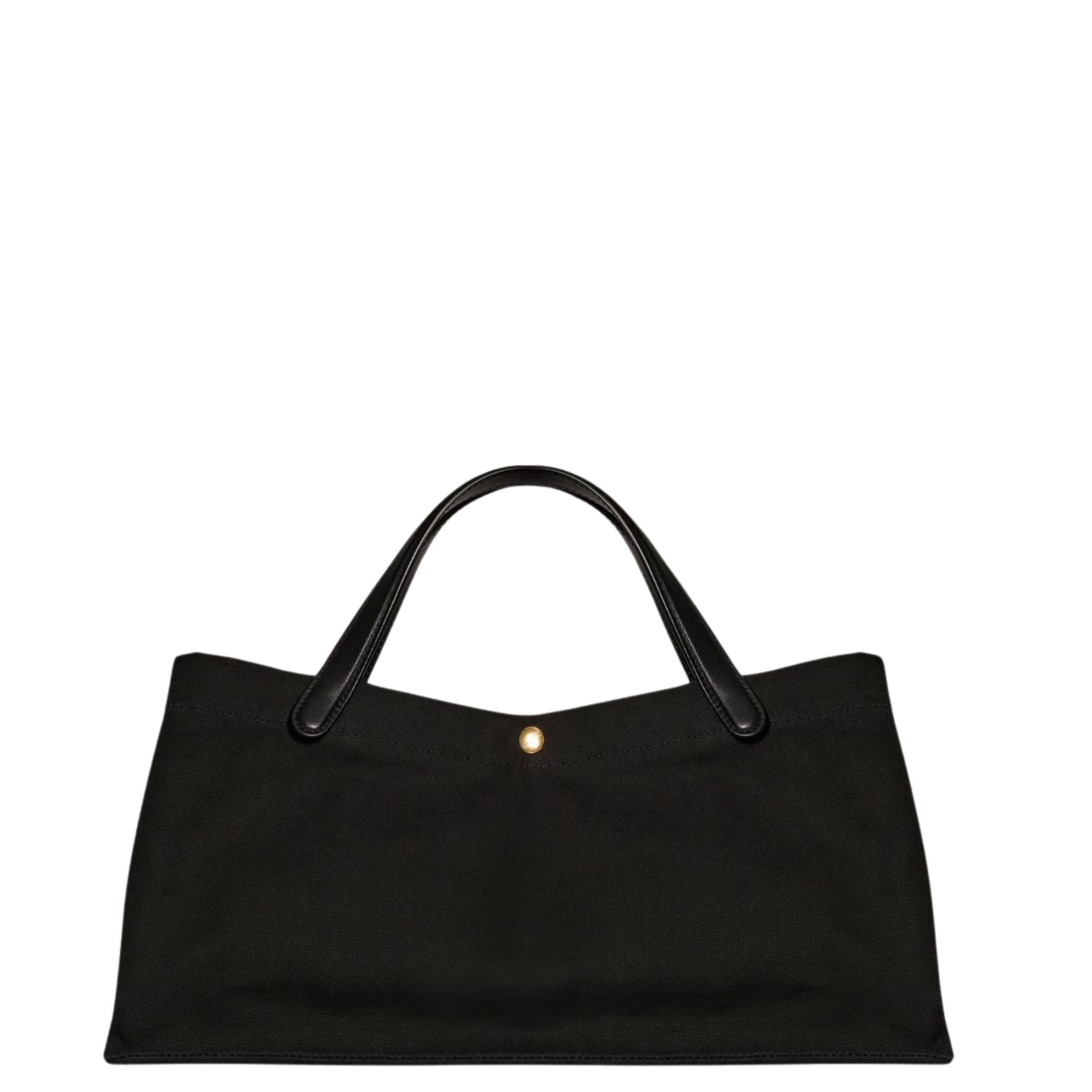 Wide handled tote bag in softly textured cotton twill canvas with two interior patch pockets, leather top handles, and palladium-plated center snap closure.
