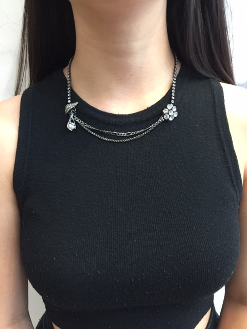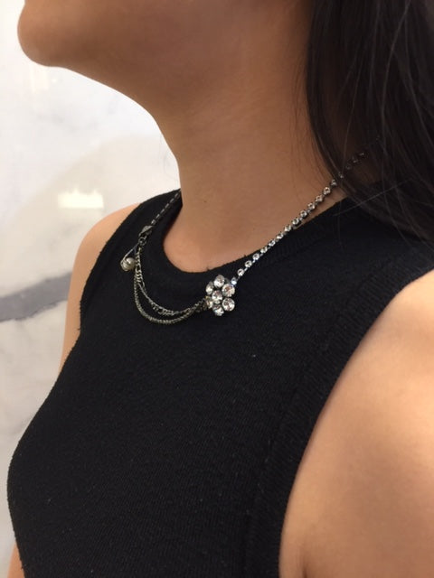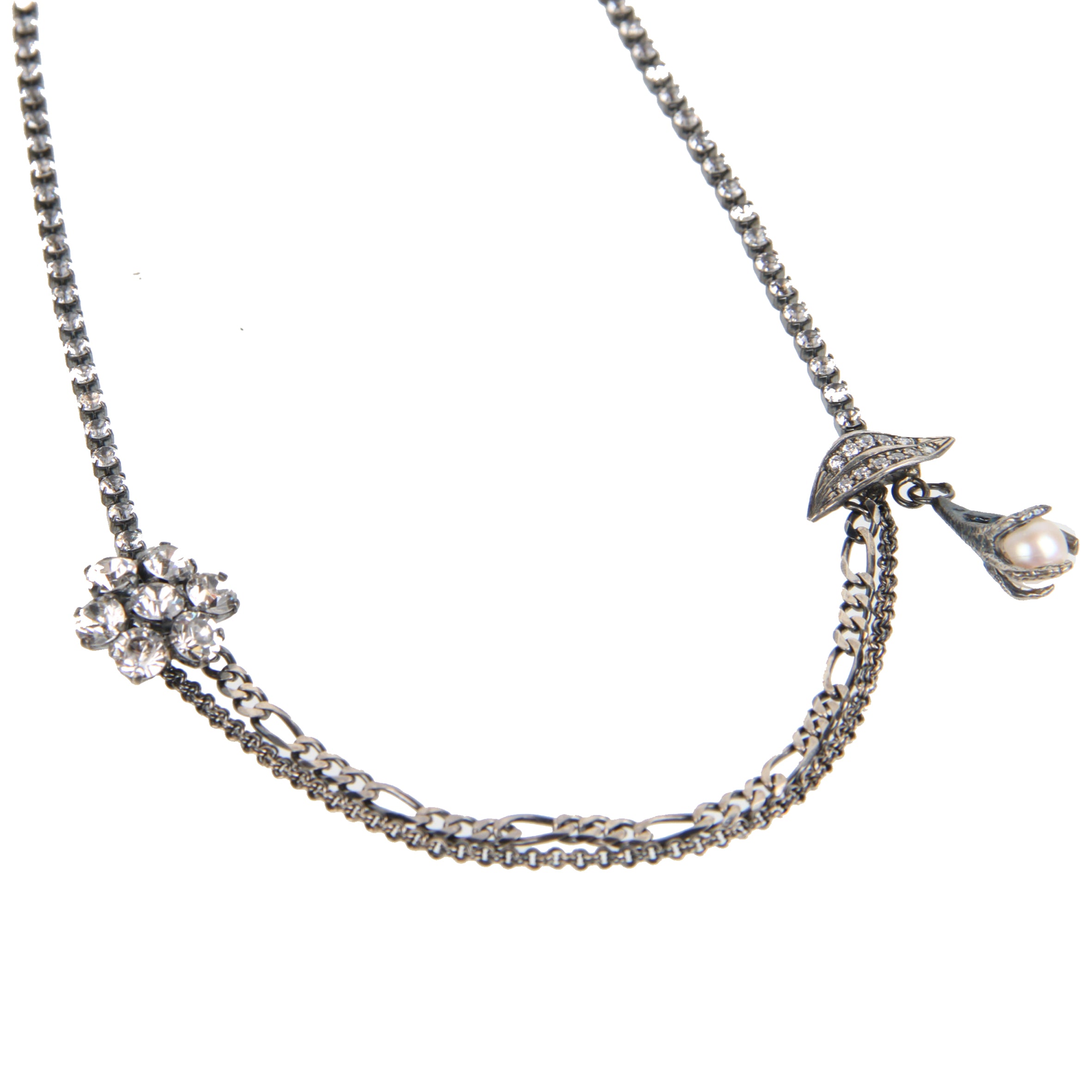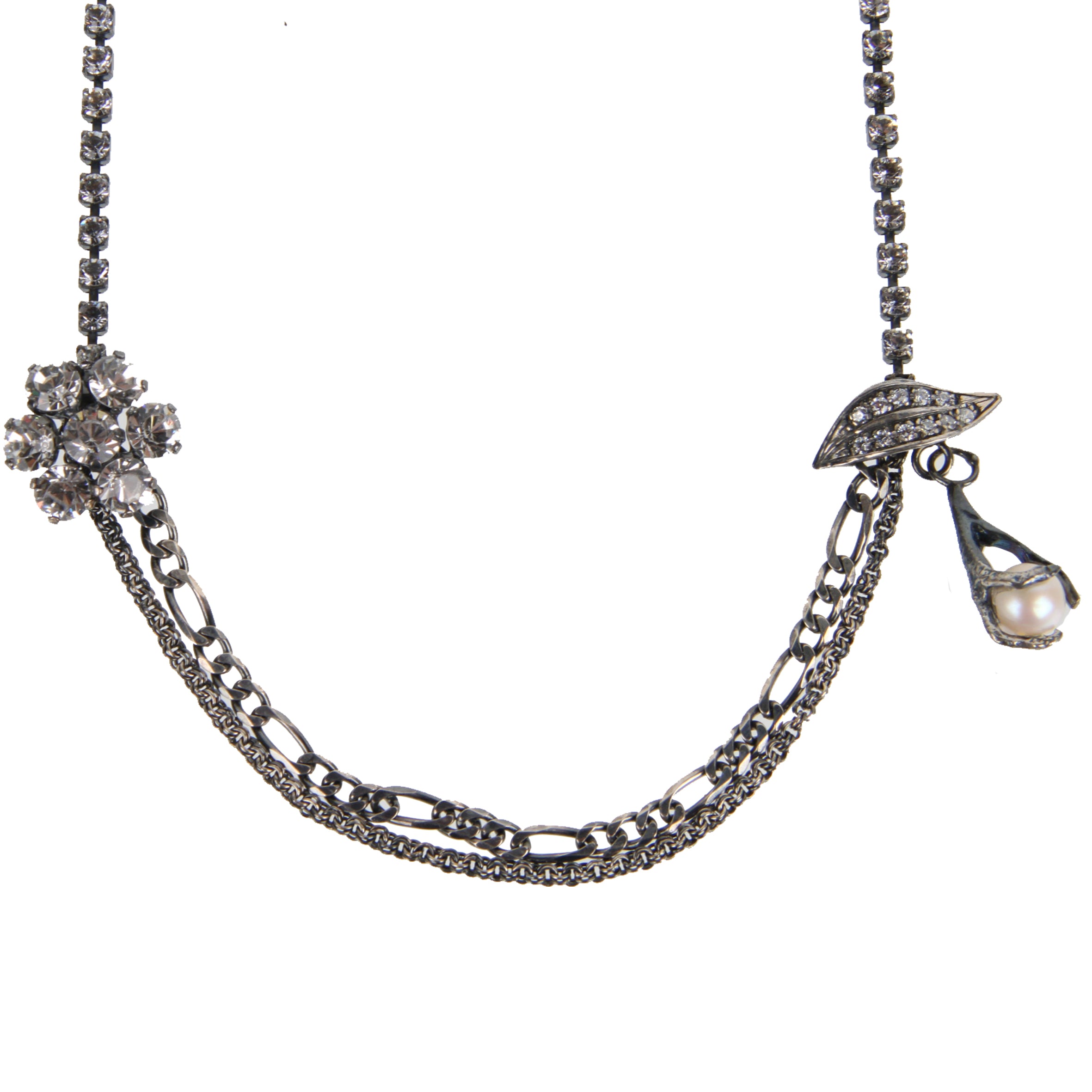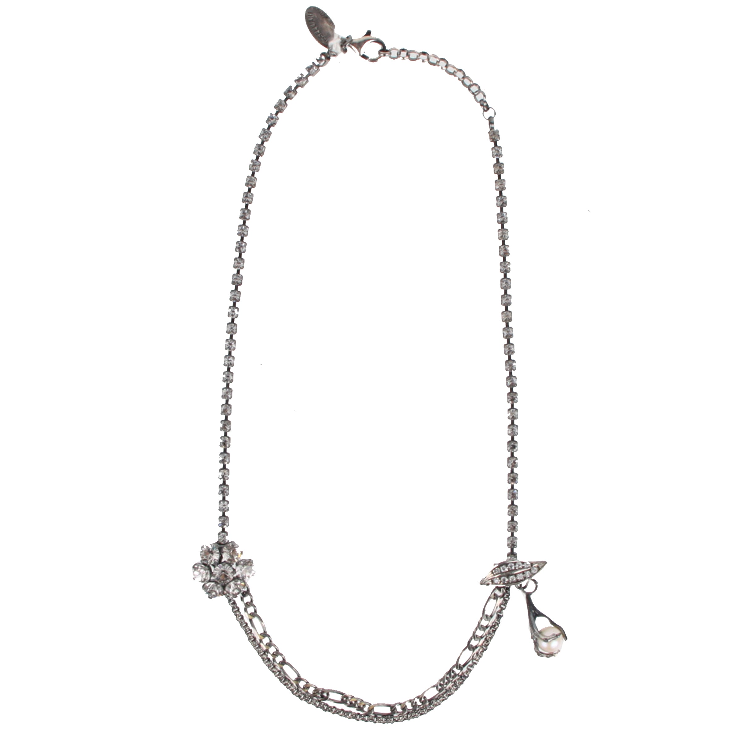 Silver toned necklace with oyster clasp. Crystal flower and leaf detail with claw holding pearl.