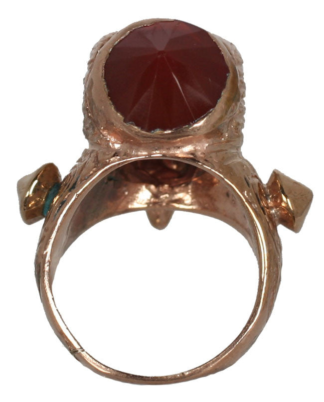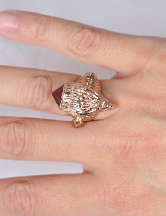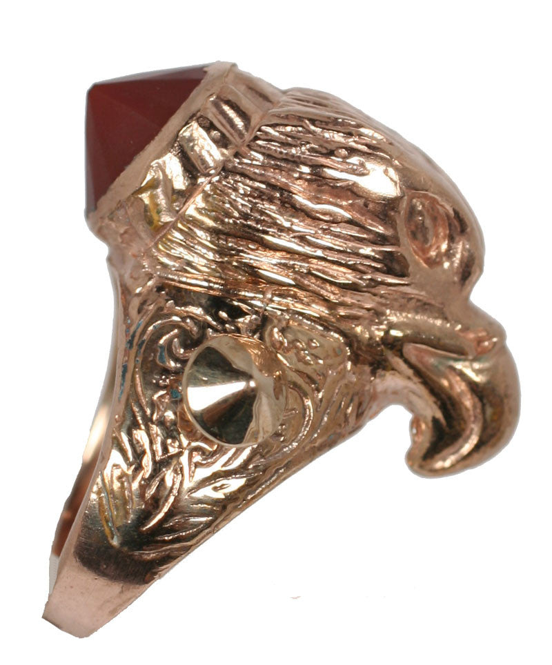 A ring with bronze eagle head inverted red agate. Metal is a rose gold tone.