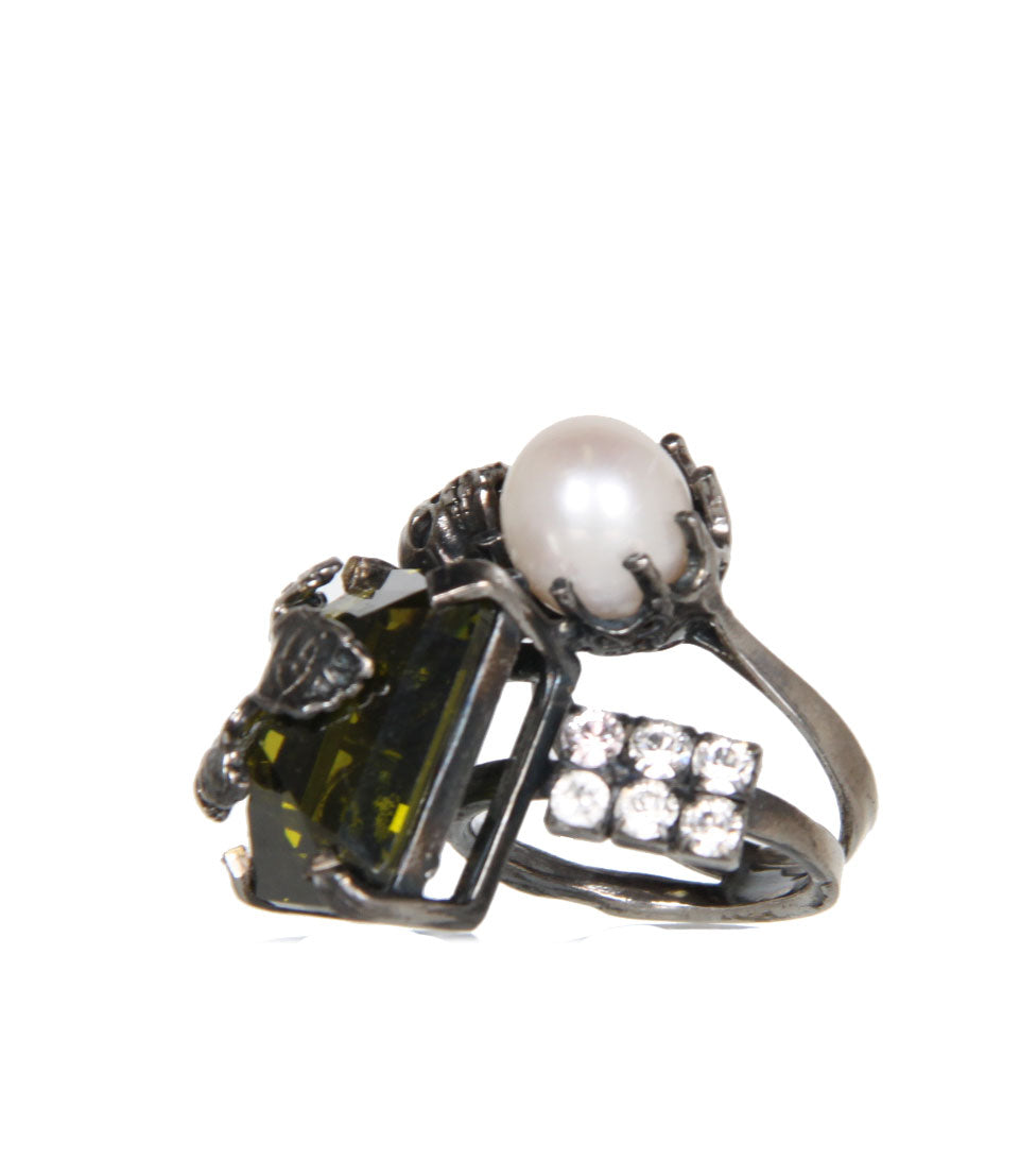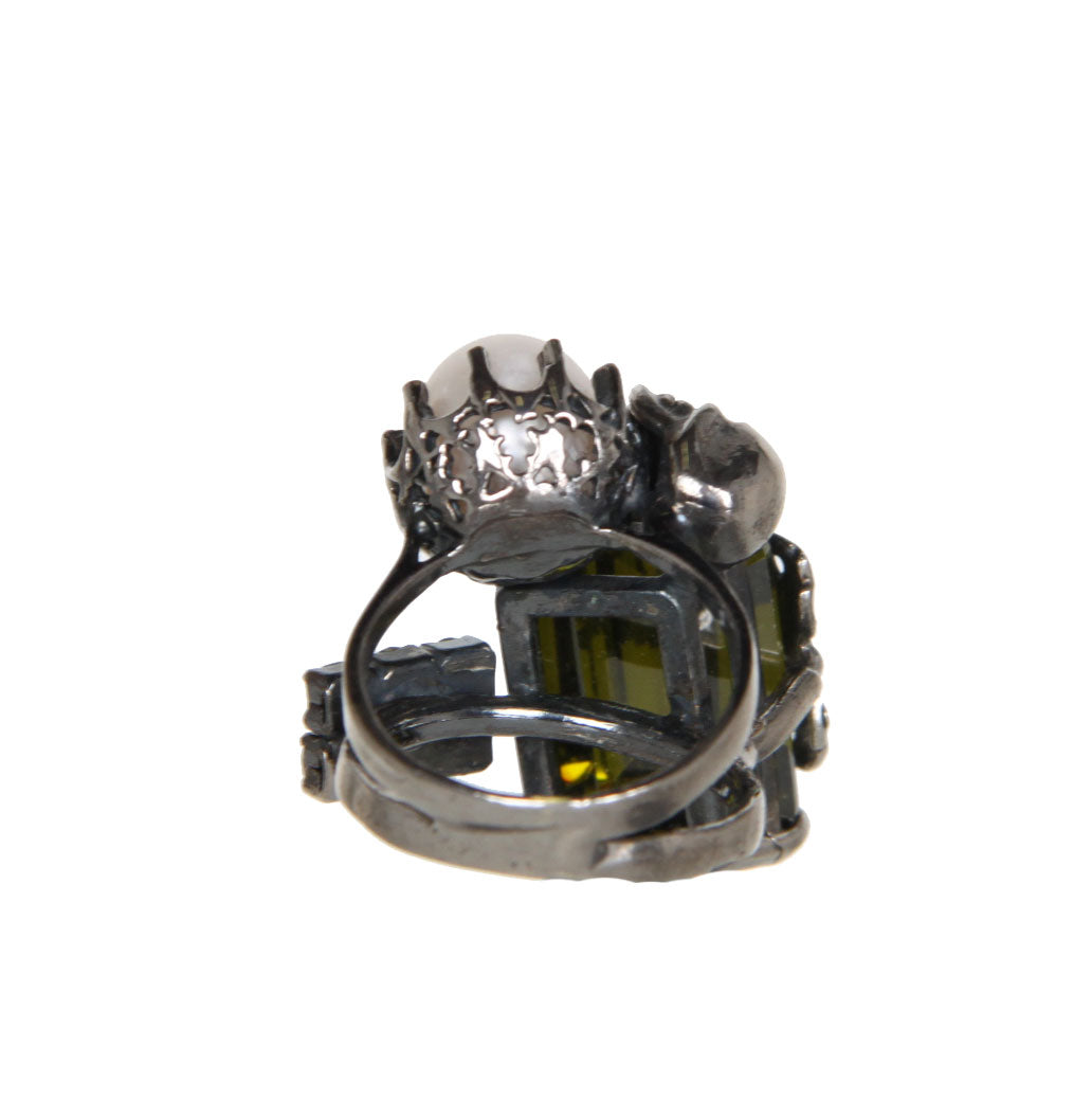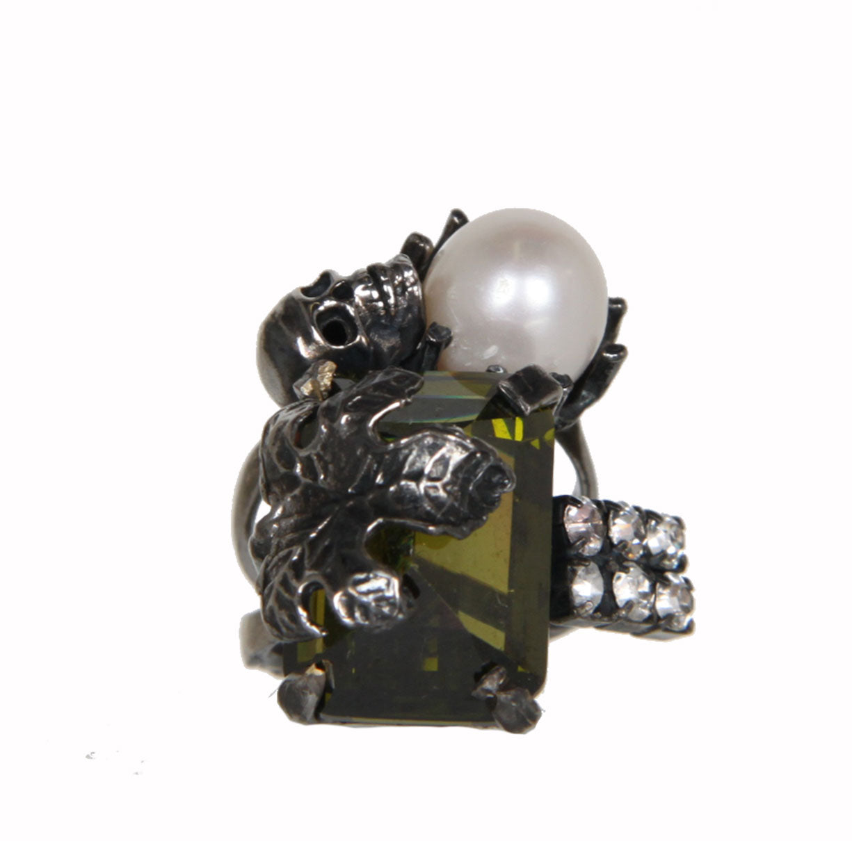 Silver ring with skull and leaf details and zircons and cultured pearl.