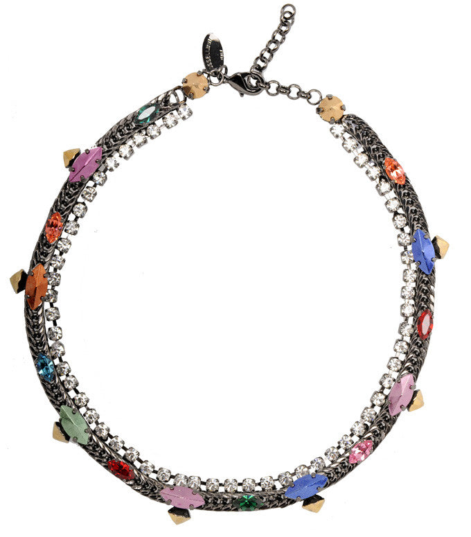 Antique brass necklace. Multi-shaped and colored crystal accents. Lobster clasp closure.
