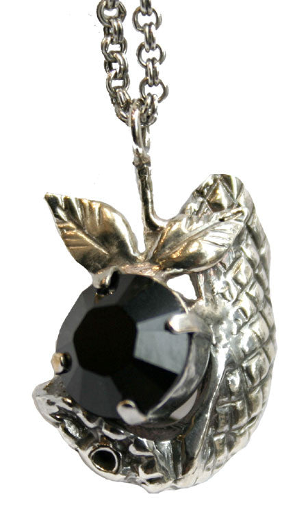 Iosselliani silver serpent pendant necklace with black crystal in antique finish. Lobster clasp closure.